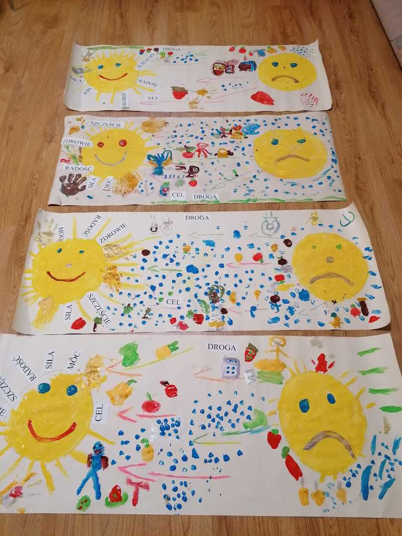 Ostatnim działaniem arteterapeutycznym w ramach projektu było tworzenie przez dzieci map myślowych mających na celu pokazanie możliwości pozytywnych zmian w swoich nawykach żywieniowych. W pracy dzieciom towarzyszyła muzyka relaksacyjna – dźwięki natury. Przedszkolaki wyrażały swoje myśli w formie malowanych rękami map na dużych formatach. Praca w zespołach sprzyjała integracji i wzajemnej wymianie swoich myśli i spostrzeżeń.