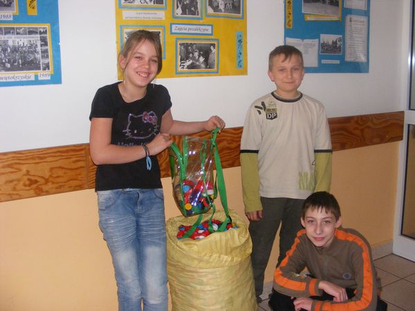 Cały czas na bieżąco dzieci i nauczycielki ze szkoły i z przedszkola zbierają plastikowe zakrętki, a firma recyklingowa wpłaca pieniądze na konto fundacji opiekujących się chorymi dziećmi, dla których zakupiony zostanie sprzęt rehabilitacyjny.