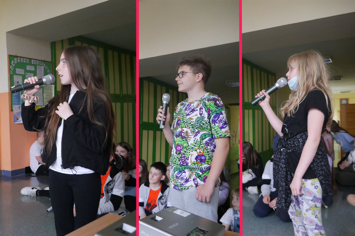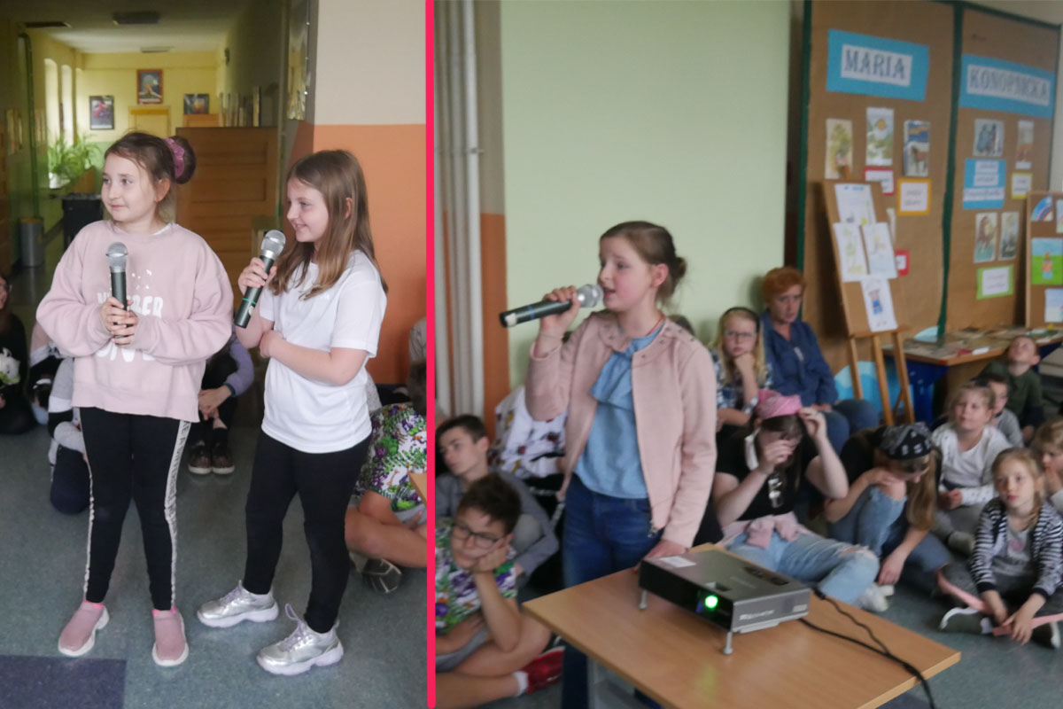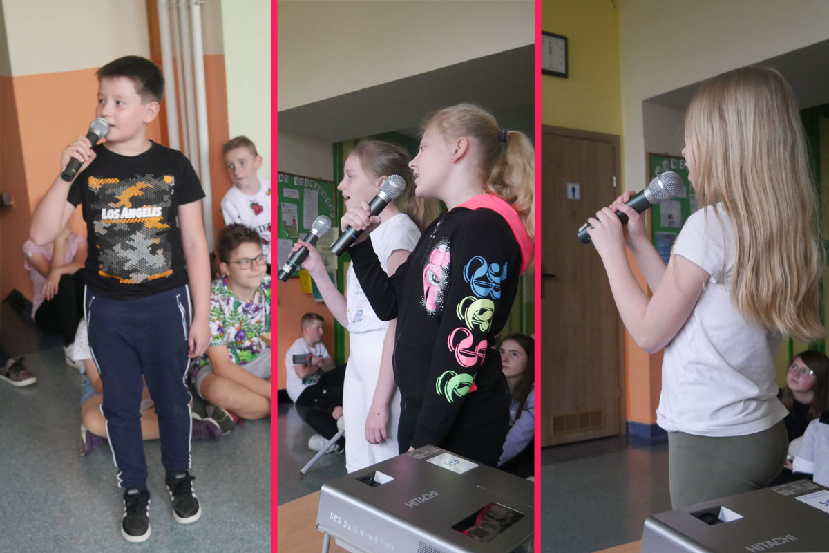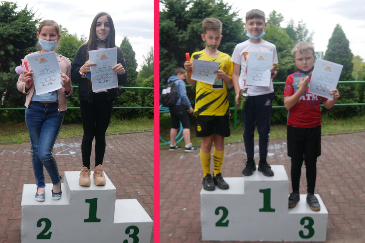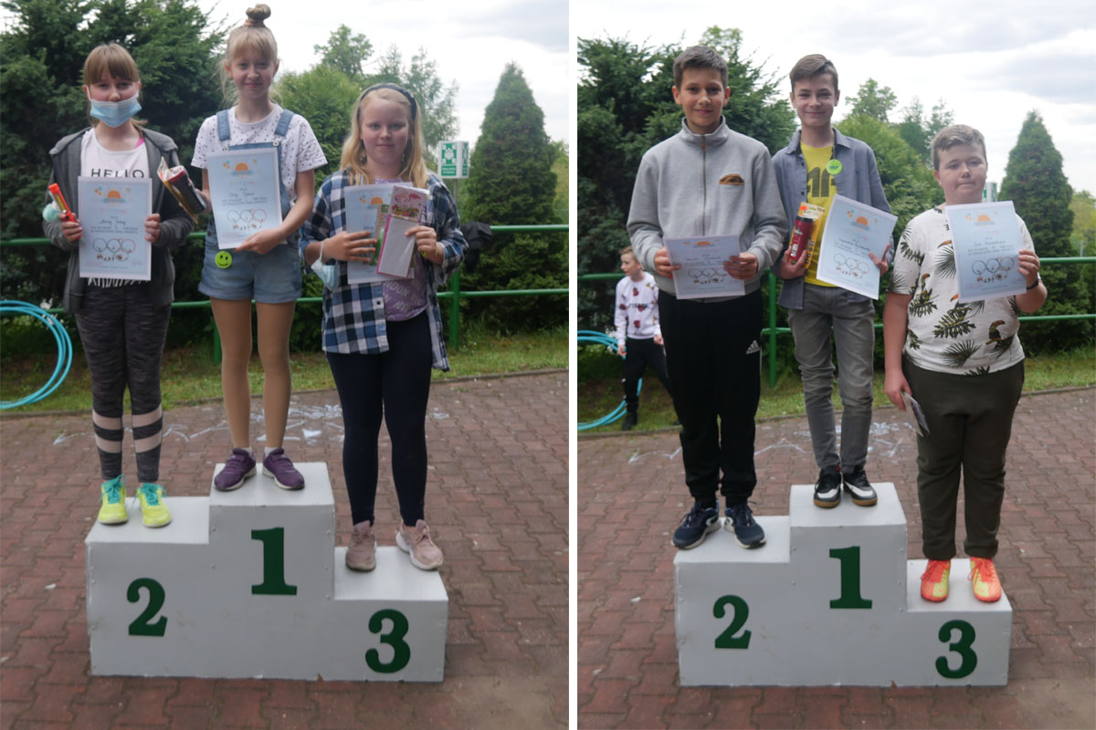 Ponieważ dopisała piękna pogoda wszyscy wyszliśmy na zewnątrz, gdzie rywalizowaliśmy w różnych konkurencjach sportowych. Były biegi, skoki w dal i na skakance, rzuty do kosza i na odległość. Mogliśmy się popisać też swoja zręcznością w zadaniach z różnorodnym przyborem oraz sprawdzić nasz zasób słownictwa wymagającego niezłego refleksu. Całość imprezy uświetniły nam przepiękne pokazy gimnastyczne i taneczne w wykonaniu naszych wspaniałych dziewcząt, które zachwyciły nas wszystkich swoimi umiejętnościami. Po wszystkich zmaganiach ruchowych, po pysznym obiadku i lodach, przyszedł czas na kolejną atrakcję. A były to występy KARAOKE w wykonaniu naszych uczniów. Wystąpiło ich wielu, ale do śpiewania znanych i popularnych kawałków chętnie przyłączyli się wszyscy. Zabawa była przednia. A na koniec jeszcze niespodzianka. Pani Wójt w asyście przesympatycznego Bobra przybyła tuż przed rozdaniem nagród ze słodkim poczęstunkiem. Potem jeszcze odkurzyliśmy podium, wyłoniliśmy naszych medalistów i wręczyliśmy zasłużone nagrody. Porobiliśmy mnóstwo fajnych fotek, filmików i w dobrych nastrojach zakończyliśmy ten cudowny dzień.