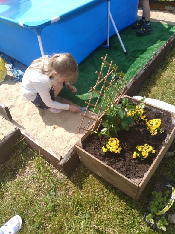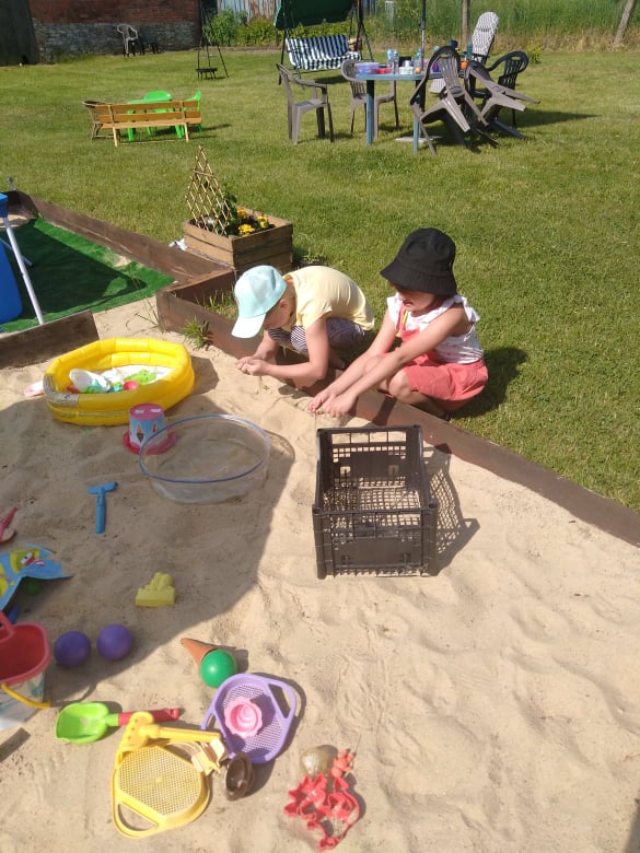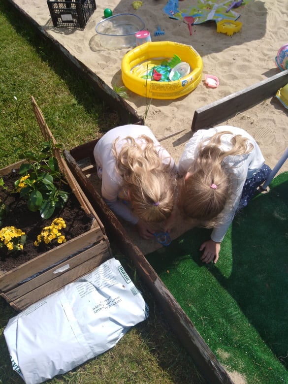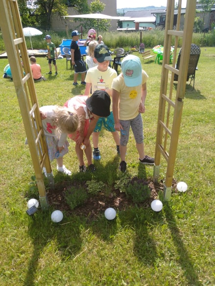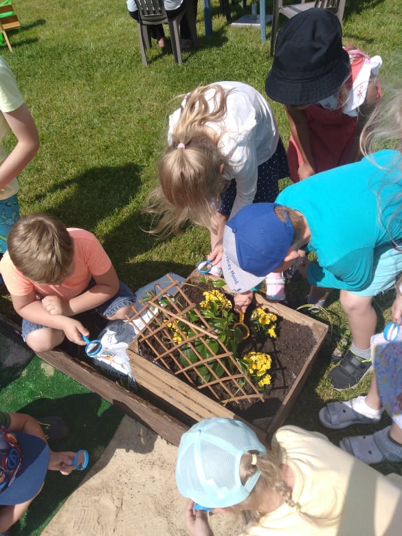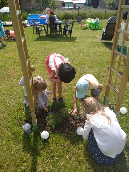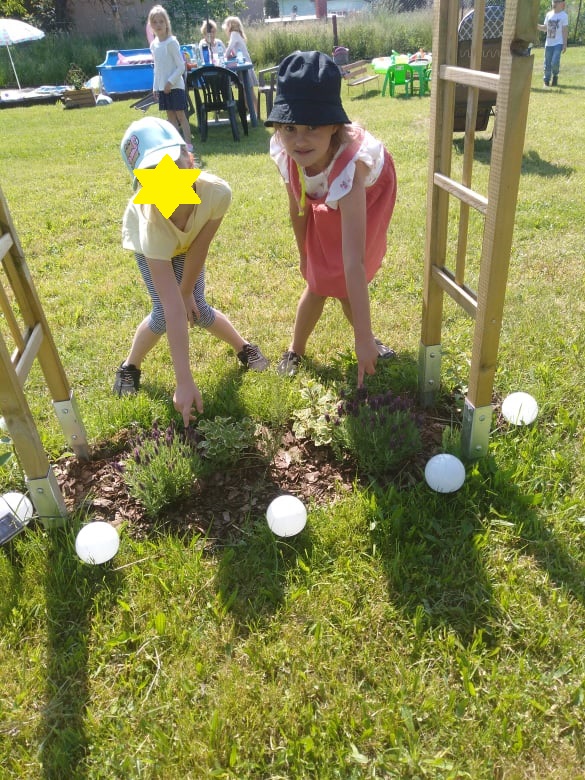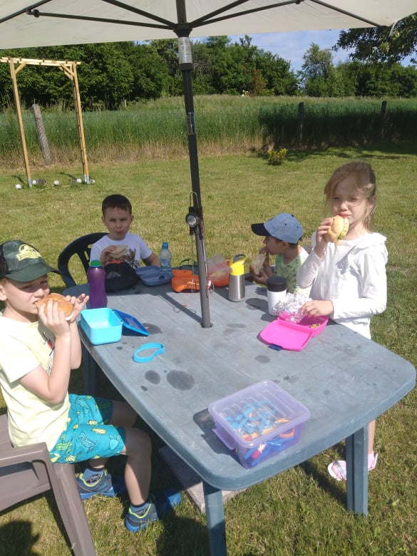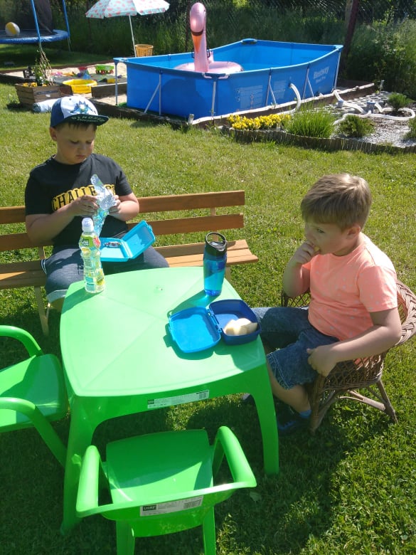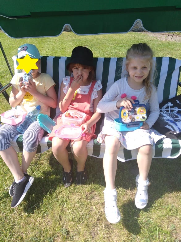 Pobyt w ogrodzie był również okazją do zabaw i podejmowania różnych form aktywności fizycznej. Najmilszym momentem dnia było wspólne śniadanie w otoczeniu przyrody w ogrodzie u pani Basi.