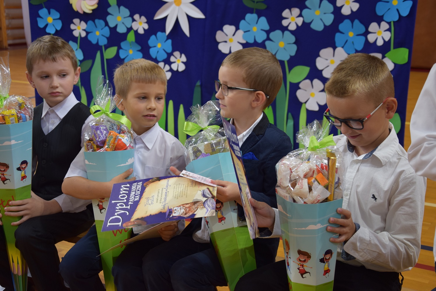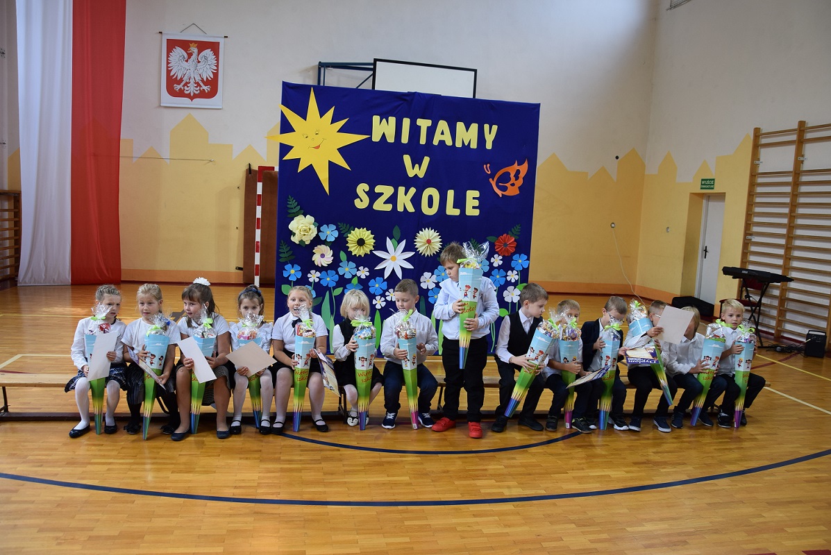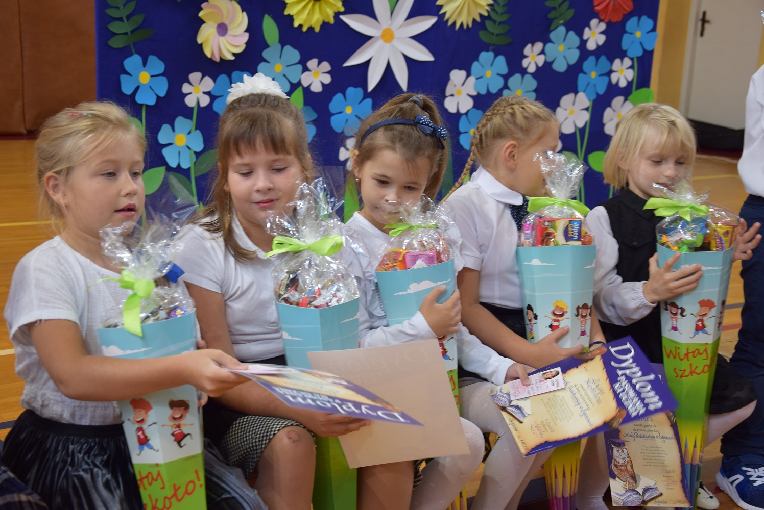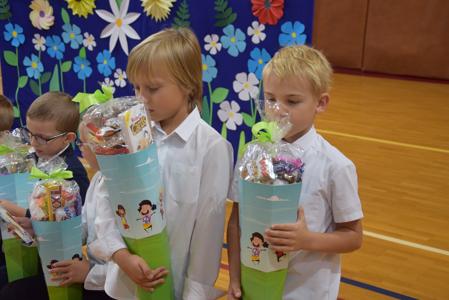 W tym szczególnym dniu najmłodszym uczniom towarzyszyli rodzice. Uczniowie klasy I w obecności swoich najbliższych i koleżanek i kolegów z klasy II i III złożyli ślubowanie. Aktu pasowania na ucznia klasy I dokonał Dyrektor Damian Reszka. Pierwszoklasiści otrzymali z rąk wychowawczymi Iwony Sowiślok pamiątkowe dyplomy i legitymacje szkolne. W ten sposób czternastu uczniów klasy pierwszej zostało przyjętych do społeczności uczniowskiej Szkoły Podstawowej w Sączowie. Na koniec radosnej uroczystości rodzice pierwszoklasistów obdarowali swoje pociechy rogami obfitości.