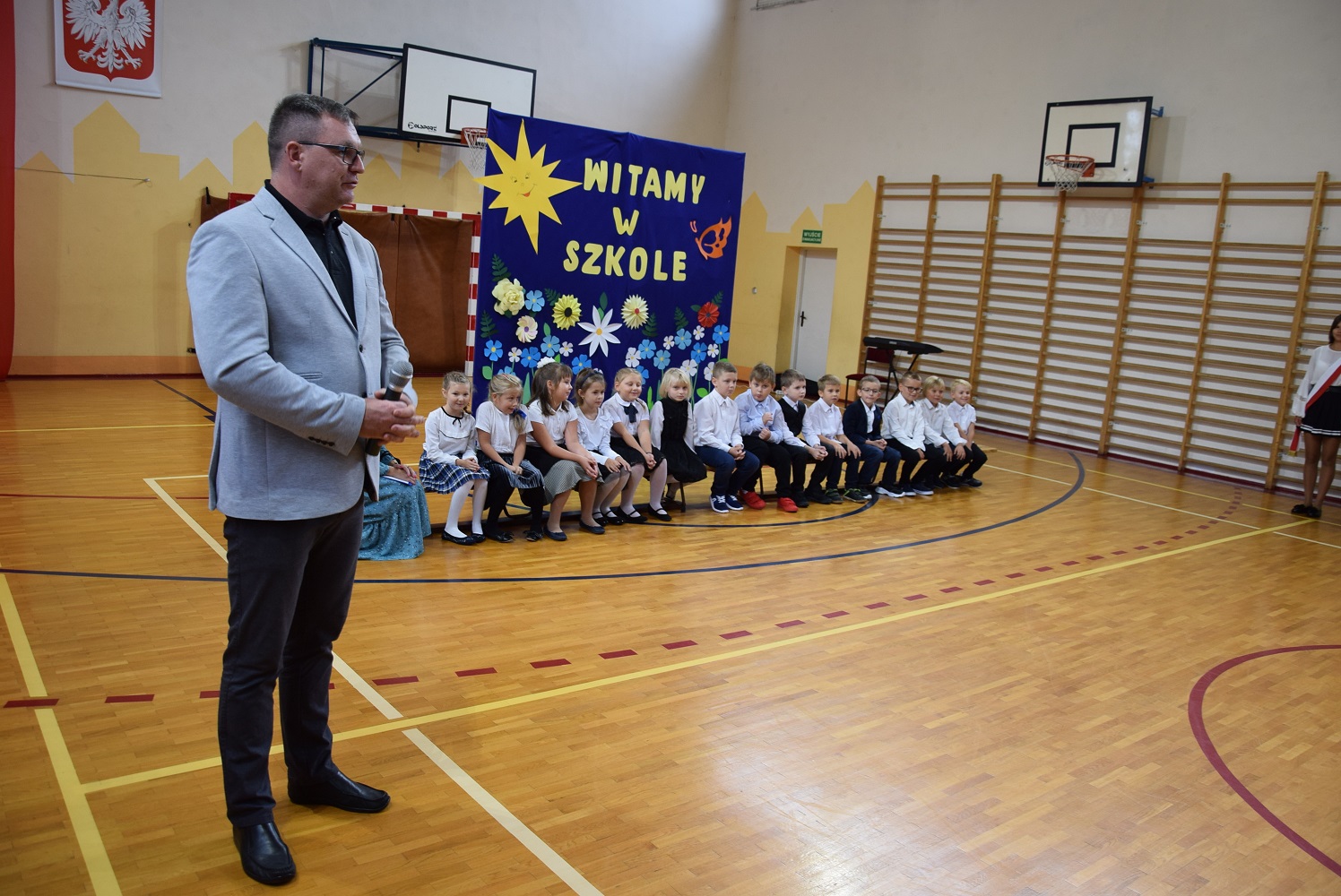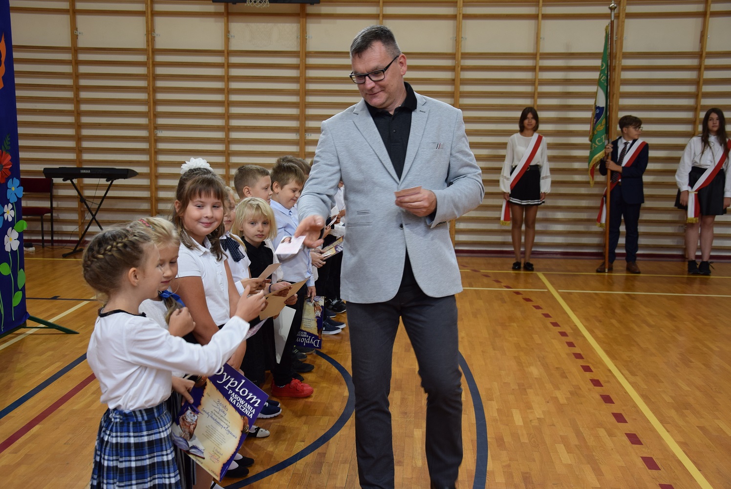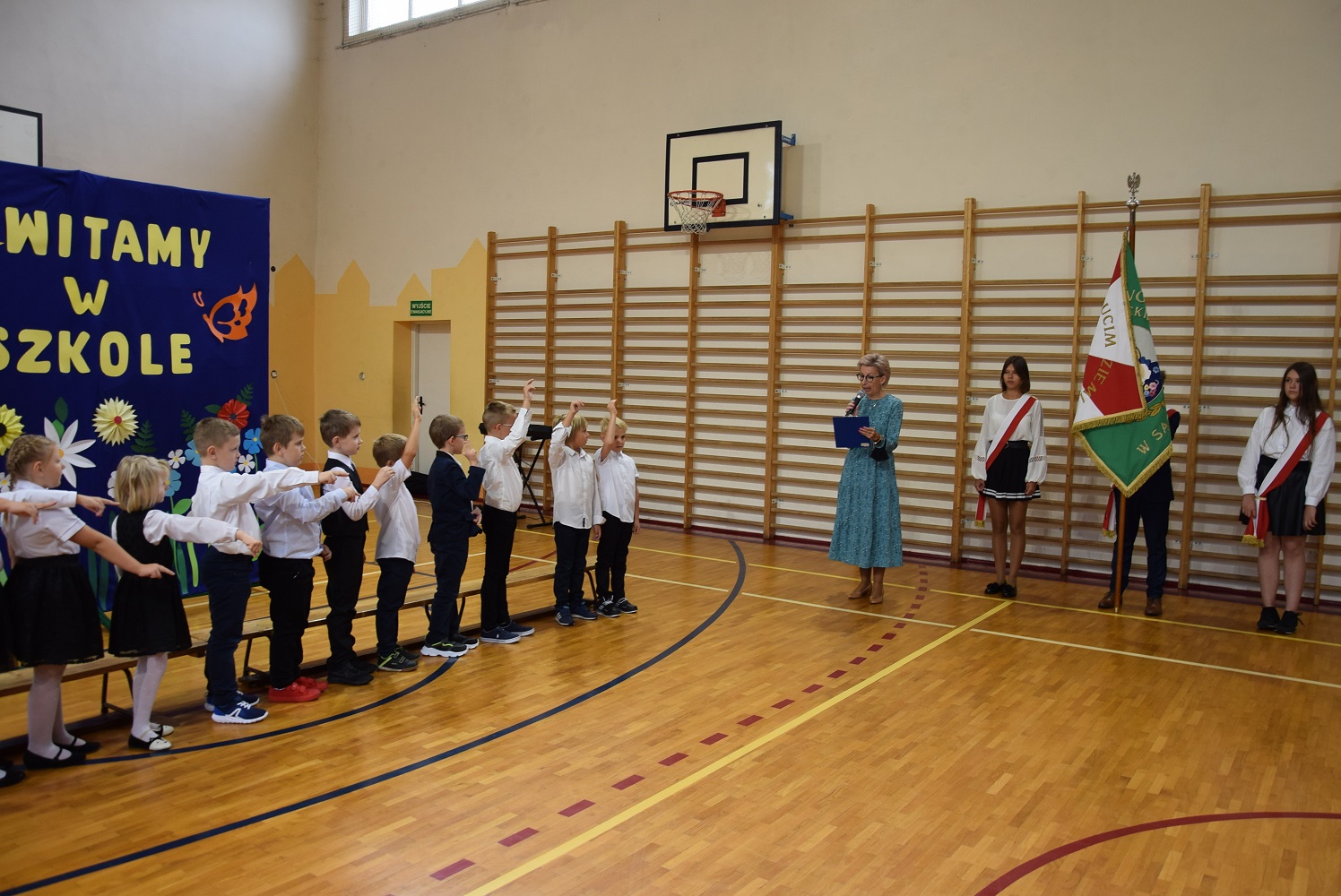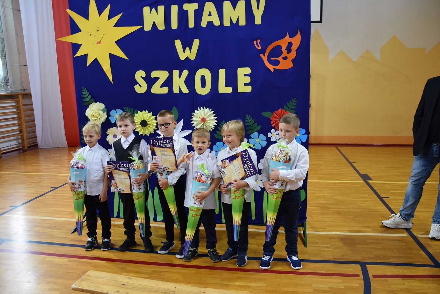 W tym szczególnym dniu najmłodszym uczniom towarzyszyli rodzice. Uczniowie klasy I w obecności swoich najbliższych i koleżanek i kolegów z klasy II i III złożyli ślubowanie. Aktu pasowania na ucznia klasy I dokonał Dyrektor Damian Reszka. Pierwszoklasiści otrzymali z rąk wychowawczymi Iwony Sowiślok pamiątkowe dyplomy i legitymacje szkolne. W ten sposób czternastu uczniów klasy pierwszej zostało przyjętych do społeczności uczniowskiej Szkoły Podstawowej w Sączowie. Na koniec radosnej uroczystości rodzice pierwszoklasistów obdarowali swoje pociechy rogami obfitości.