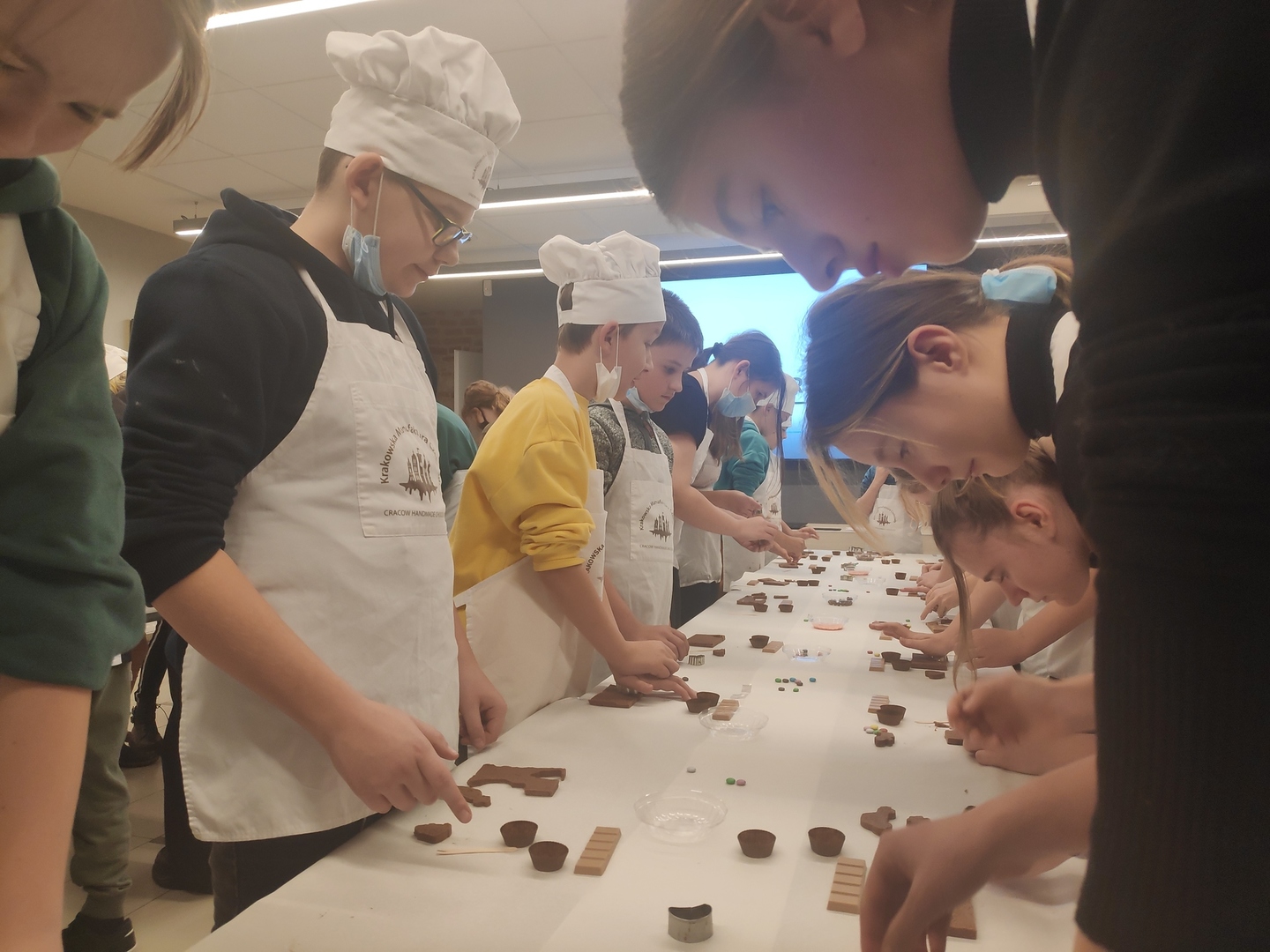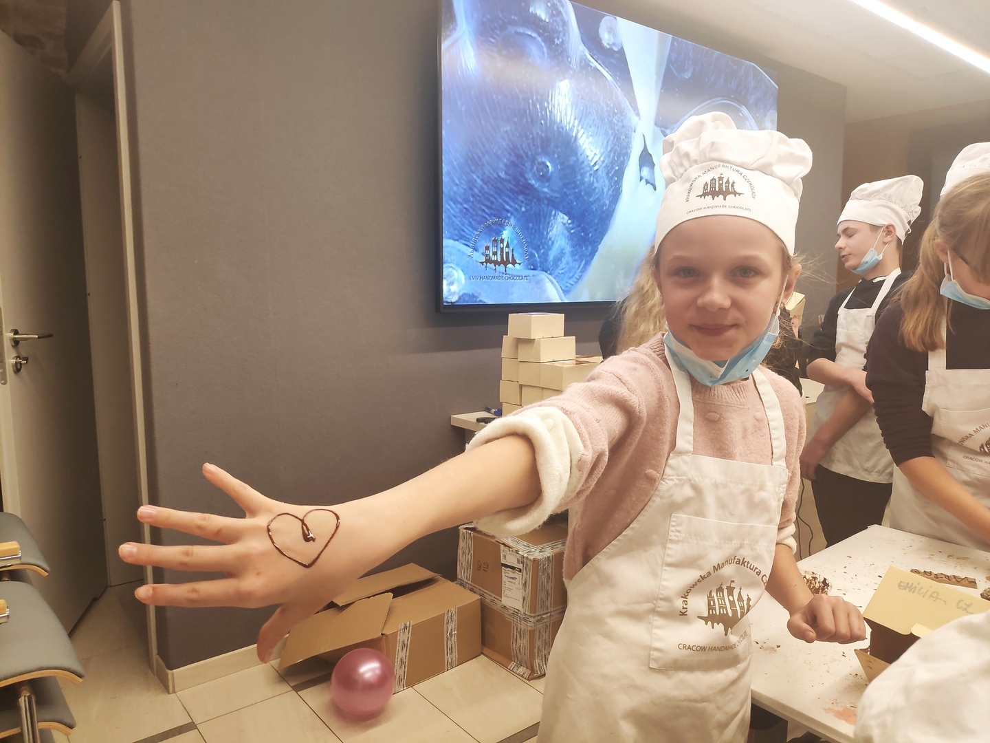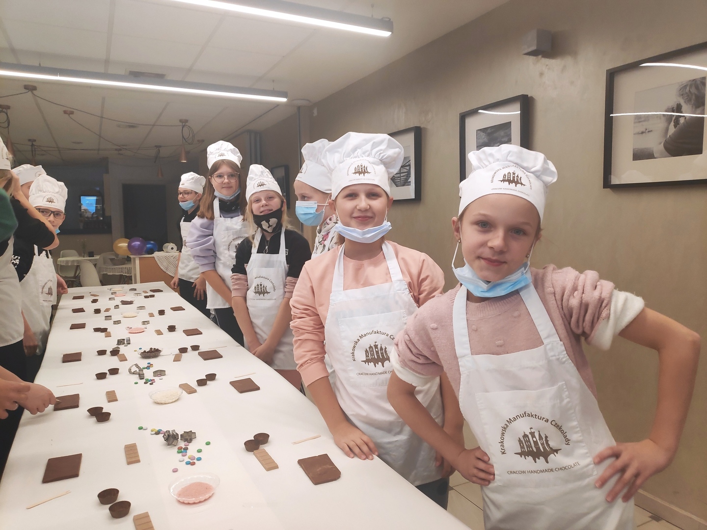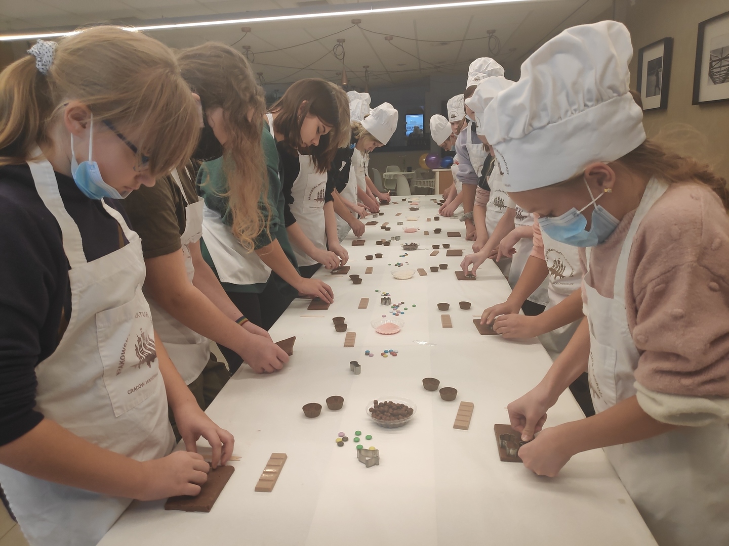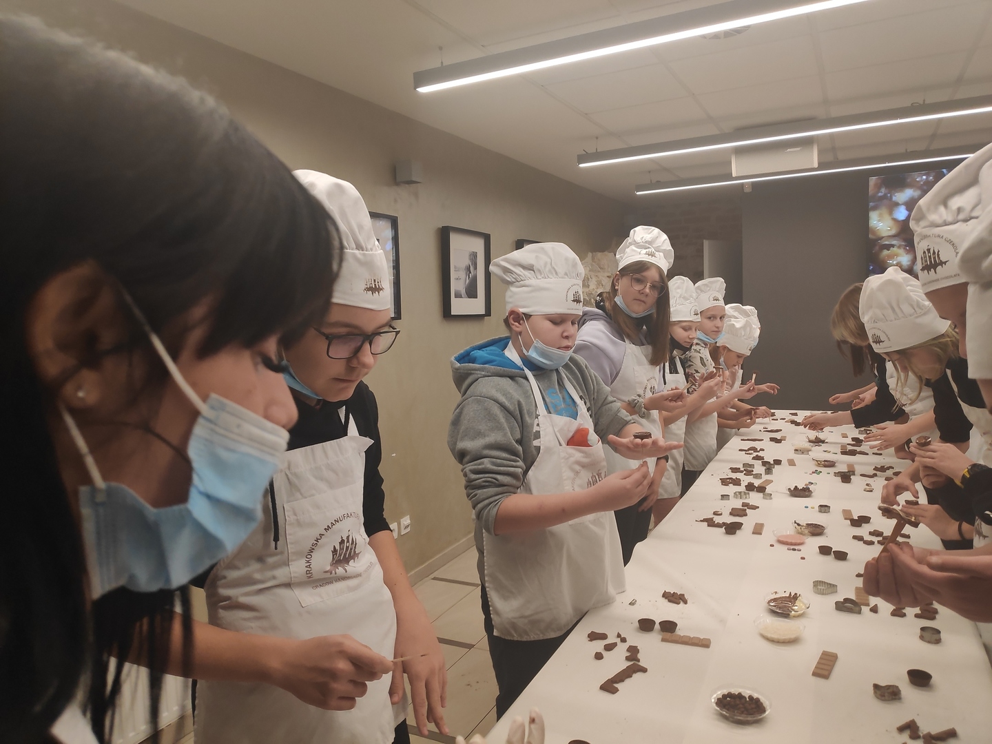 Naszą wizytę w Grodzie Kraka rozpoczęliśmy od słodkich warsztatów w Fabryce Czekolady, gdzie mieliśmy okazję zobaczyć ciekawy film o produkcji czekolady. Jednak tym na co wszyscy czekali była możliwość zrobienia własnoręcznie pysznych czekoladowych pralin. Dla wyjątkowych smakoszy słodkości były również czekoladowe tatuaże. Smakoszy było wielu….. było pysznie