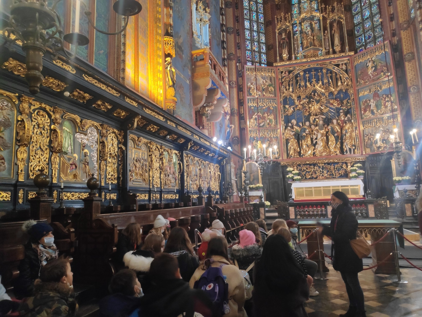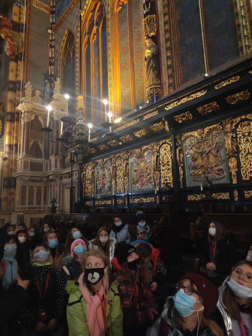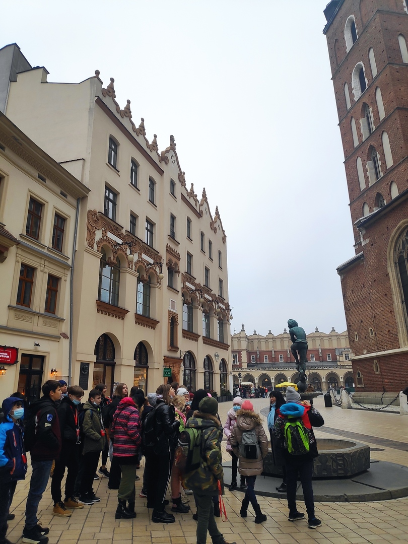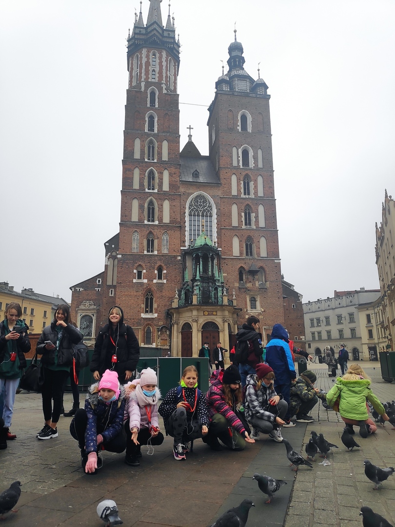 Później był spacer po Rynku i wizyta w Sukiennicach, gdzie mieliśmy okazję zakupić pamiątki: magnesy, pierścionki, czapki i wiele innych niezbędnych nam rzeczy. Na Rynku mieliśmy również okazję wysłuchać Hejnału Mariackiego.