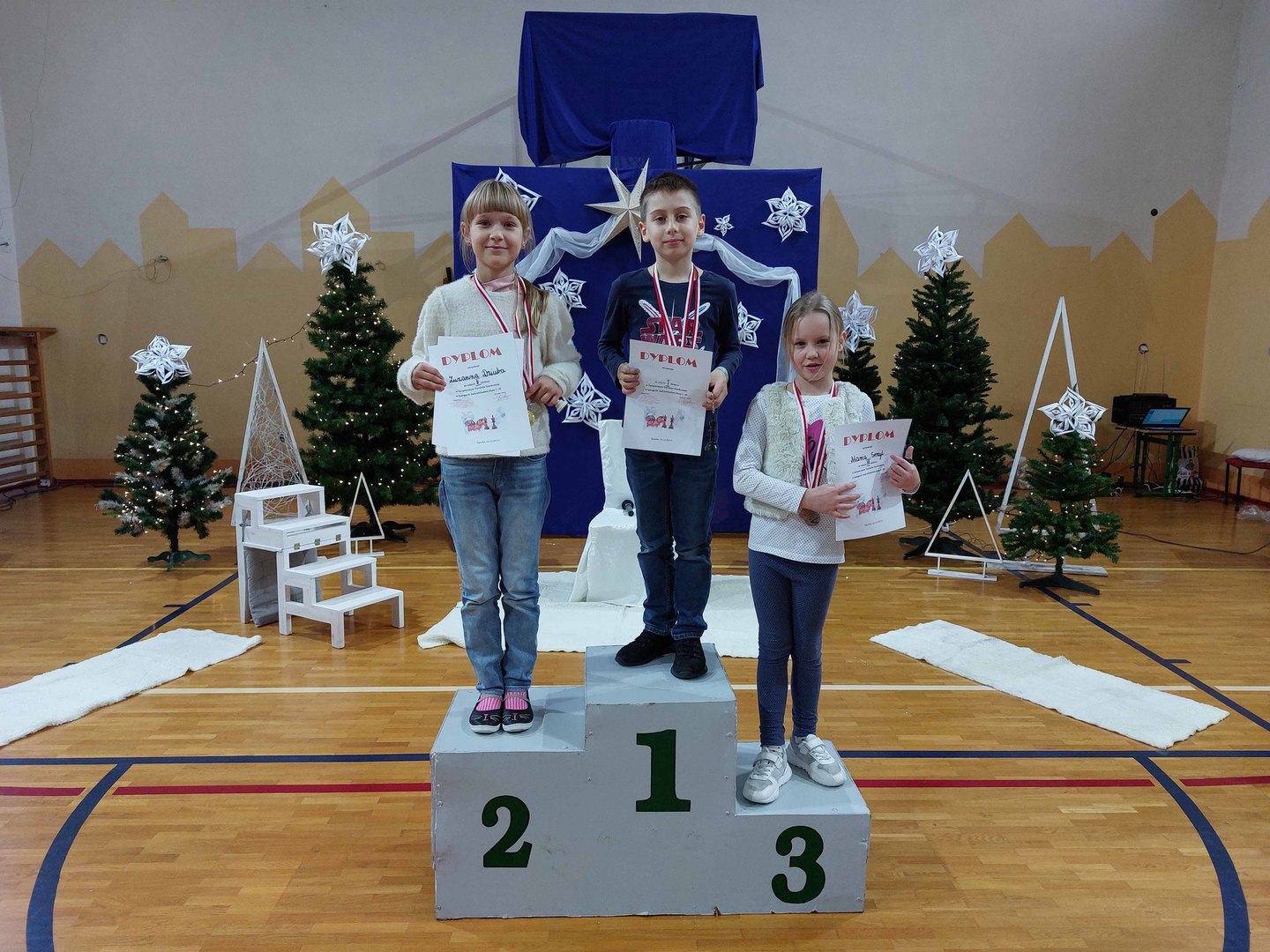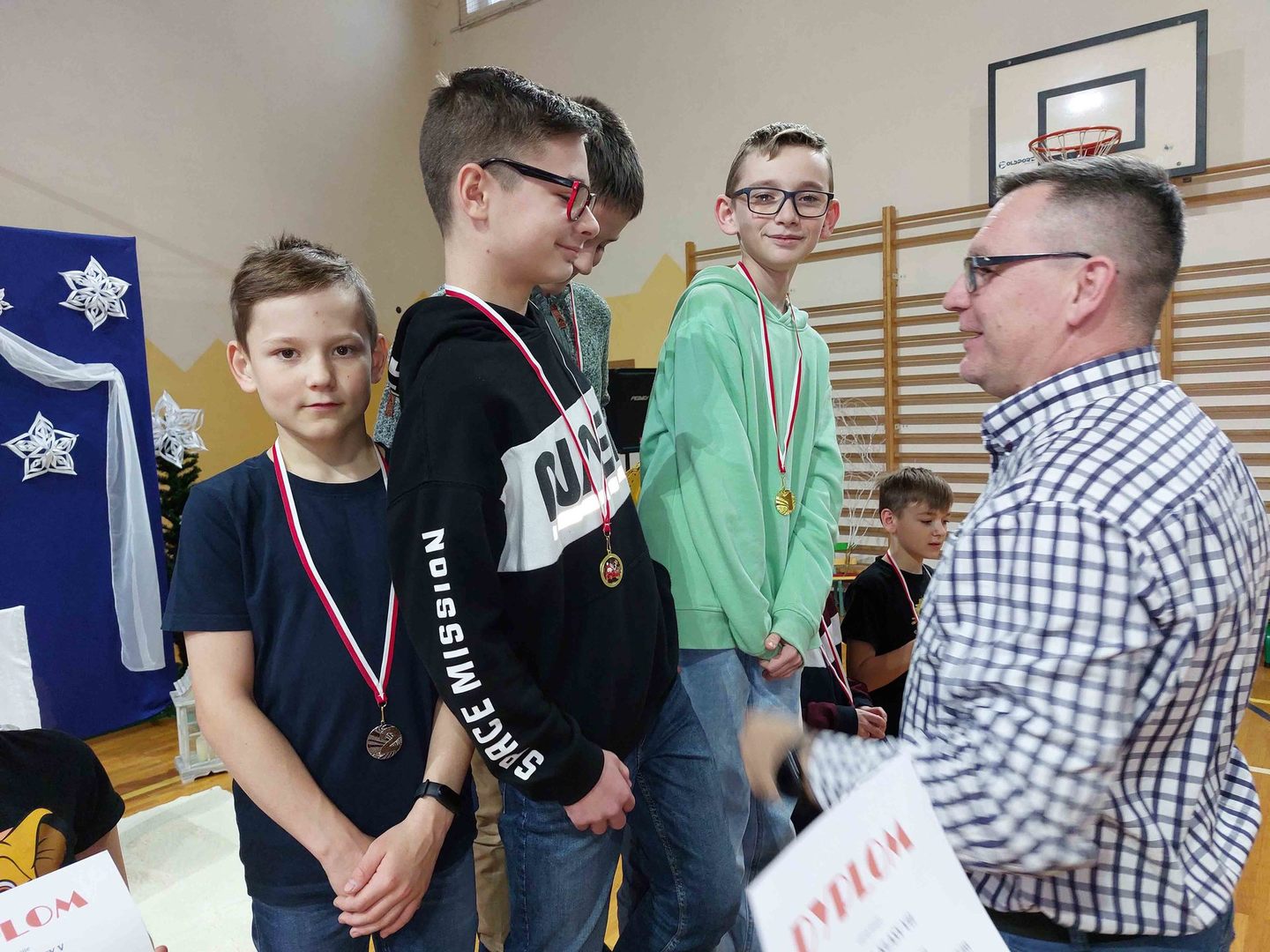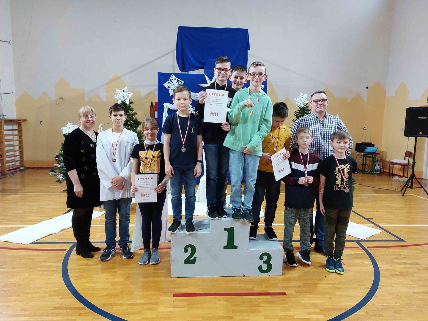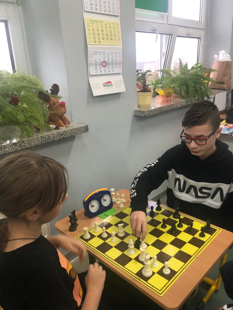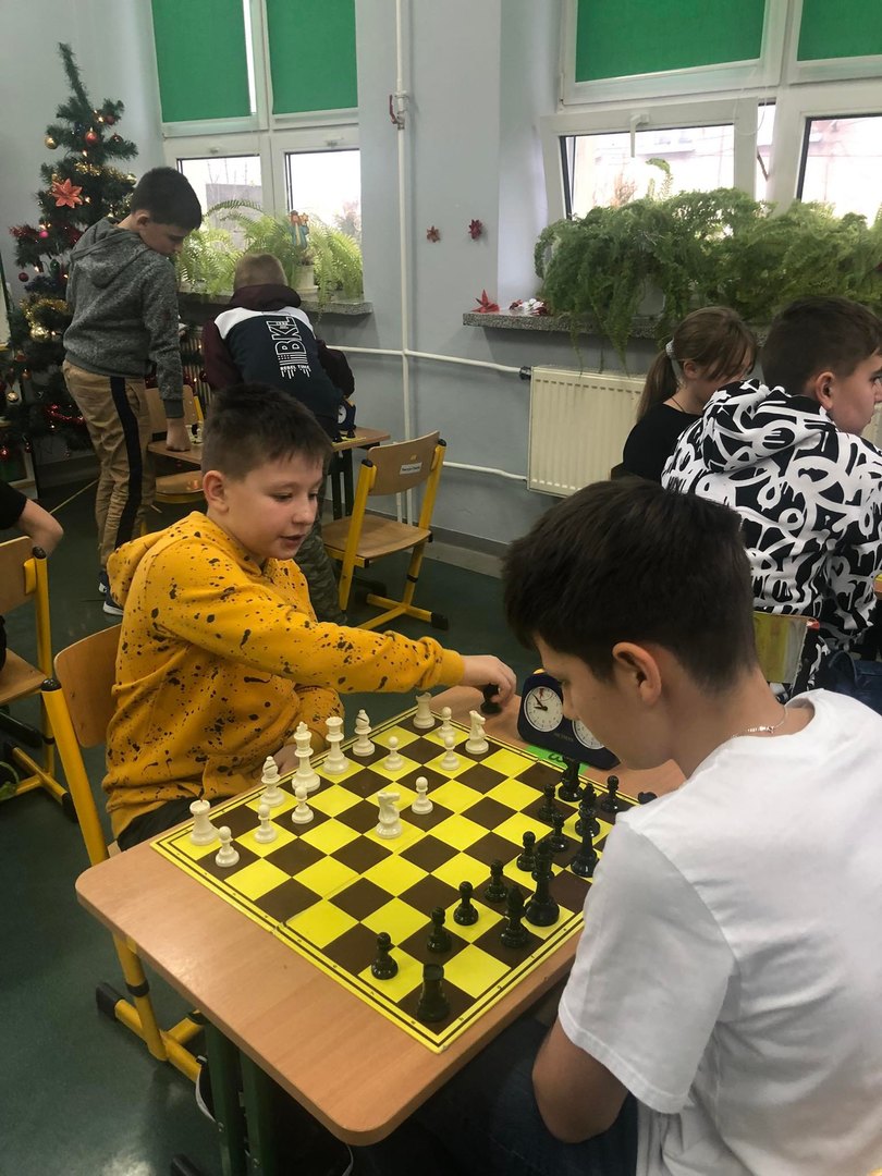 W dniu 16 grudnia 2021r. uczniowie naszej szkoły mieli okazję zmierzyć się w wyjątkowych zawodach, a mianowicie w Świątecznym Turnieju Szachowym. Do rozgrywek zgłosiło się 32 miłośników szachów z klas I -VII. Po eliminacjach do turnieju zakwalifikowało się 18 osób. Rozegrano 5 rund w tempie 10 minut na zawodnika, w dwóch kategoriach: klasy I-III i klasy IV-VII. Młodsi zawodnicy to początkowi gracze, którzy będą dopiero rozwijać swój talent w tym kierunku. Ale o starszych zawodnikach można powiedzieć, że to już pasjonaci tej królewskiej gry. Zaprezentowali swoje umiejętności na wysokim poziomie. Nagrody zostały przyznane: