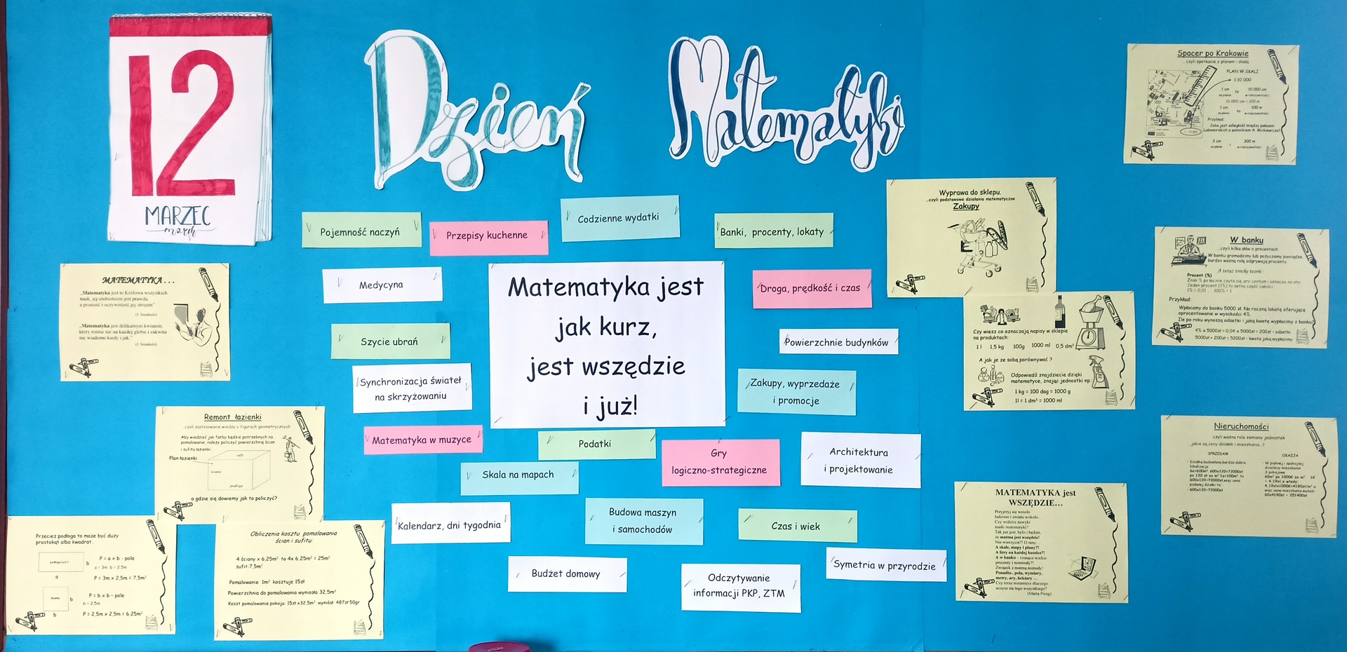 Dziś jak co roku, w naszej szkole obchodzony był Dzień Matematyki. Został ustanowiony po to, aby dać uczniom trochę odmiany w nauce matematyki. Udział w grach i zabawach matematycznych ma na celu pokazać, że matematyka może być przyjemna i dawać radość.