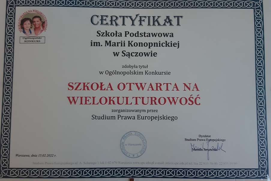 Jest nam niezmiernie miło poinformować, że nasza szkoła zdobyła tytuł i certyfikat w Ogólnopolskim Konkursie „Szkoła Otwarta na Wielokulturowość” zorganizowanym przez Studium Prawa Europejskiego w Warszawie.