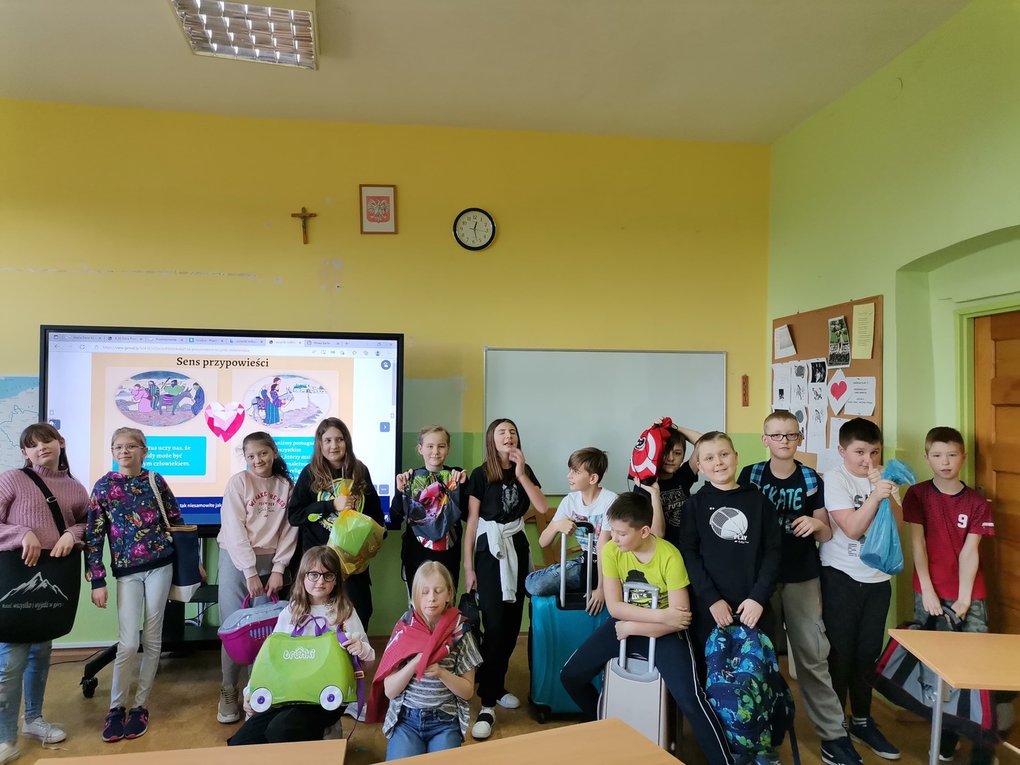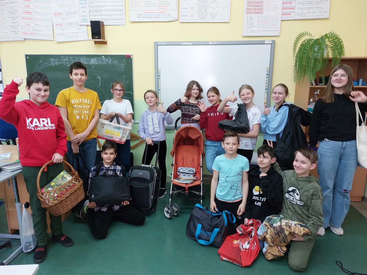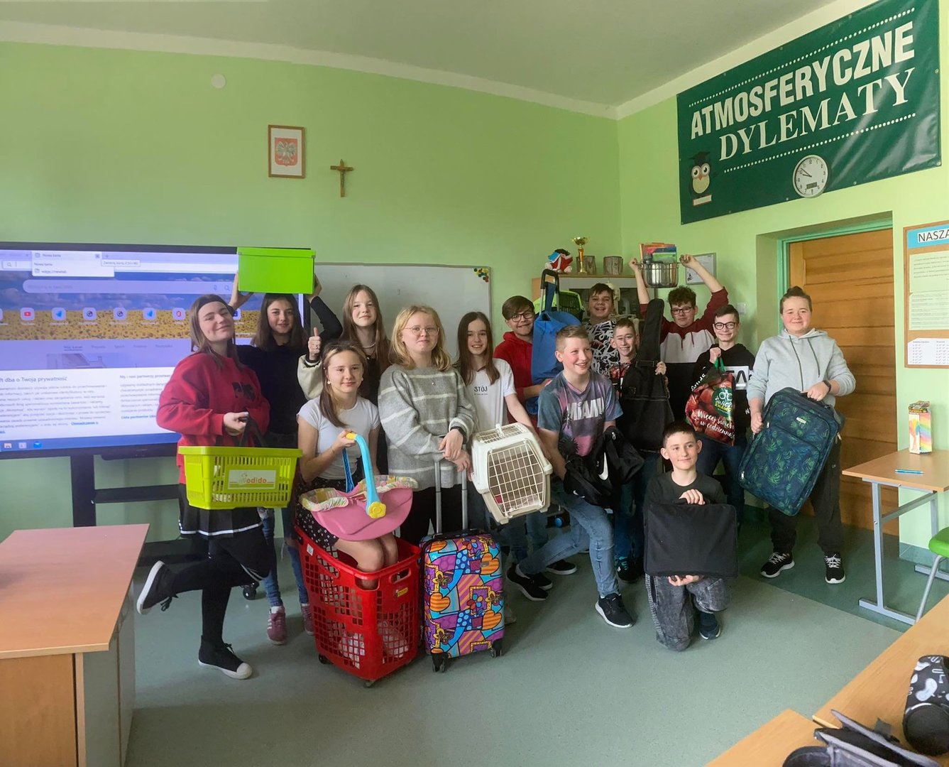 Dzisiejsza droga do szkoły była mega zabawna, bo zupełnie zwariowana. Nasze książki i zeszyty zamiast w szkolnych tornistrach wylądowały... w walizkach, koszach, garnkach, klatkach, workach, futerałach, siatkach, wózkach dziecięcych, wózkach i koszykach sklepowych itp. Pomysłów na ich transport do szkoły było całe mnóstwo. Zresztą zobaczcie to sami:))