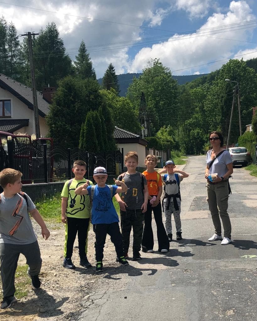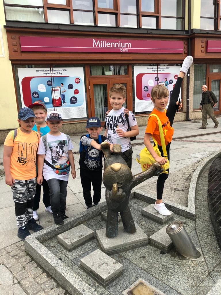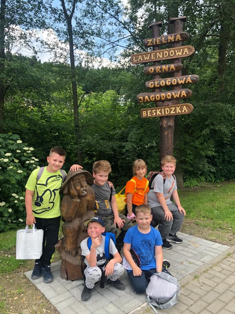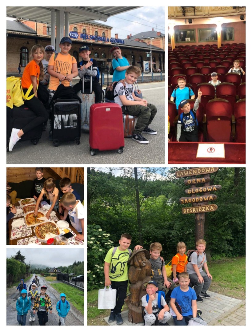 O poranku 7 czerwca uczniowie klasy III wraz z opiekunami panią Elą i Ewą wyruszyli na trzydniową wycieczkę w góry. Podróżowaliśmy autobusami, pociągami, a przede wszystkim wszędzie docieraliśmy pieszo. W pierwszym dniu po zakwaterowaniu w Bystrej odwiedziliśmy Muzeum Fałata. Zwiedziliśmy dom artysty, galerię obrazów oraz obejrzeliśmy film przybliżający jego postać. Spacerując ulicą Klimczoka zatrzymaliśmy się przy pomniku przyrody. Rośnie tam cis pospolity, który znajduje się na prywatnej posesji i ma ponad 360 lat. Następnie postój zrobiliśmy przy willi Halamówka, która była domem wczasowym na przełomie XIX/XX w. Dzień zakończyliśmy pieczeniem kiełbasek na ognisku. Drugiego dnia z racji niepogody odwiedziliśmy Gemini Park w Bielsku Białej, gdzie poszliśmy na seans filmowy „Wilk i spółka”. Dzień zakończyliśmy ucztowaniem przy stole z pizzą w różnych smakach oraz oglądaniem bajek wyprodukowanych w Wytwórni Filmów Rysunkowych w Bielsku Białej. Trzeciego dnia zwiedziliśmy Teatr Polski w Bielsku Białej. Mieliśmy okazję zajrzeć do pracowni krawieckiej, magazynu kostiumów, pań charakteryzatorek, garderoby aktorów, a także być w stolarni teatru. Dzieci były na scenie małej, dużej oraz w każdym miejscu na widowni. Po wyjściu z teatru podeszliśmy do budynku Poczty Głównej, aby wysłać rodzicom kartkę pocztową wcześniej samodzielnie wypisaną. Ostatnim punktem wycieczki był spacer po centrum Bielska, gdzie poszukiwaliśmy postaci bajkowych. A były to pomniki: Pampaliniego, Don Pedra z Krainy Deszczowców, Baltazara Gąbki, Reksia oraz Bolka i Lolka. Wrażeń było bardzo dużo, dzieci zmęczone, ale szczęśliwe wróciły do domu. Radzie Rodziców bardzo dziękujemy za pokrycie kosztów biletów do kina.