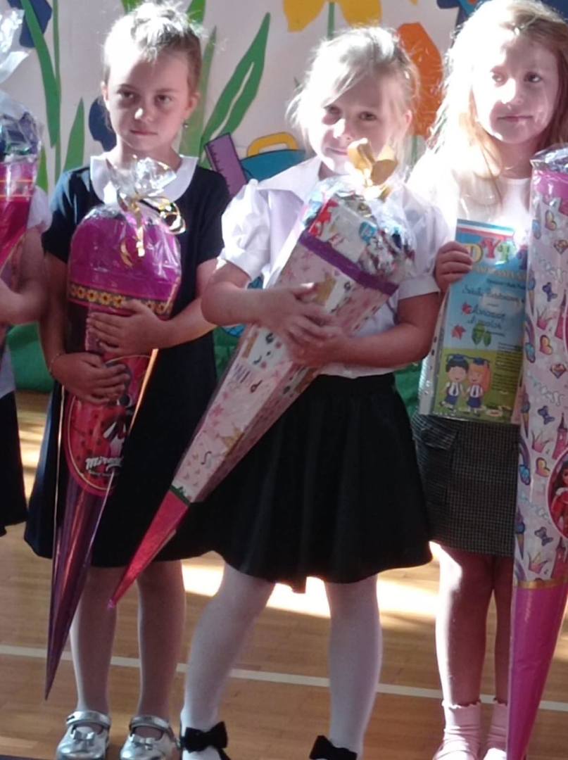 Ten uroczysty moment z uwagą śledzili rodzice nowych uczniów, którzy dla swoich małych uczniów przygotowali słodkie podarunki zamknięte w pięknych, kolorowych rogach obfitości.