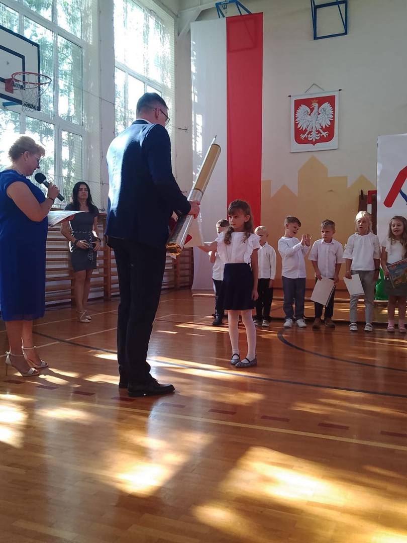 Na początek uroczyście wprowadzono poczet sztandarowy i odśpiewano Hymn Państwowy. Wszystkich zebranych w sali gimnastycznej serdecznie powitał pan Dyrektor Damian Reszka.