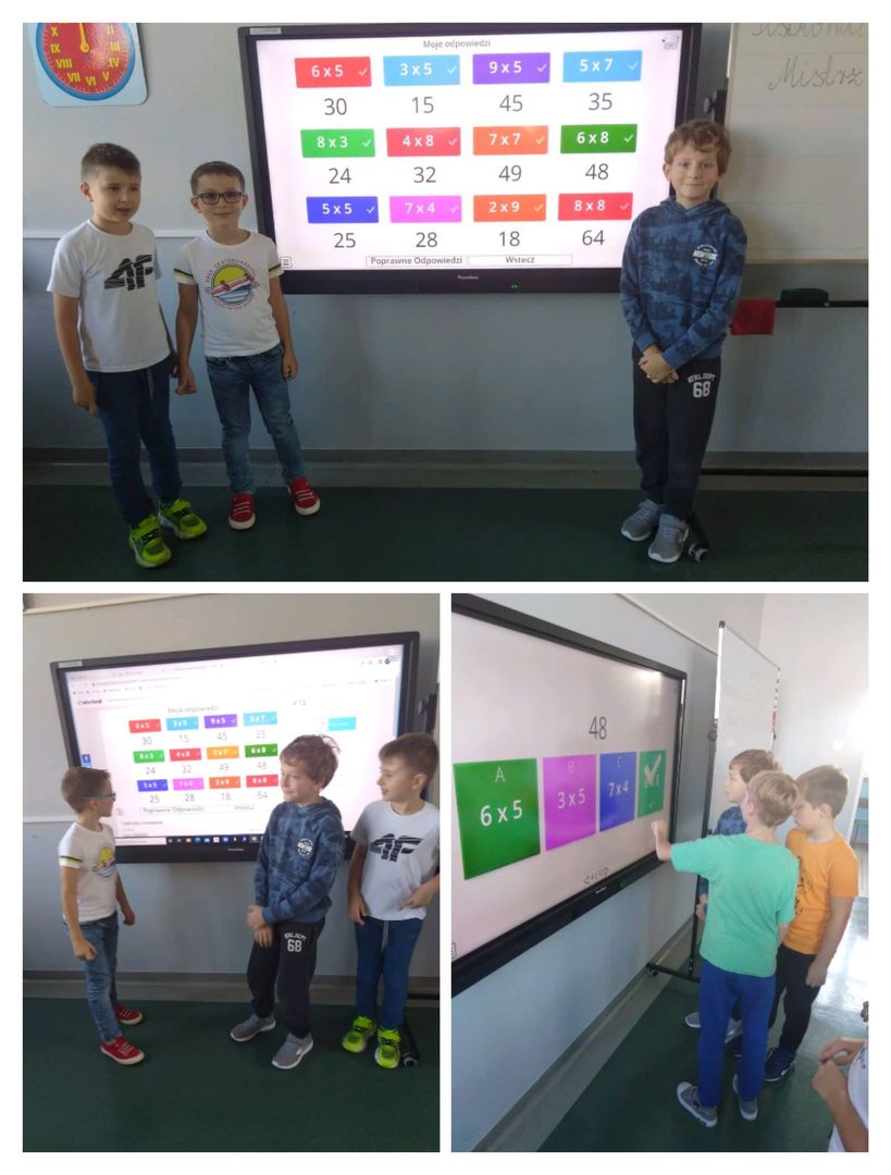Do zabawy z tabliczką mnożenia przystąpiła klasa III - jako jedyna z klas najmłodszych. Uczniowie z wielkim zapałem układali piramidę z tabliczką mnożenia. Choć zadanie okazało się niezbyt łatwe, to wszyscy poradzili sobie z nim doskonale. Znajomość tabliczki mnożenia trzecioklasiści szlifowali również podczas różnych zabaw matematycznych szukając spośród siebie Mistrza Tabliczki Mnożenia.