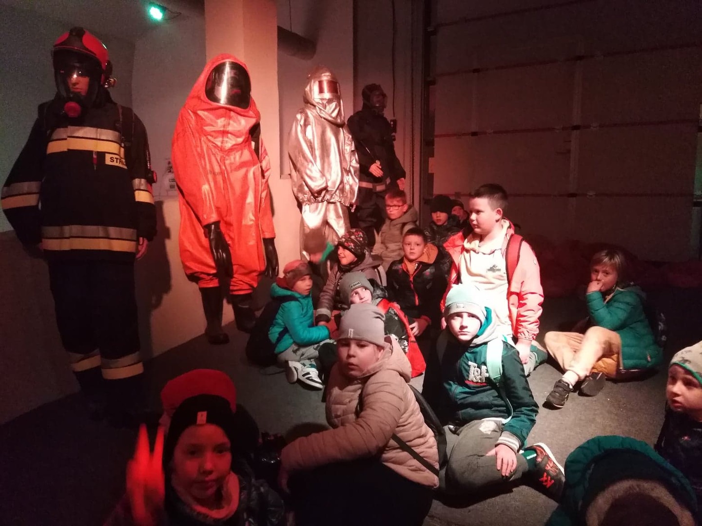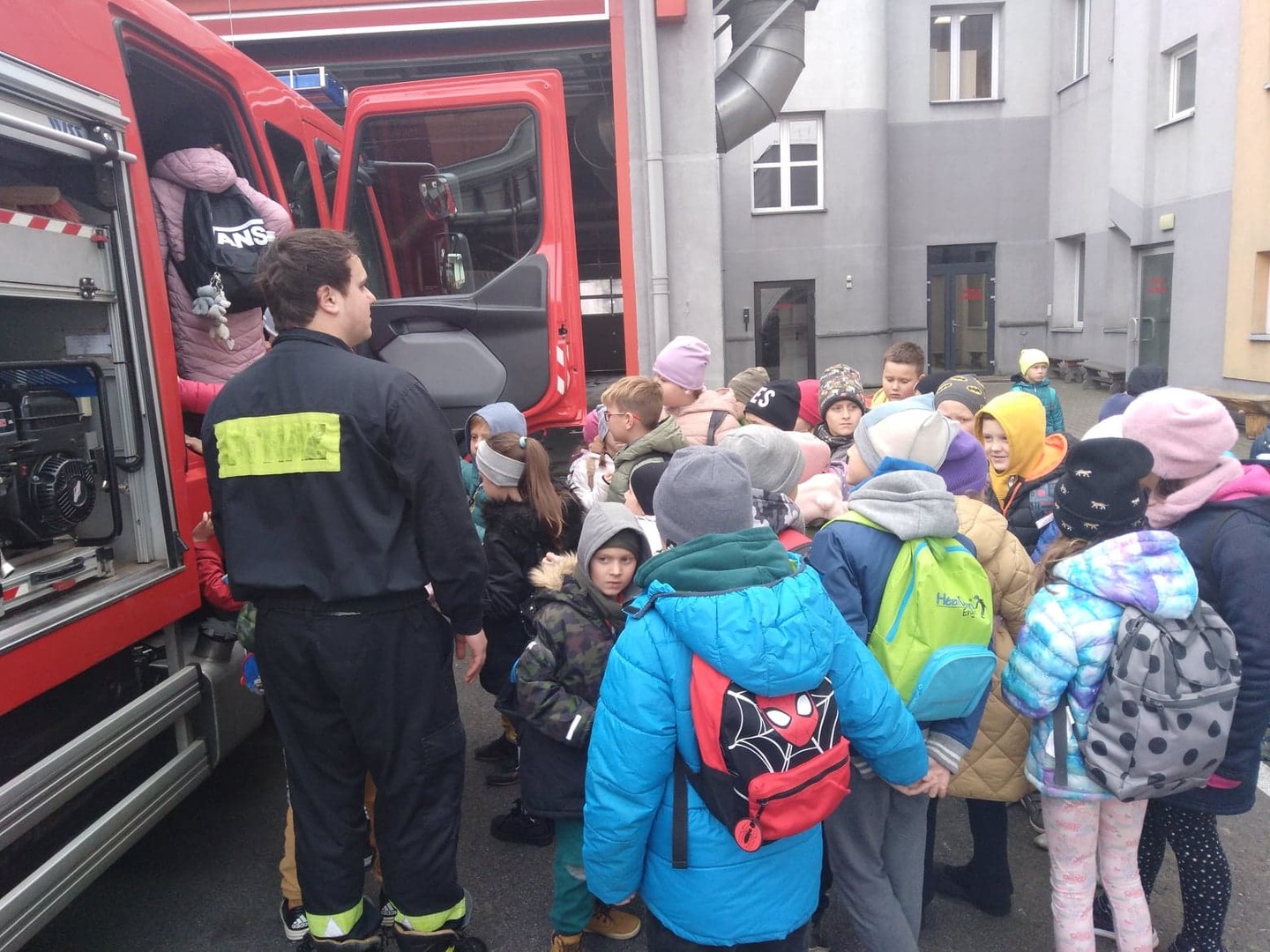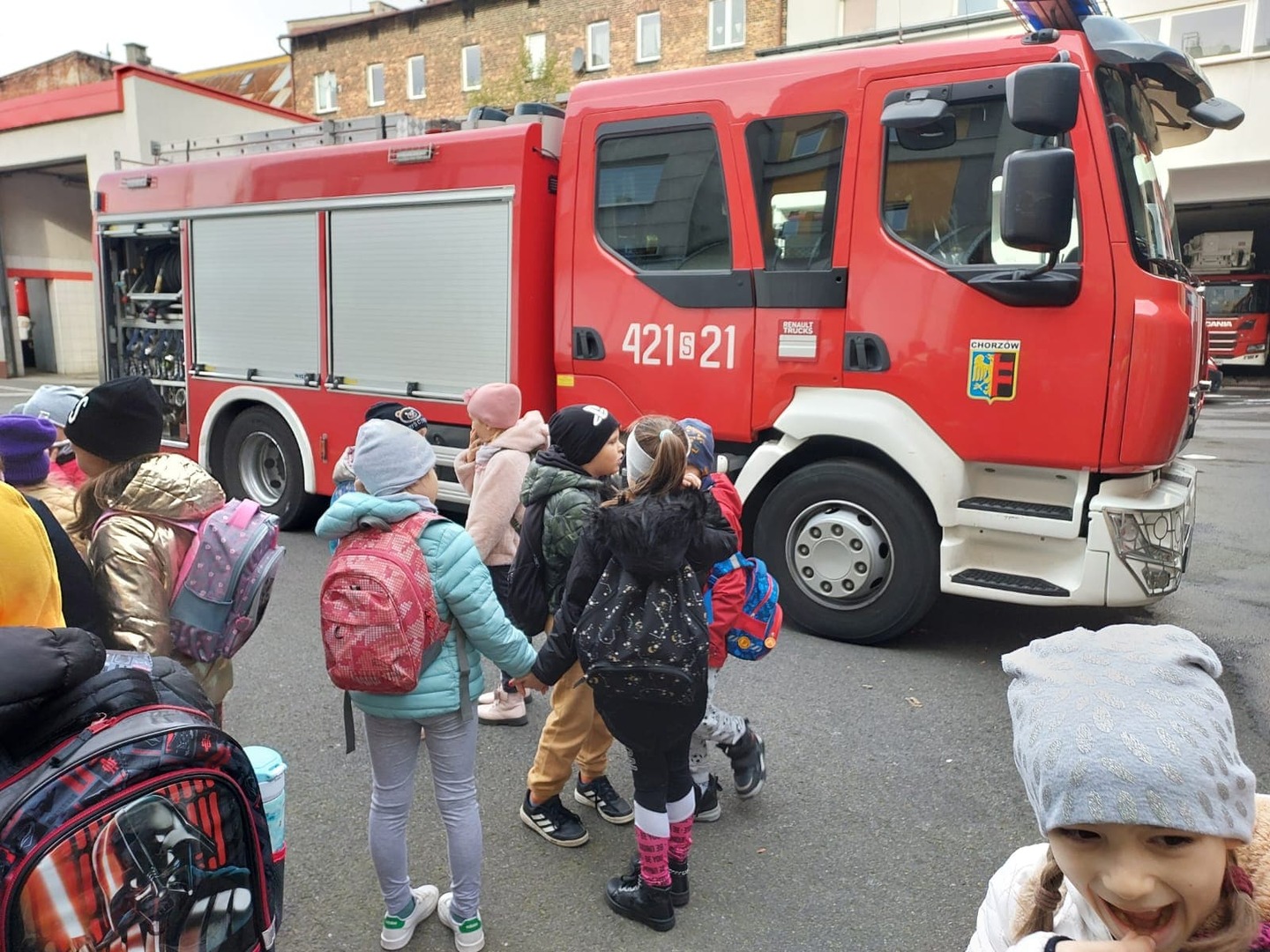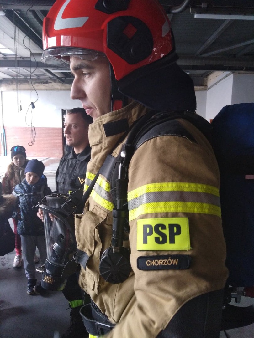 Na koniec wycieczki korzystając z uprzejmości strażaków z MPSP w Chorzowie uczniowie mogli zwiedzić prawdziwe garaże strażackie, w których znajdowały się wozy bojowe używane do akcji gaśniczych.