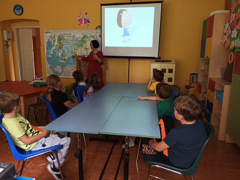 Uczniowie najmłodszych klas mieli przyjemność gościć Panią Joannę Krzyżanek, autorkę książek dla dzieci. Pisarka przedstawiła nam bohaterów jednej ze swoich książek, sympatyczną rodzinę Wafelków, która mieszka w domu z różowymi drzwiami.