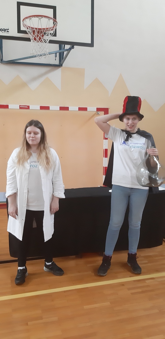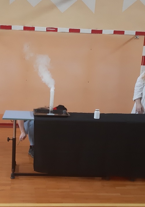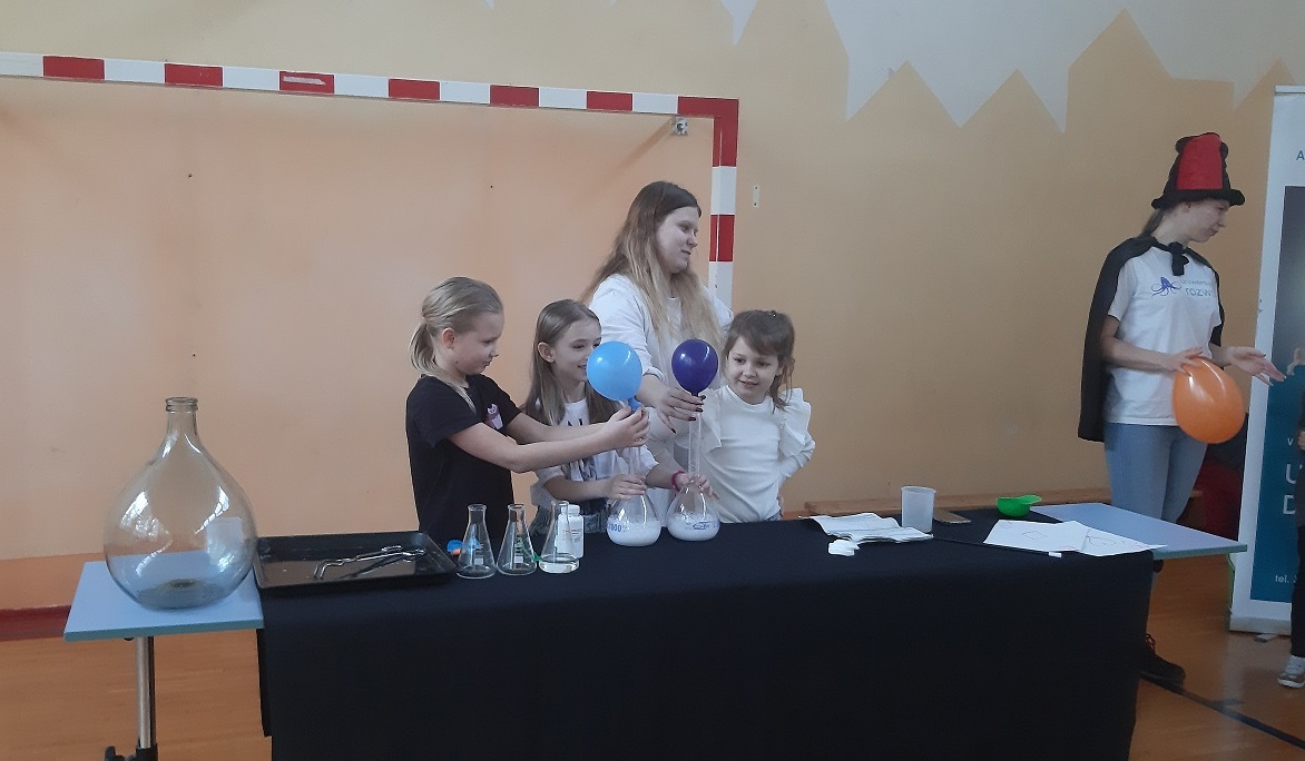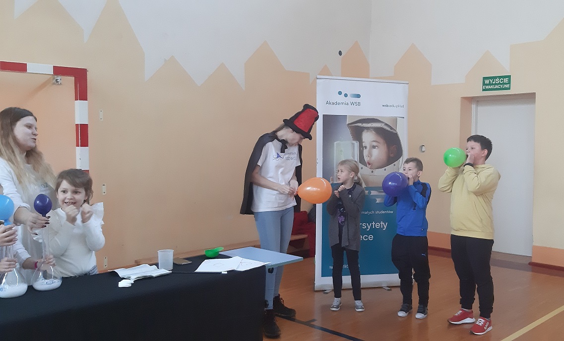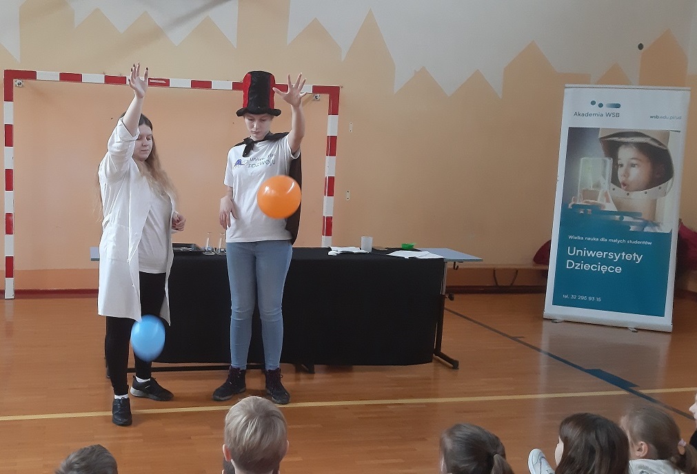 W dniu 11 stycznia 2023r. w naszej szkole sala gimnastyczna zamieniła się w laboratorium. Uczniowie klas I – IV mieli okazję uczestniczyć w wykładzie pt. „ Nauka kontra magia”. Wykładowcami Uniwersytetu Dziecięcego Akademii WSB był naukowiec i magik. Z pomocą dzieci i z zachowaniem zasad bezpieczeństwa przeprowadzono szereg doświadczeń przeplatanych czarami. Było naprawdę ciekawie i udowodniono nam, że chemia jest nieco magiczna, a magia chemiczna.