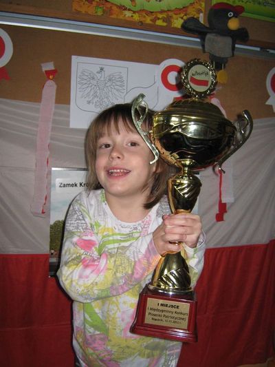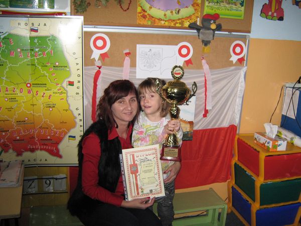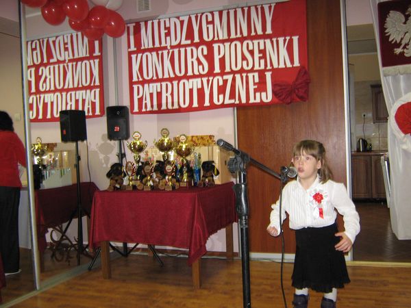 Z okazji obchodów Święta Niepodległości w naszej gminie odbył się I Międzygminny Konkurs Piosenki Patriotycznej pod patronatem Wójta Gminy Bobrowniki. Organizatorem konkursu jest Przedszkole w Rogoźniku. W konkursie wzięło udział dwunastu przedszkolaków z Gminy Bobrowniki i gości z okolicznych gmin. Przedstawicielką naszego przedszkola była Dominika Czajkowska, która zaśpiewała piosenkę "Rozszumiały się wierzby płaczące". Dominika urzekła komisję konkursową swoim głosem i zdobyła pierwsze miejsce. Nagrodą był okazały puchar, dyplom i wiele nagród niespodzianek. Gratulujemy Dominice i życzymy kolejnych wokalnych sukcesów.