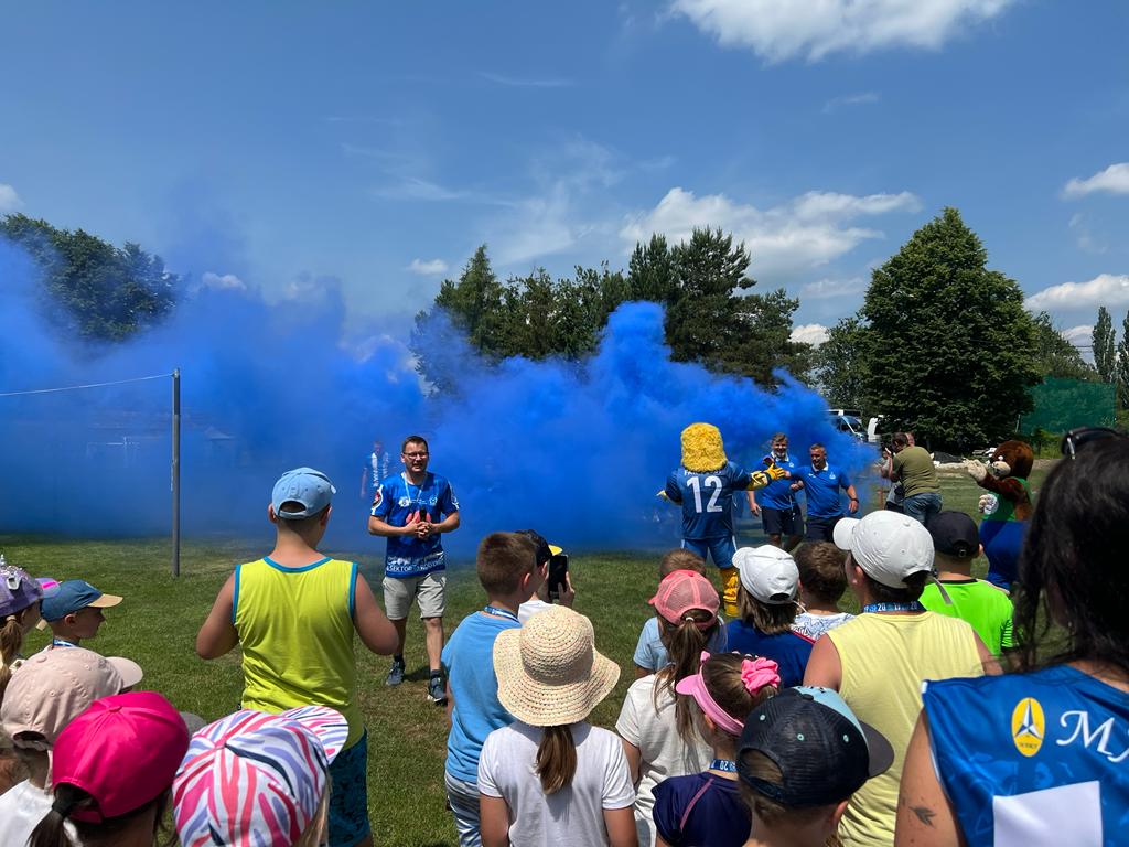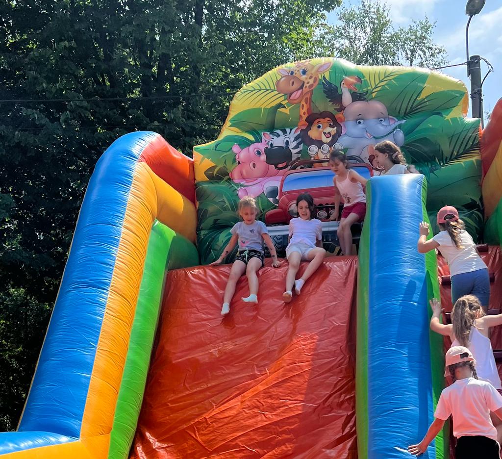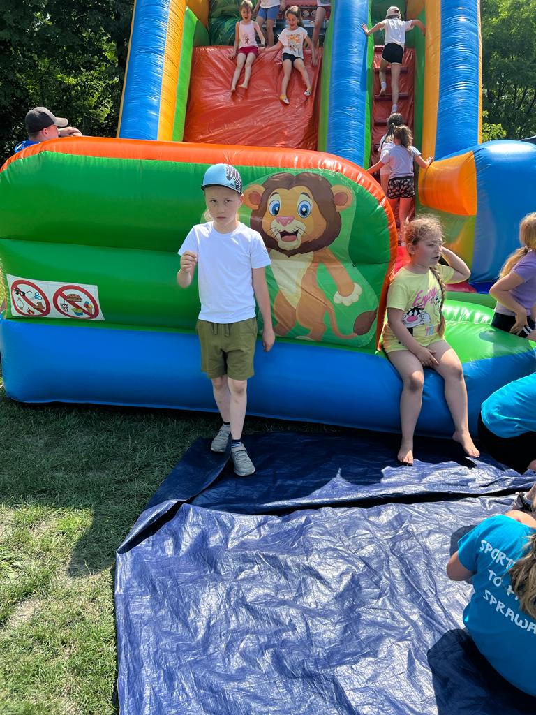 Oprócz aktywności sportowych na dzieci czekało wiele atrakcji, w tym ogromny zamek – dmuchaniec i stanowisko z popcornem.
