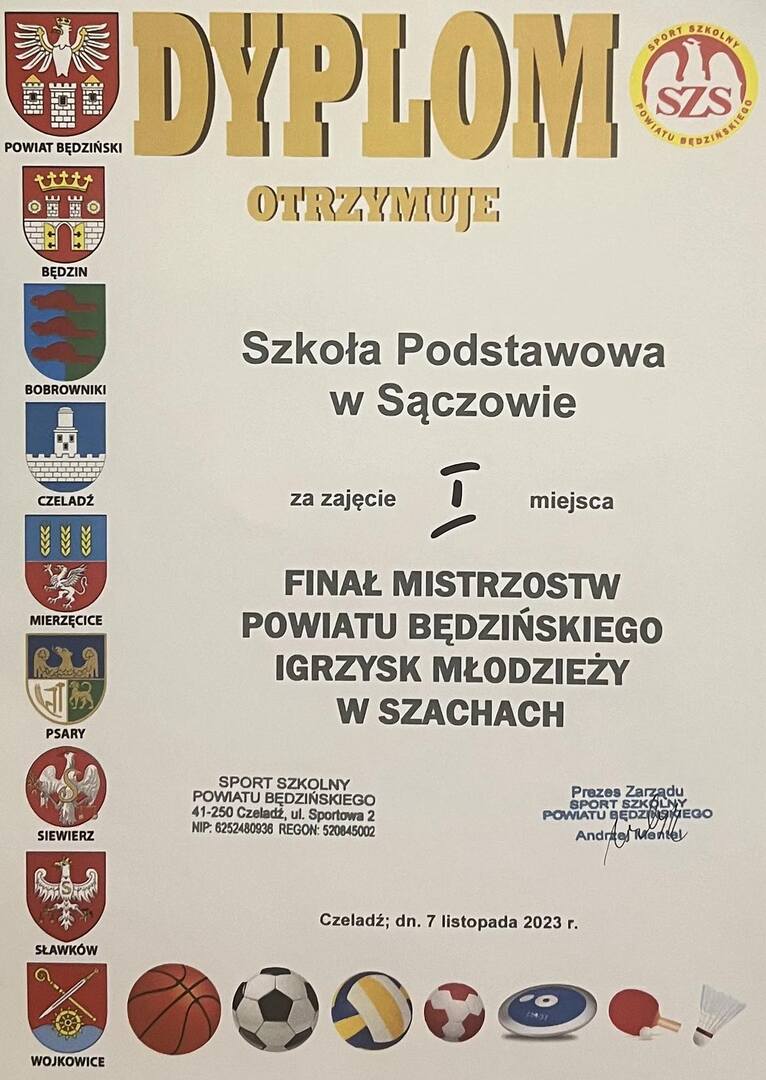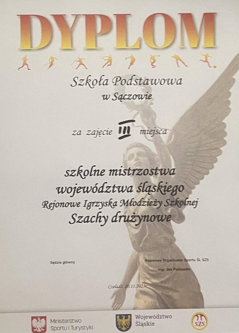 Do walki z „wojskiem szachowym” zasiadły najlepsze drużyny z Dąbrowy Górniczej (SP nr 2, 16 i 21 Dąbrowa Górnicza) i powiatu będzińskiego (SP 2 Będzin, SP Rogoźnik i SP Sączów). Sędzią turnieju był Pan Łukasz Wesołowski, który czuwał nad przebiegiem zmagań młodych szachistów. Drużyn było 6, zawodników 24, w tym 6 dziewczyn. Rozegrano 5 rund, w tempie po 10 minut na zawodnika, w systemie kołowym. Nasza drużyna w składzie: Marta Cabaj, Paweł Kuwak (kapitan), Szymon Domański i Paweł Tłuszcz zdobyła III miejsce. Najrówniej grała Marta i Paweł Kuwak, którym udało się zdobyć punkty dla drużyny w czterech rundach. Drużyna rozegrała partie na bardzo wysokim poziomie, gdyż przeciwnicy (uczniowie z miejskich szkół) często byli szachistami klubowymi. Duże brawa i gratulacje dla naszego zespołu, bo to największy sukces szachowy w historii szkoły uzyskany w rozgrywkach szkolnych. Pomimo deszczowej pogody z zawodów wróciliśmy z uśmiechami na twarzy oraz dwoma dyplomami, gdyż ostatnio jako mistrzowie powiatu będzińskiego wróciliśmy tylko z pucharem.