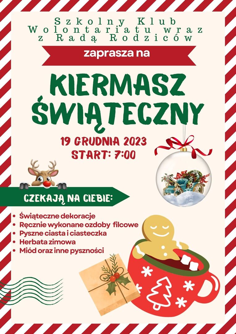 Wolontariat szkolny wraz z Radą Rodziców z wielką przyjemnością zaprasza naszą społeczność szkolno-przedszkolną na Kiermasz Świąteczny, który odbędzie się 19 grudnia od godz. 7:00 do wyczerpania zapasów w holu przy głównym wejściu.