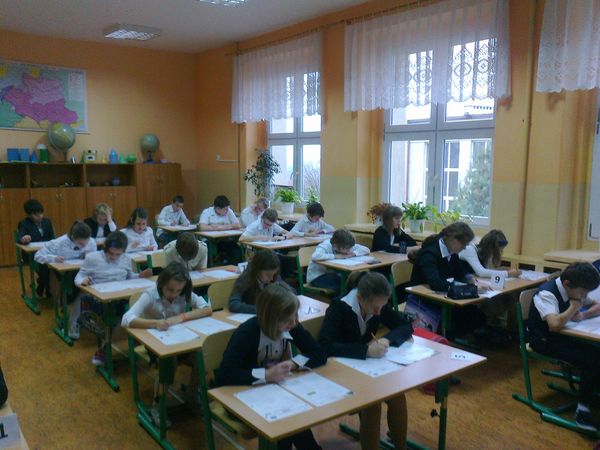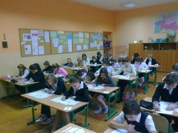 Trzydzestu trzech uczniów w skupieniu wytężało swoje szare komórki rozwiązując test składający się z 25 pytań w ciągu 45 minut. Problematyka zadań była różnorodna.