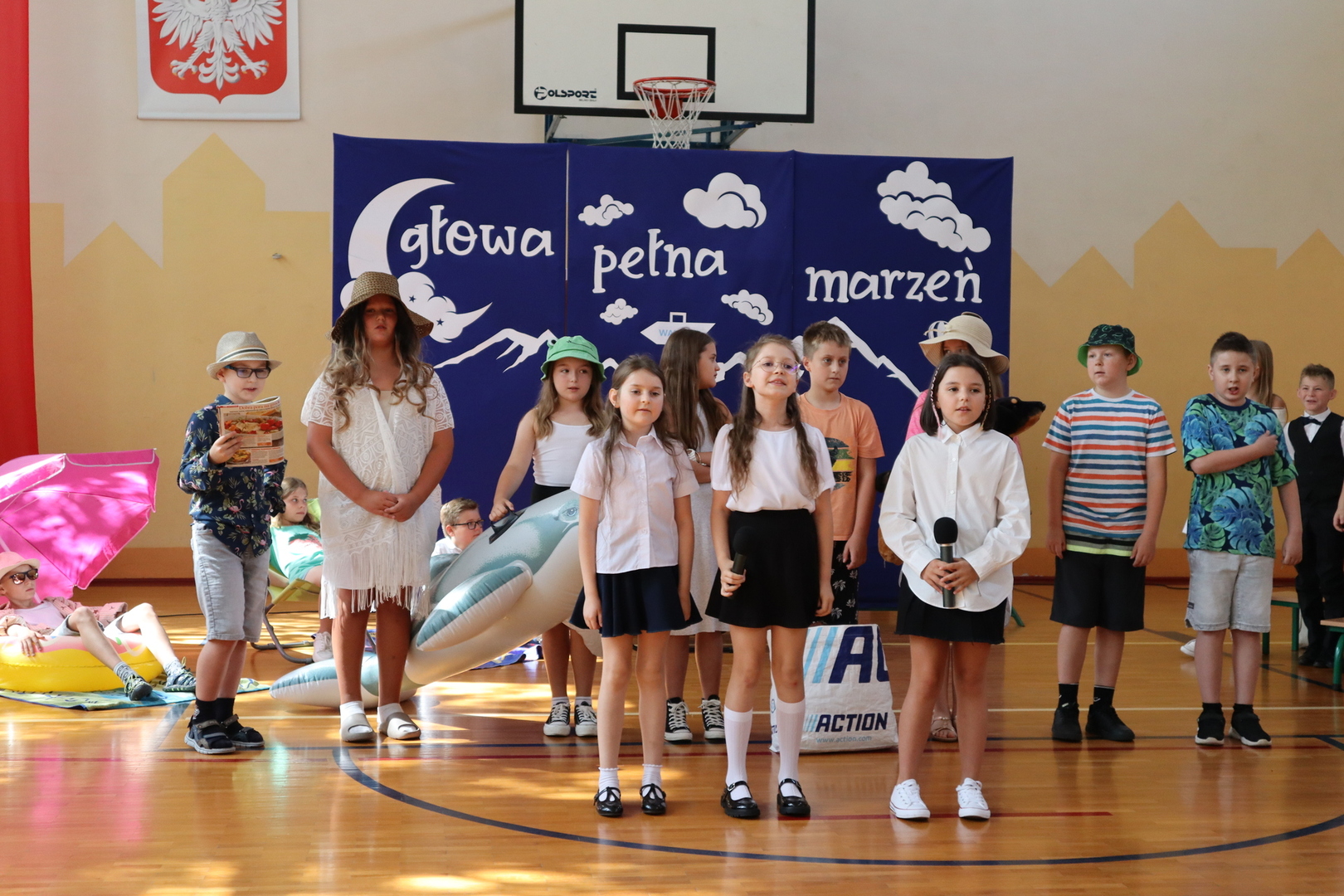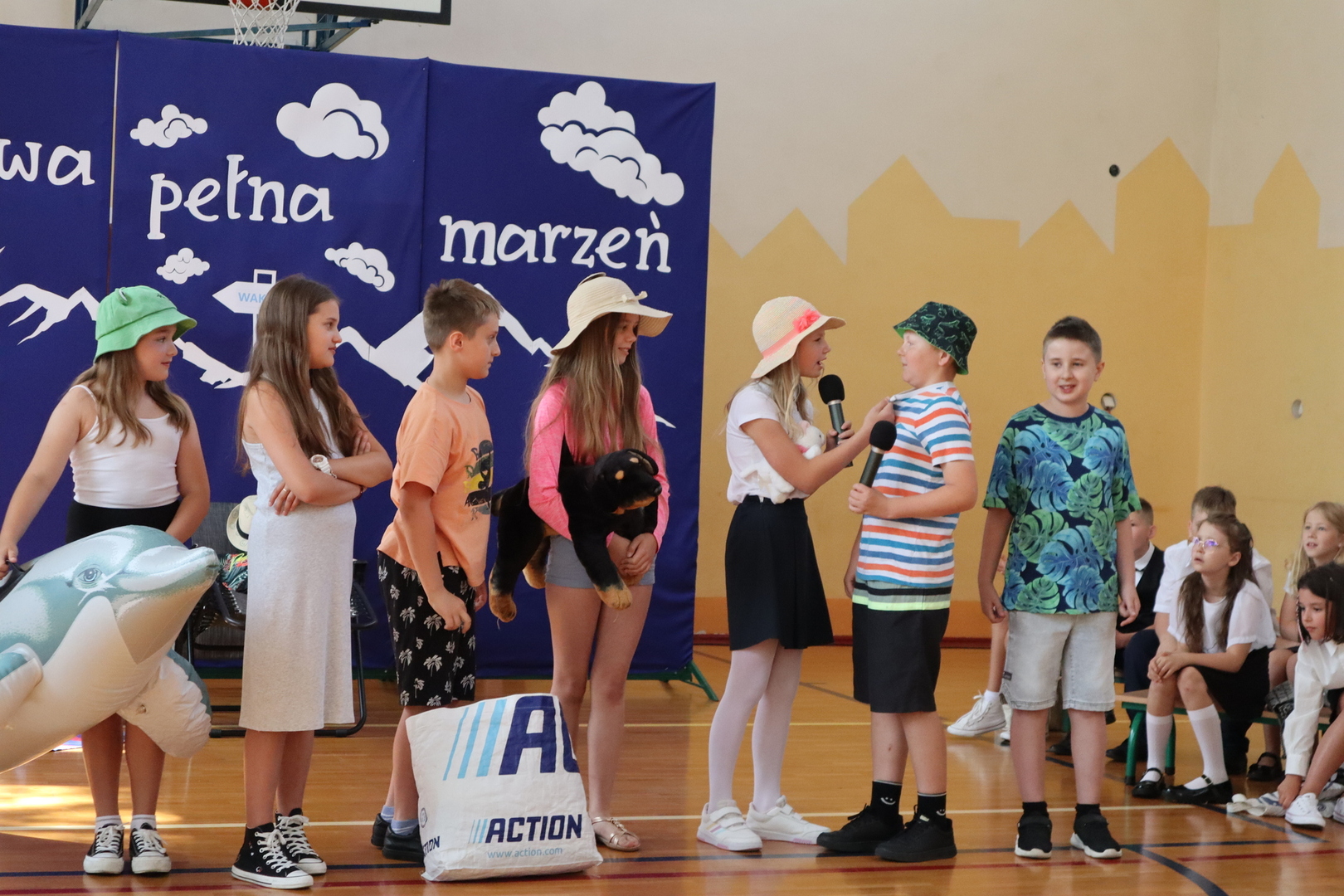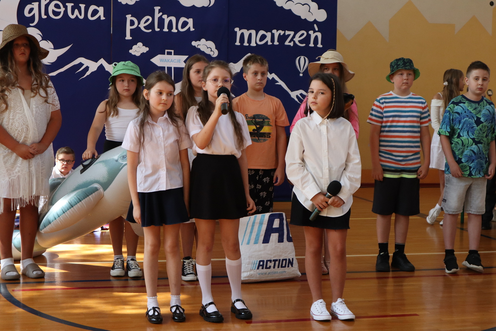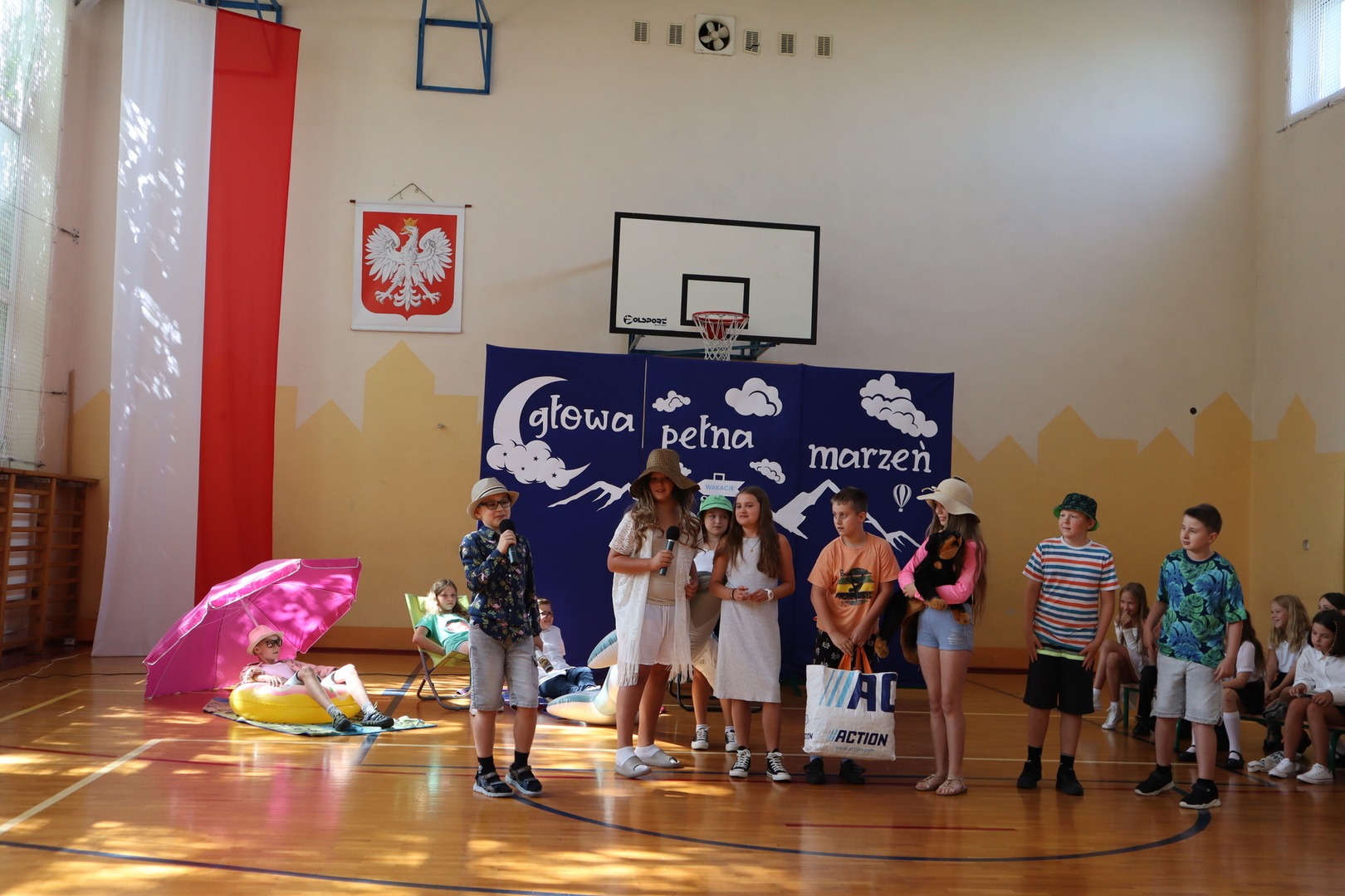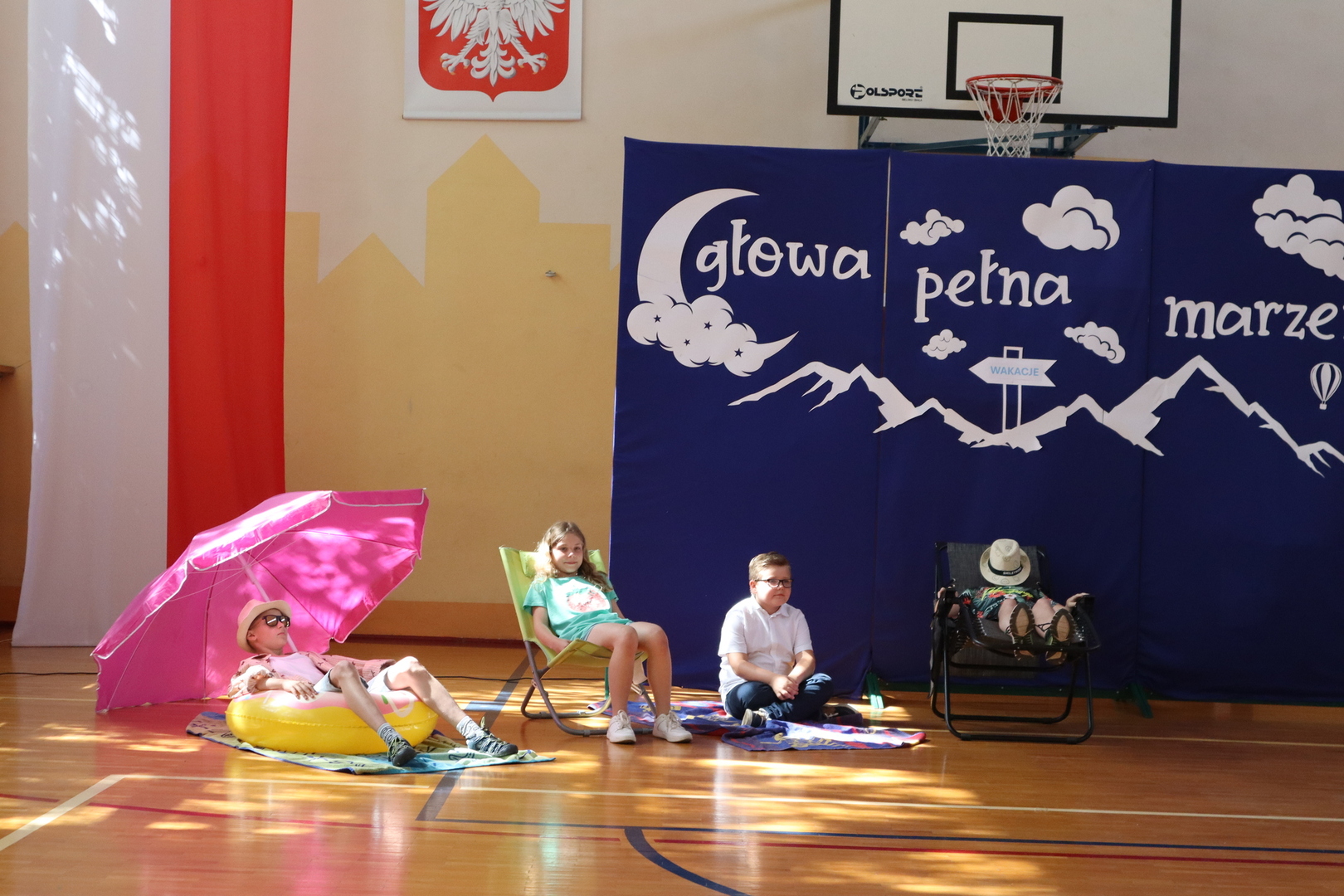 Po oficjalnych uroczystościach uczniowie klasy IV i II oraz Szkolny Chór zaprezentowali humorystyczną wakacyjną scenkę, w której przypomnieli wszystkim o zasadach bezpieczeństwa podczas wypoczynku.