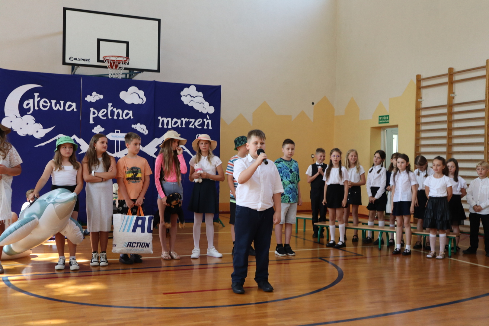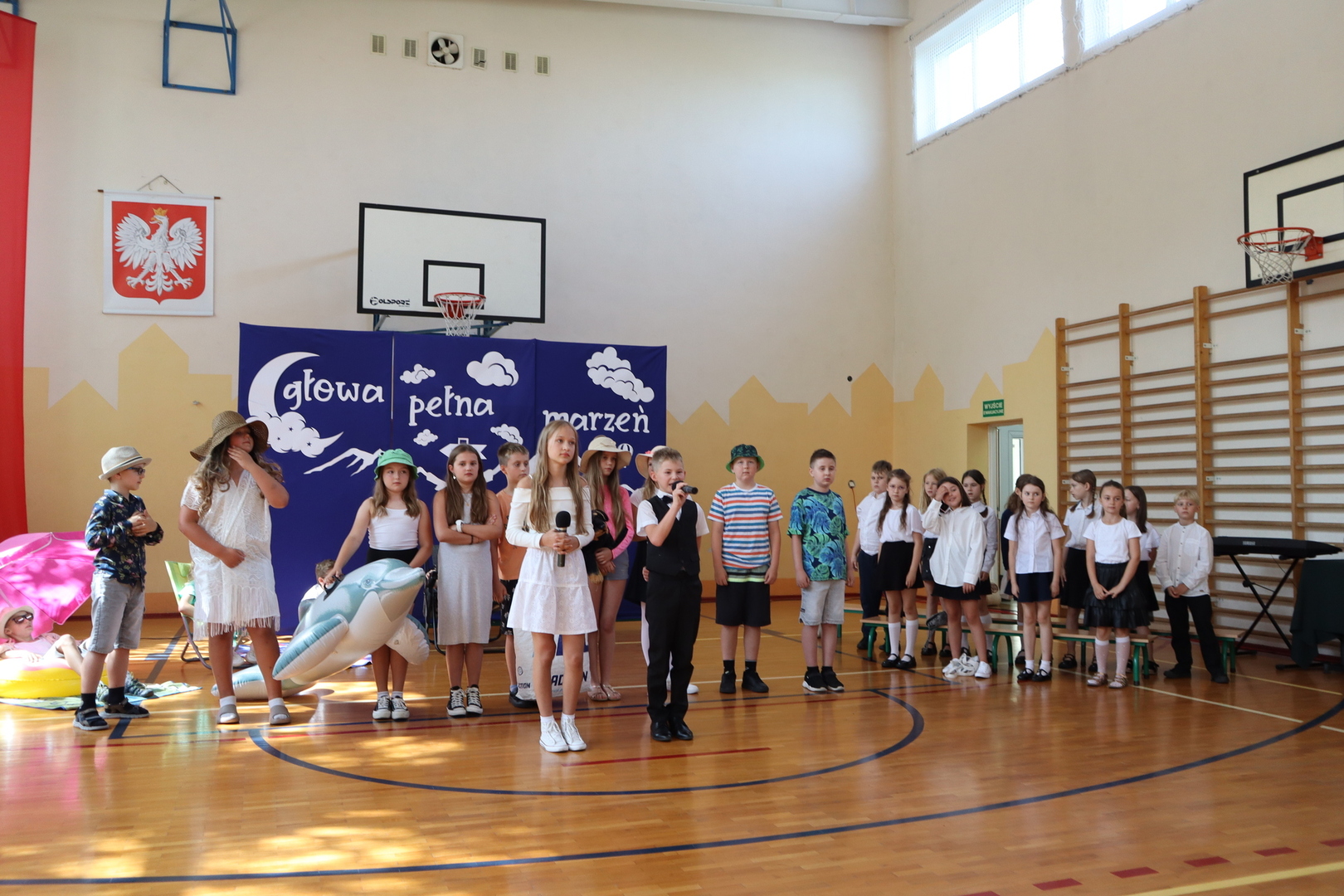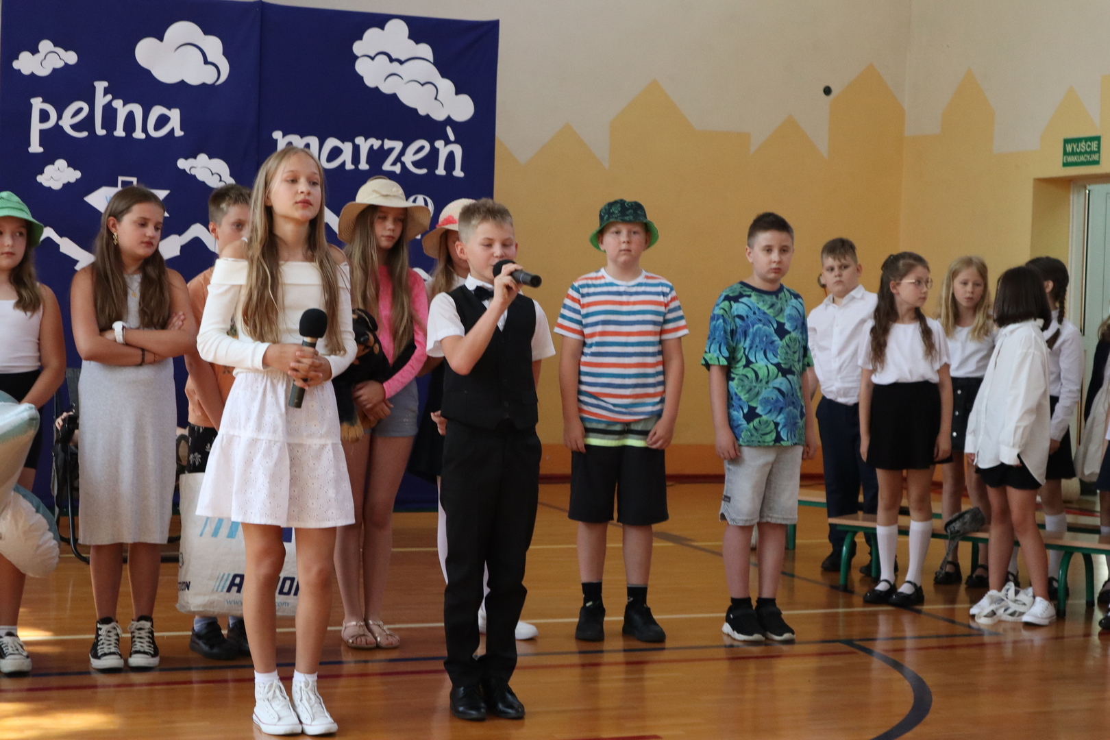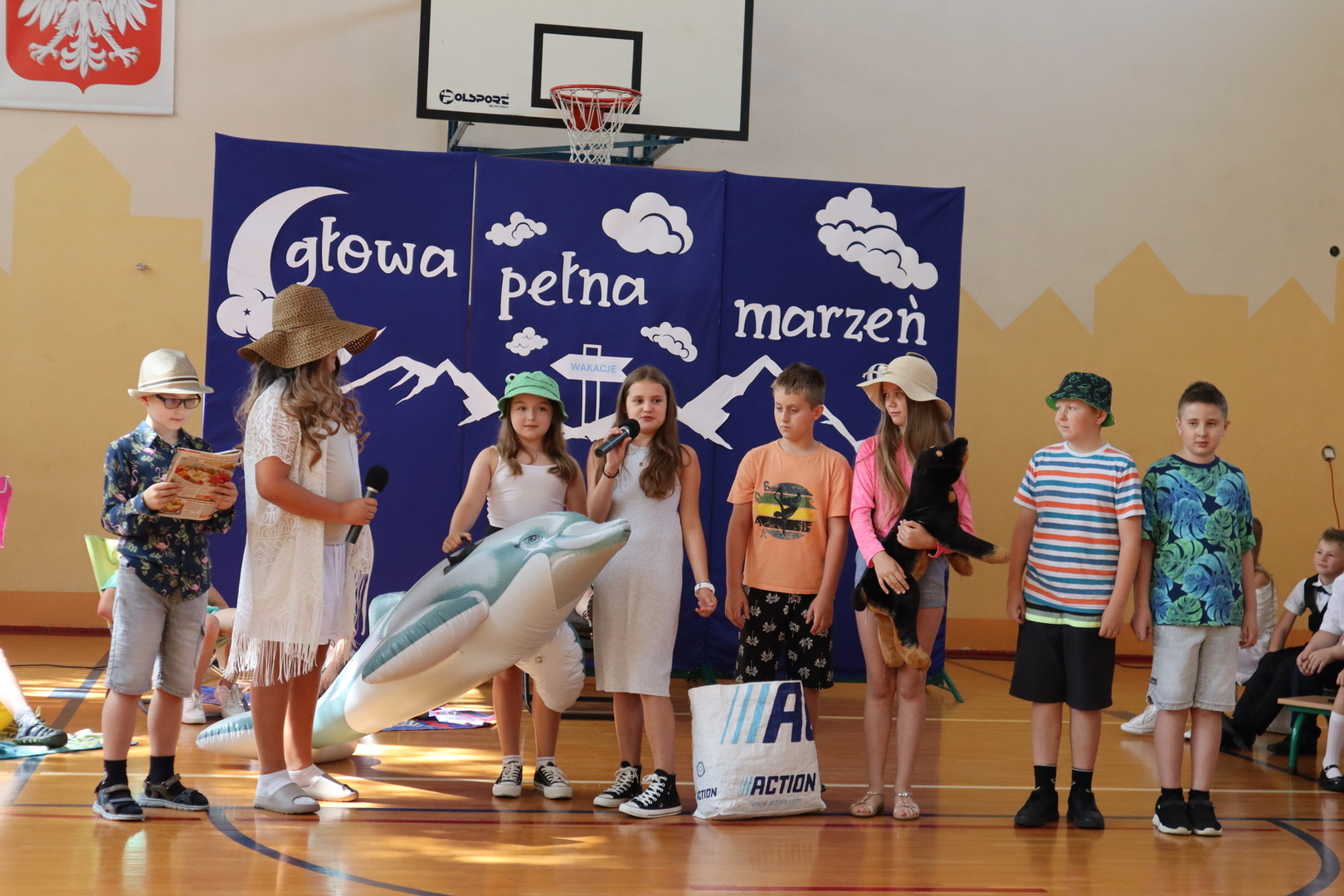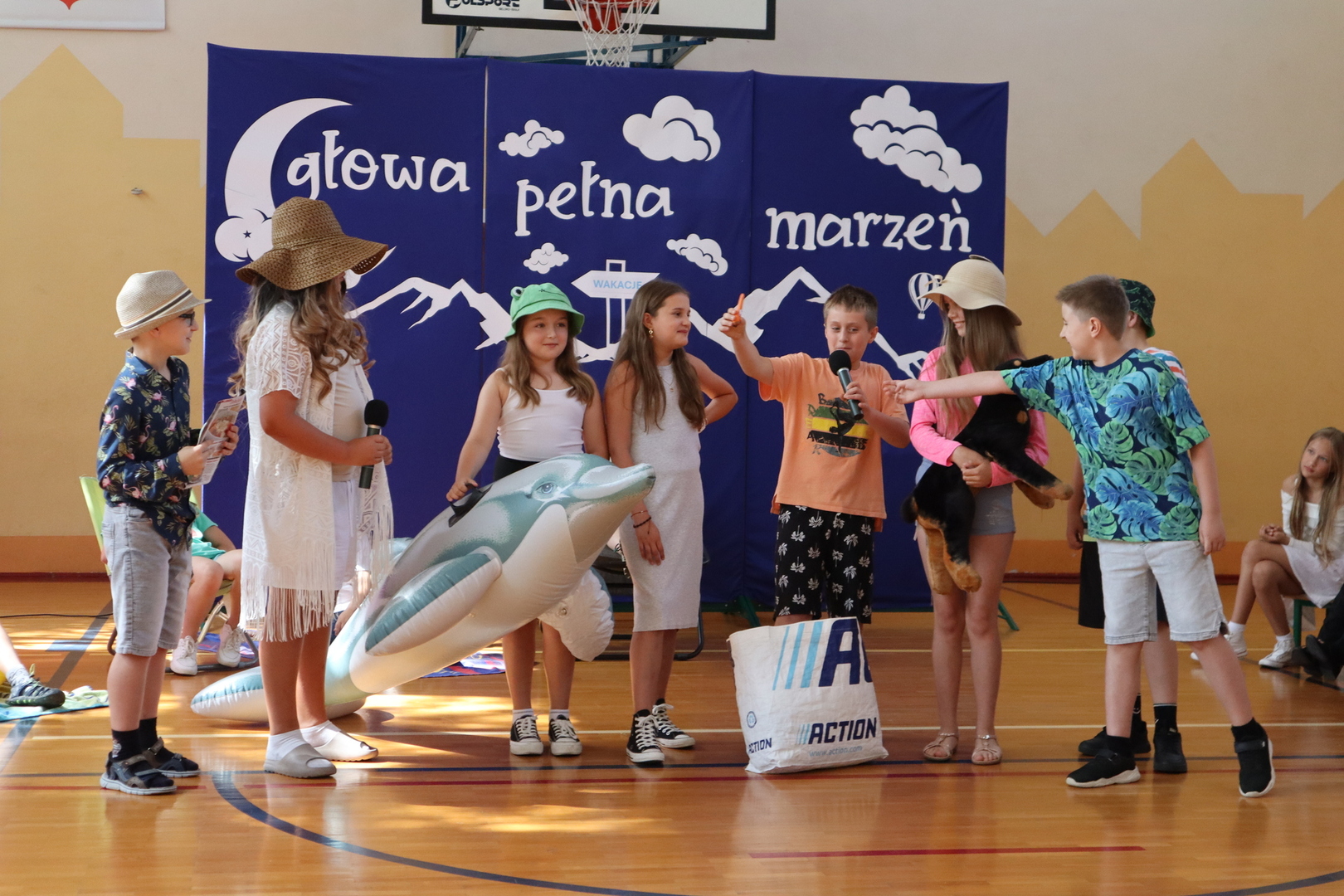 Po oficjalnych uroczystościach uczniowie klasy IV i II oraz Szkolny Chór zaprezentowali humorystyczną wakacyjną scenkę, w której przypomnieli wszystkim o zasadach bezpieczeństwa podczas wypoczynku.