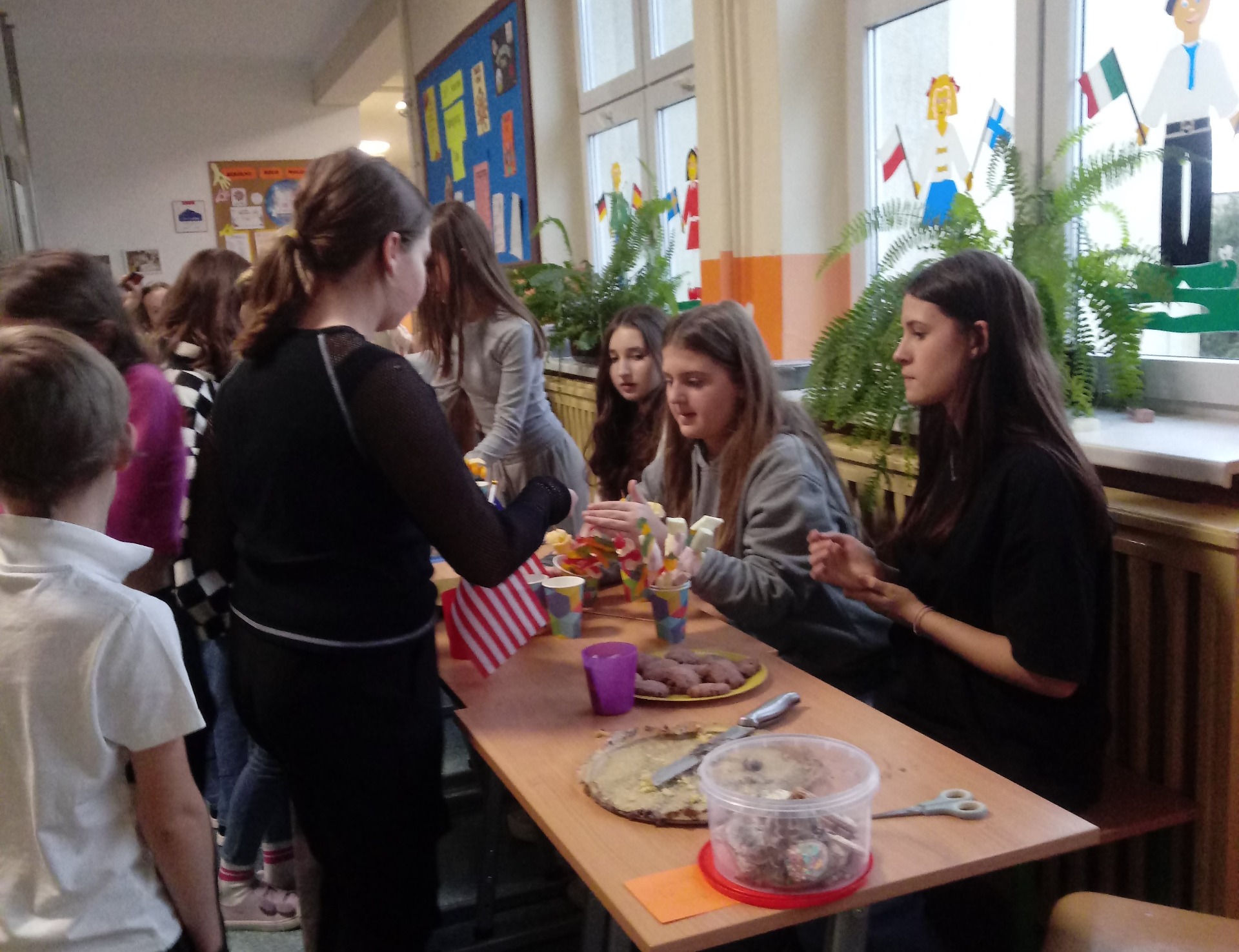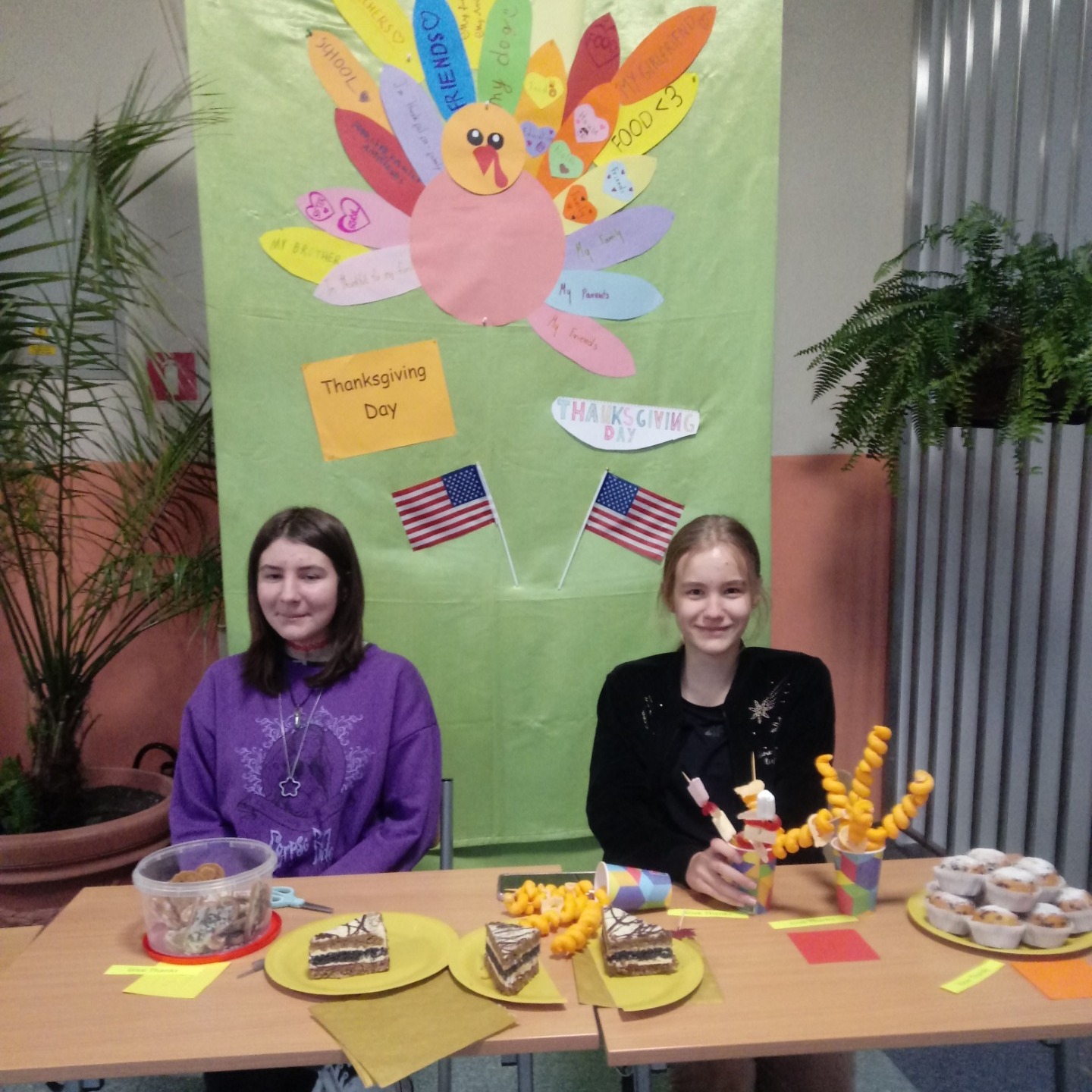 W ostatni czwartek listopada obchodziliśmy Thanksgiving Day czyli amerykańskie Święto Dziękczynienia w naszej szkole. Uczniowie klasy 7 pomogli w organizacji kiermaszu, na którym dominowały kolorowe słodkości. Za symboliczną złotówkę można było poczuć smak ciast, babeczek, pierników czy cukierkowych szaszłyków.