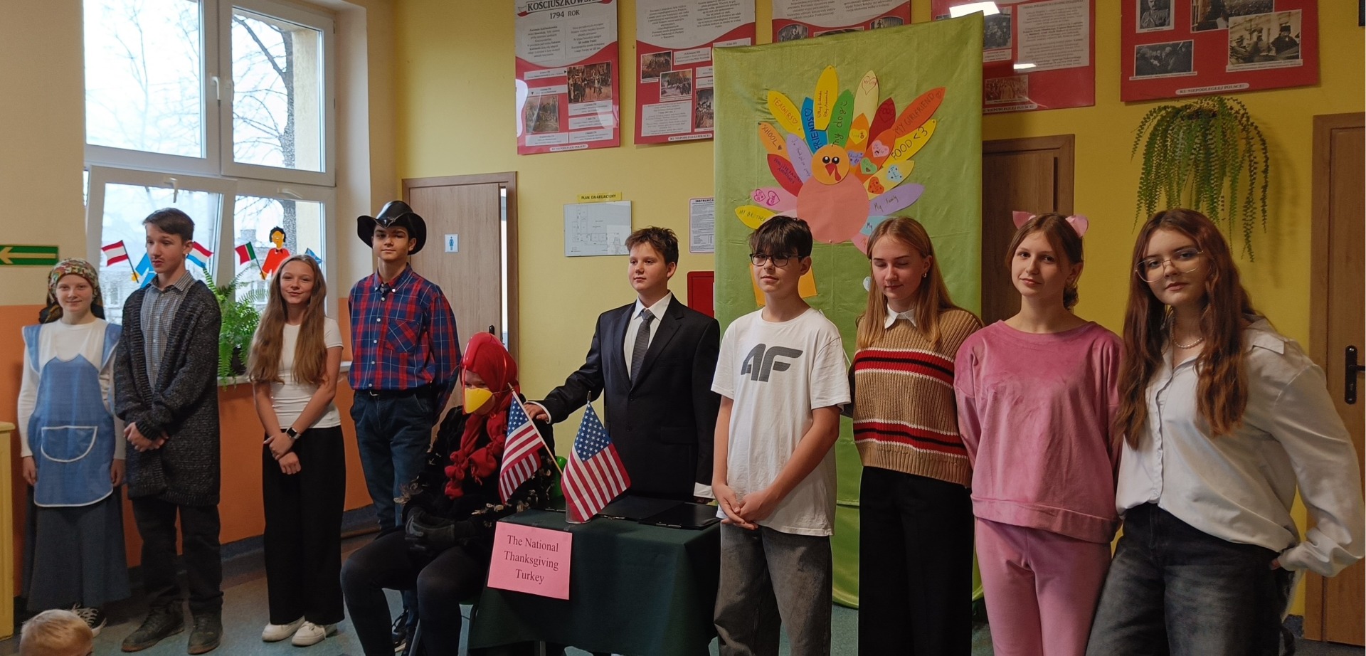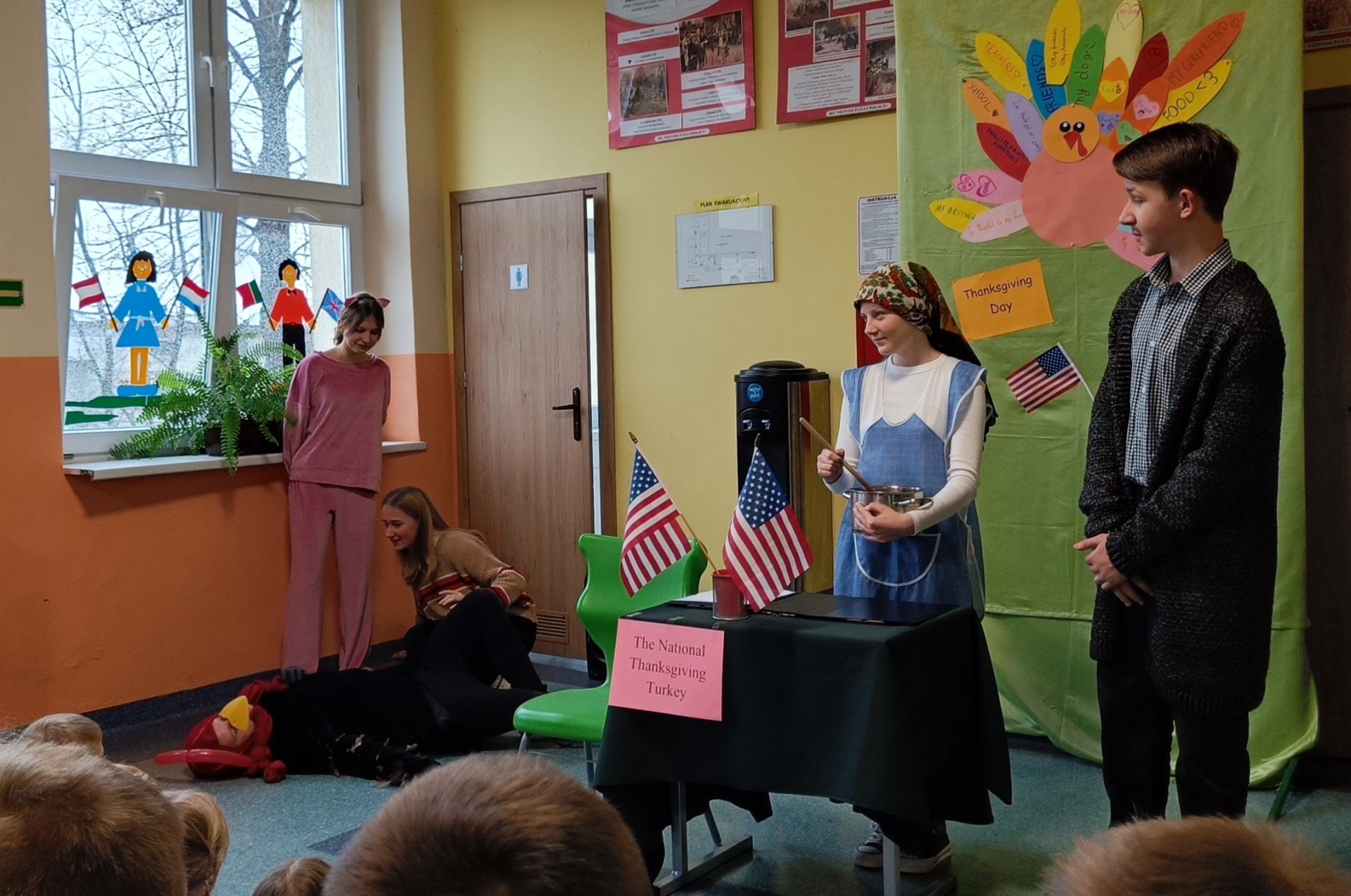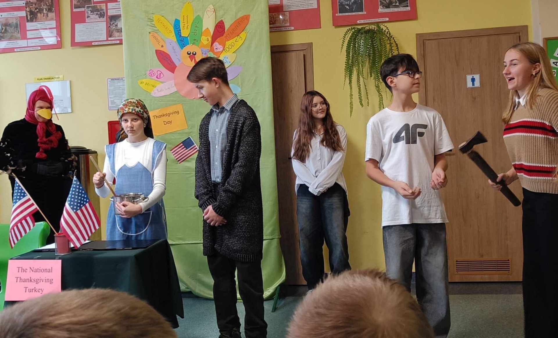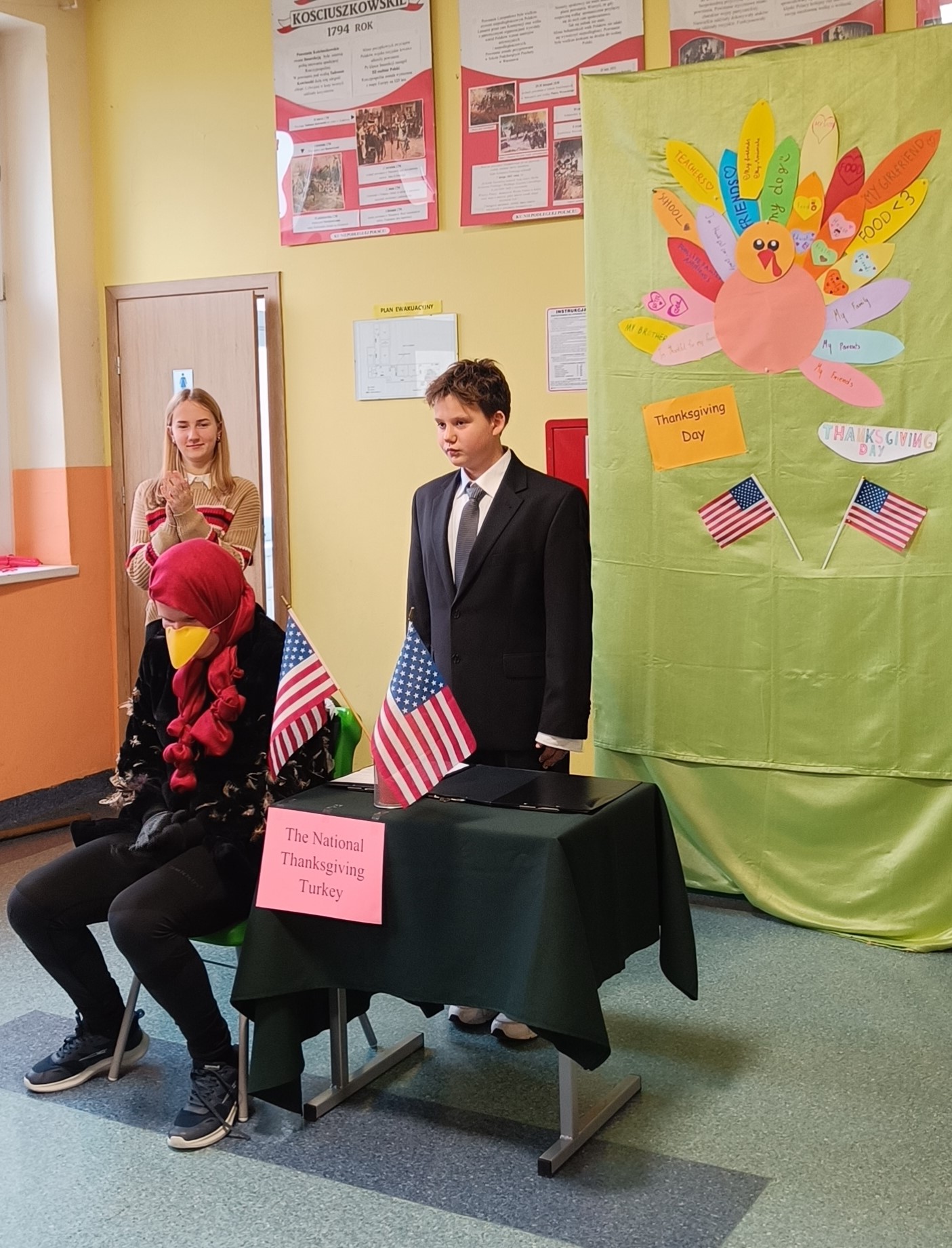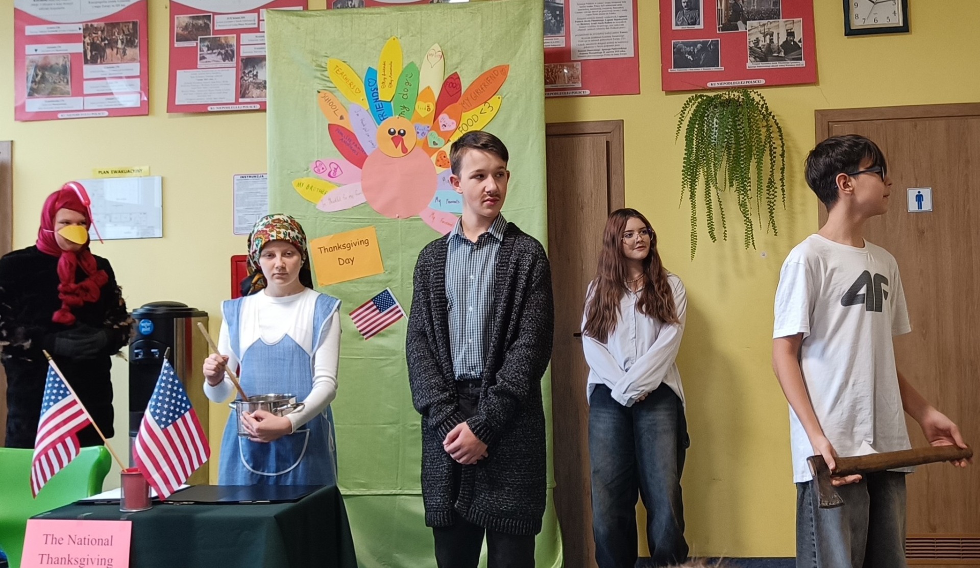 Podczas lekcji angielskiego uczniowie poznawali historię, zwyczaje i symbole związane ze świętem. W piątek 30 listopada uczniowie klasy 8 zapoznali młodszych kolegów z podstawowymi informacjami i specyfiką Święta Dziękczynienia. Przedstawili również sztukę ‘Terry and the Turkey’, w której w roli głównej wystąpił oczywiście tytułowy Indyk. Nie zabrakło również Prezydenta i amerykańskiej rodziny.