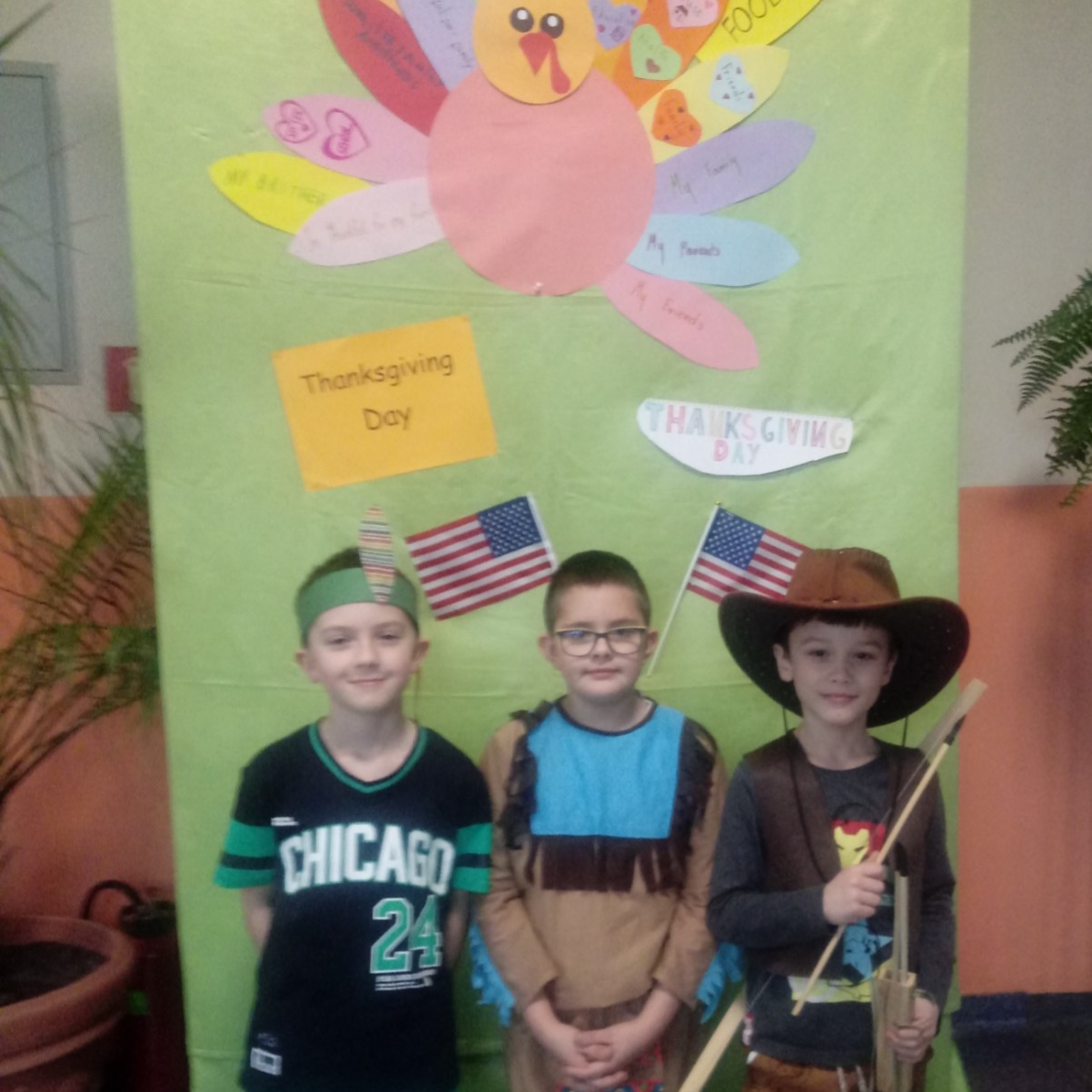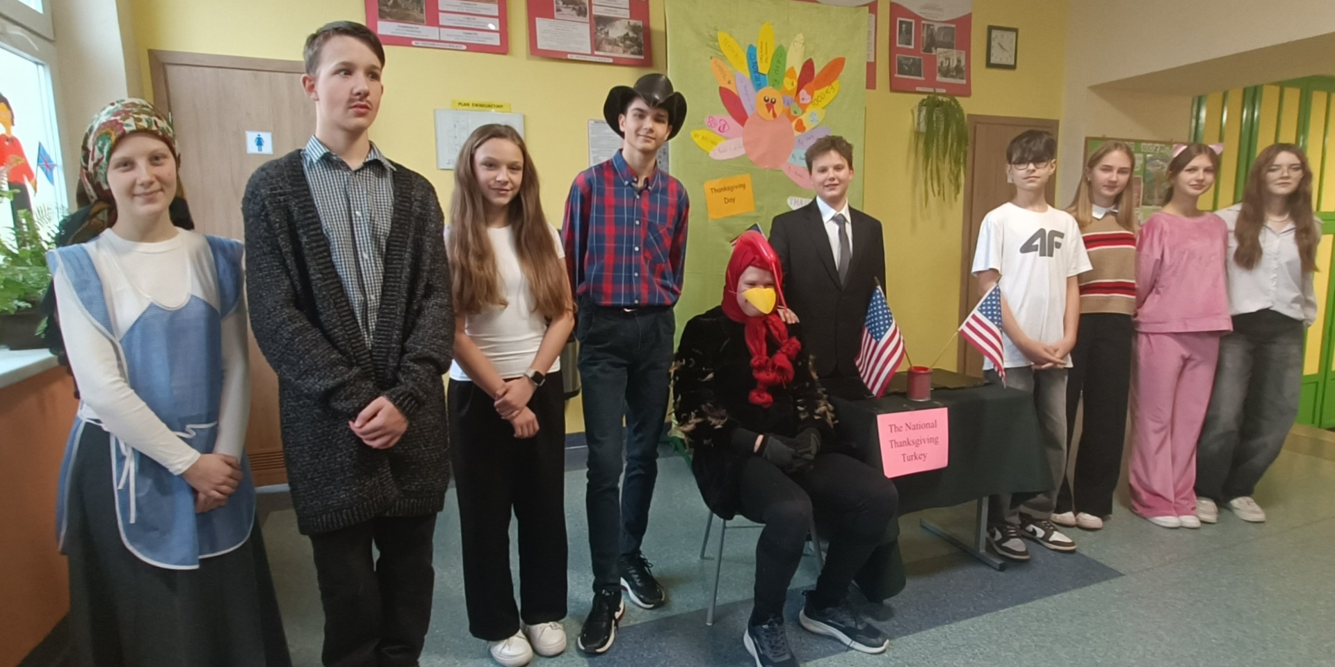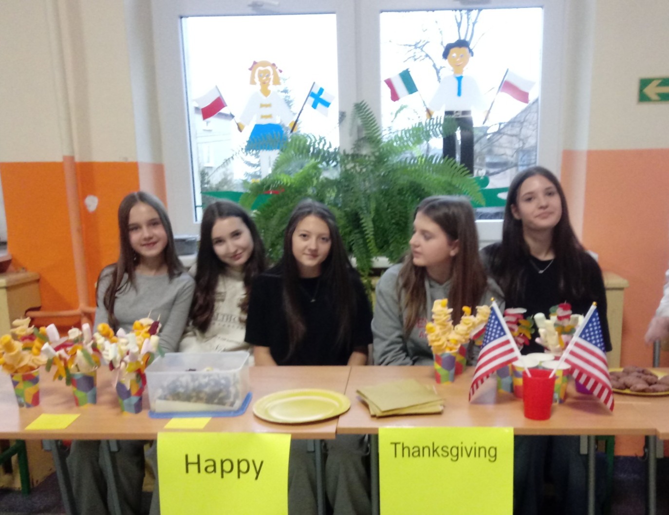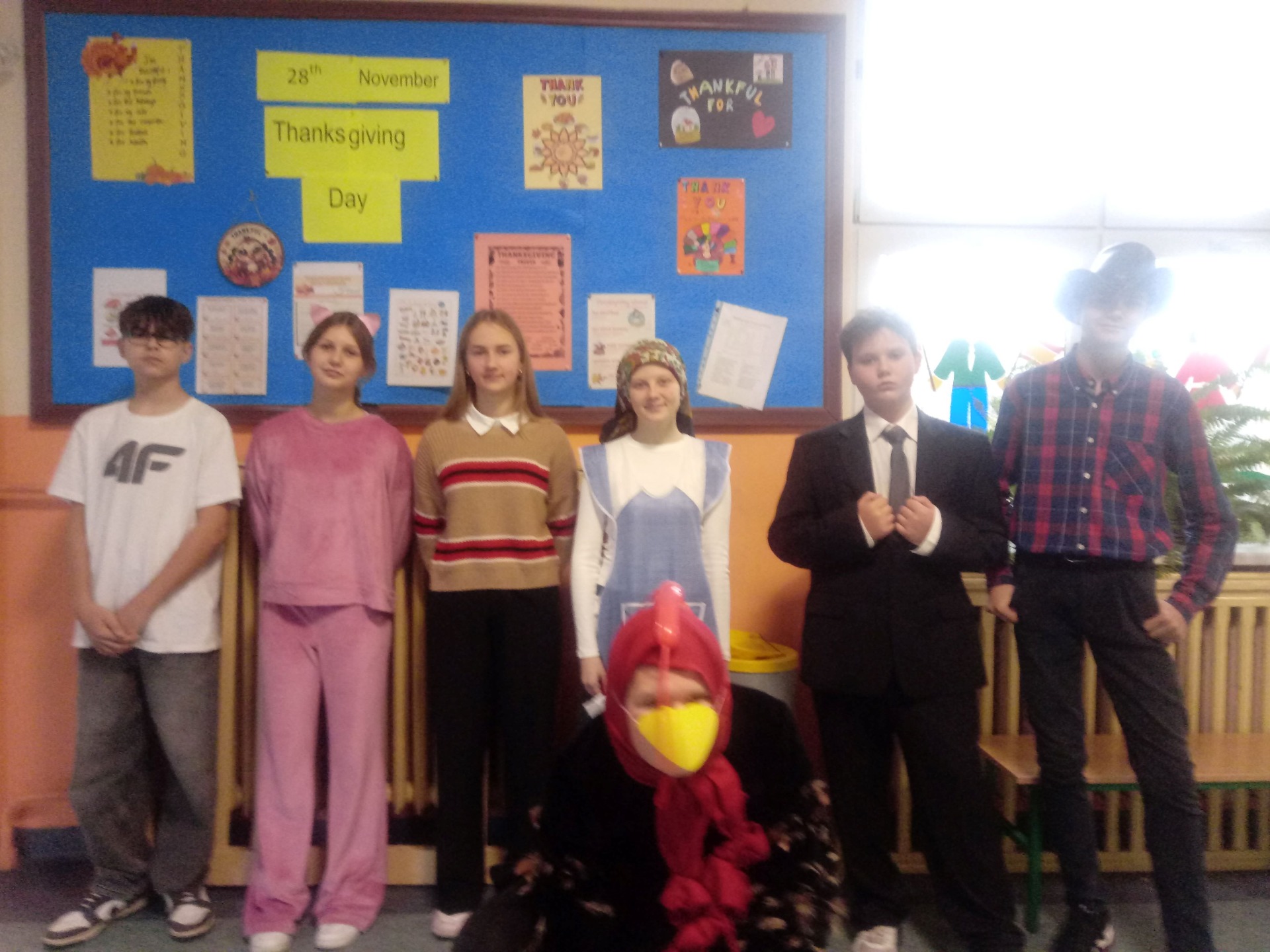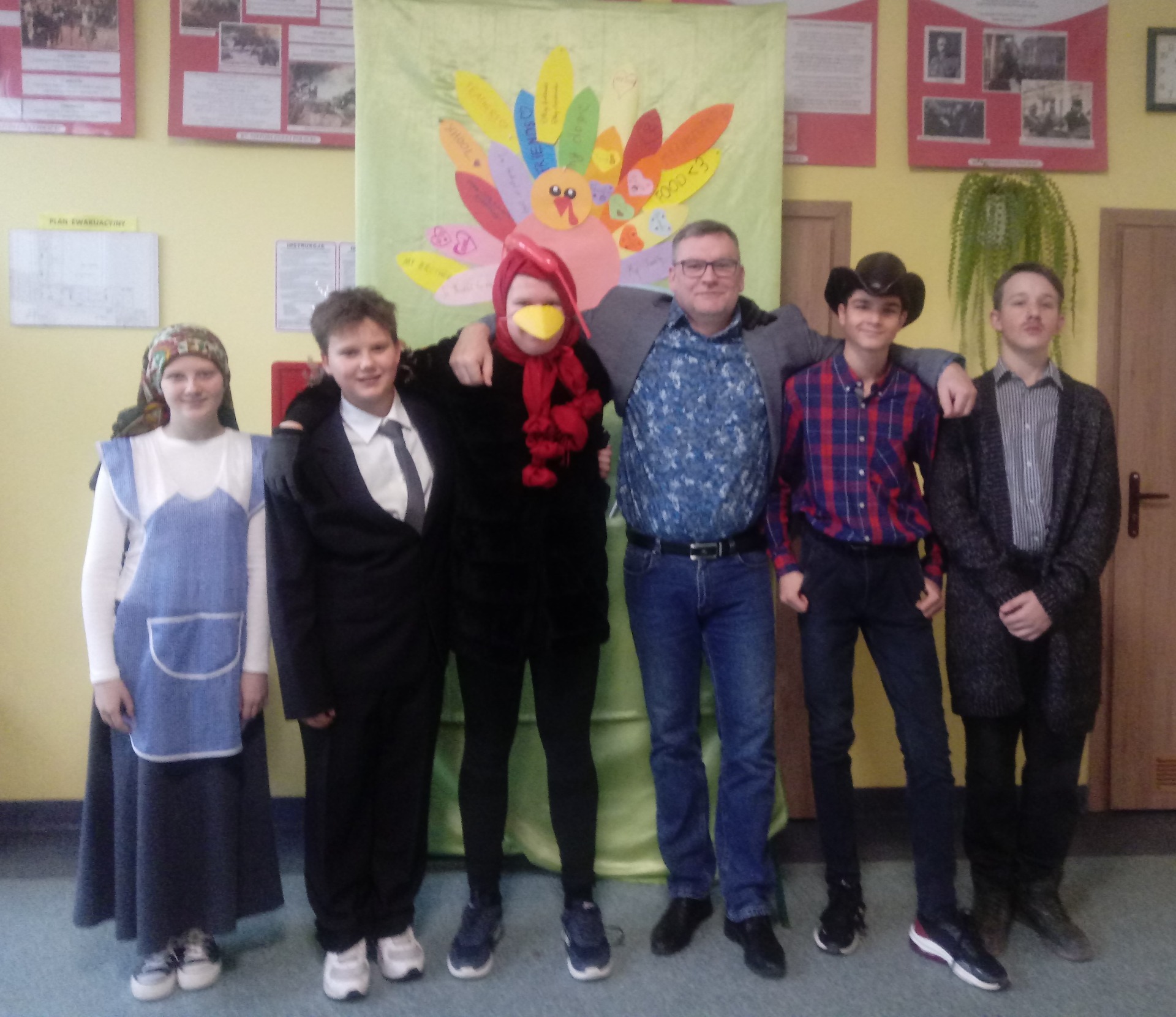 Podczas lekcji angielskiego uczniowie poznawali historię, zwyczaje i symbole związane ze świętem. W piątek 30 listopada uczniowie klasy 8 zapoznali młodszych kolegów z podstawowymi informacjami i specyfiką Święta Dziękczynienia. Przedstawili również sztukę ‘Terry and the Turkey’, w której w roli głównej wystąpił oczywiście tytułowy Indyk. Nie zabrakło również Prezydenta i amerykańskiej rodziny.