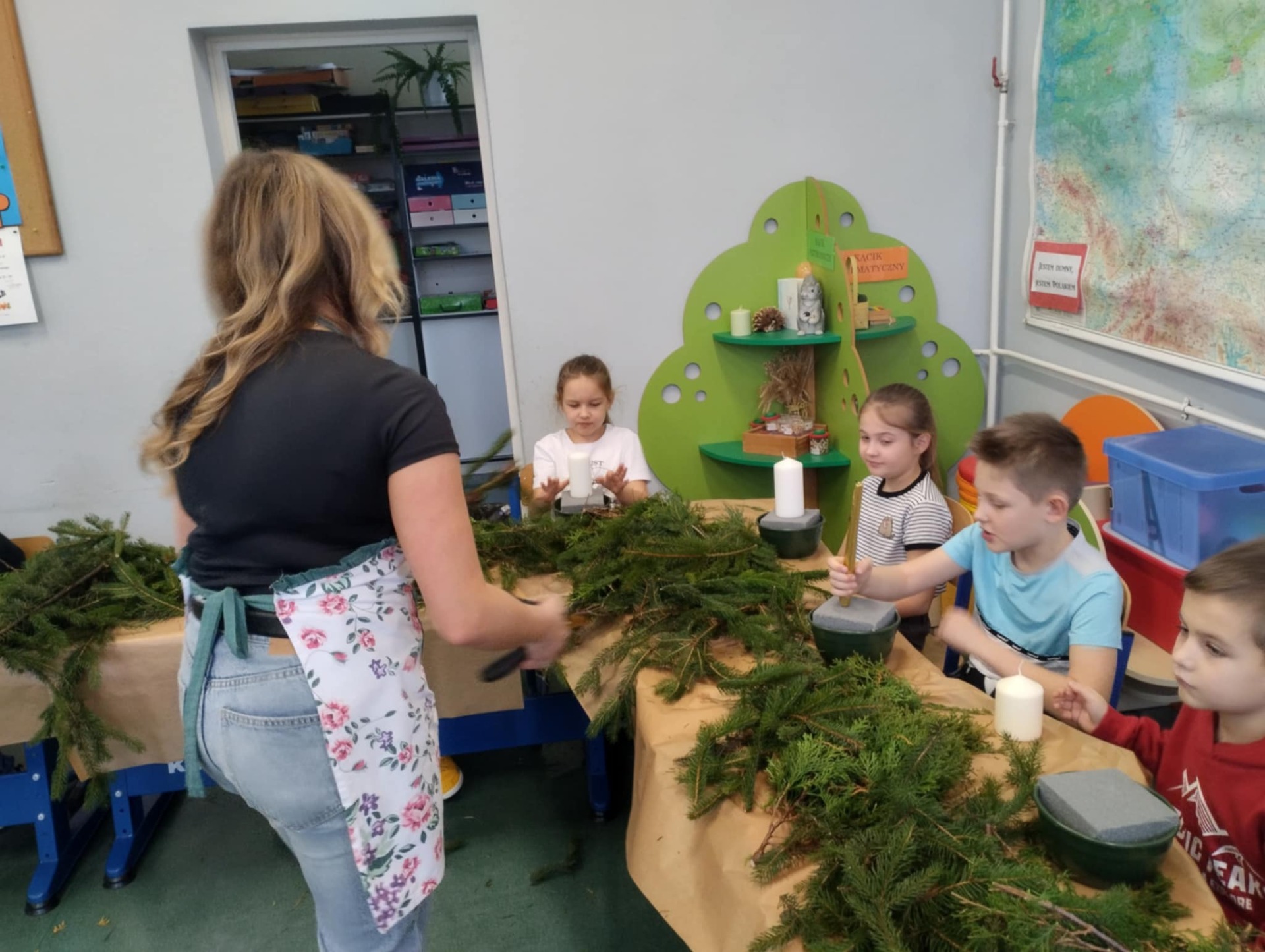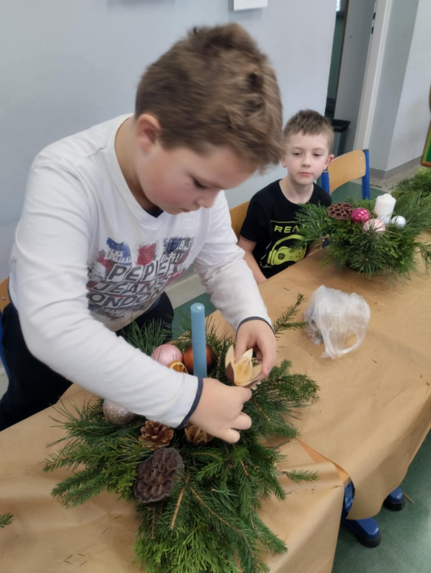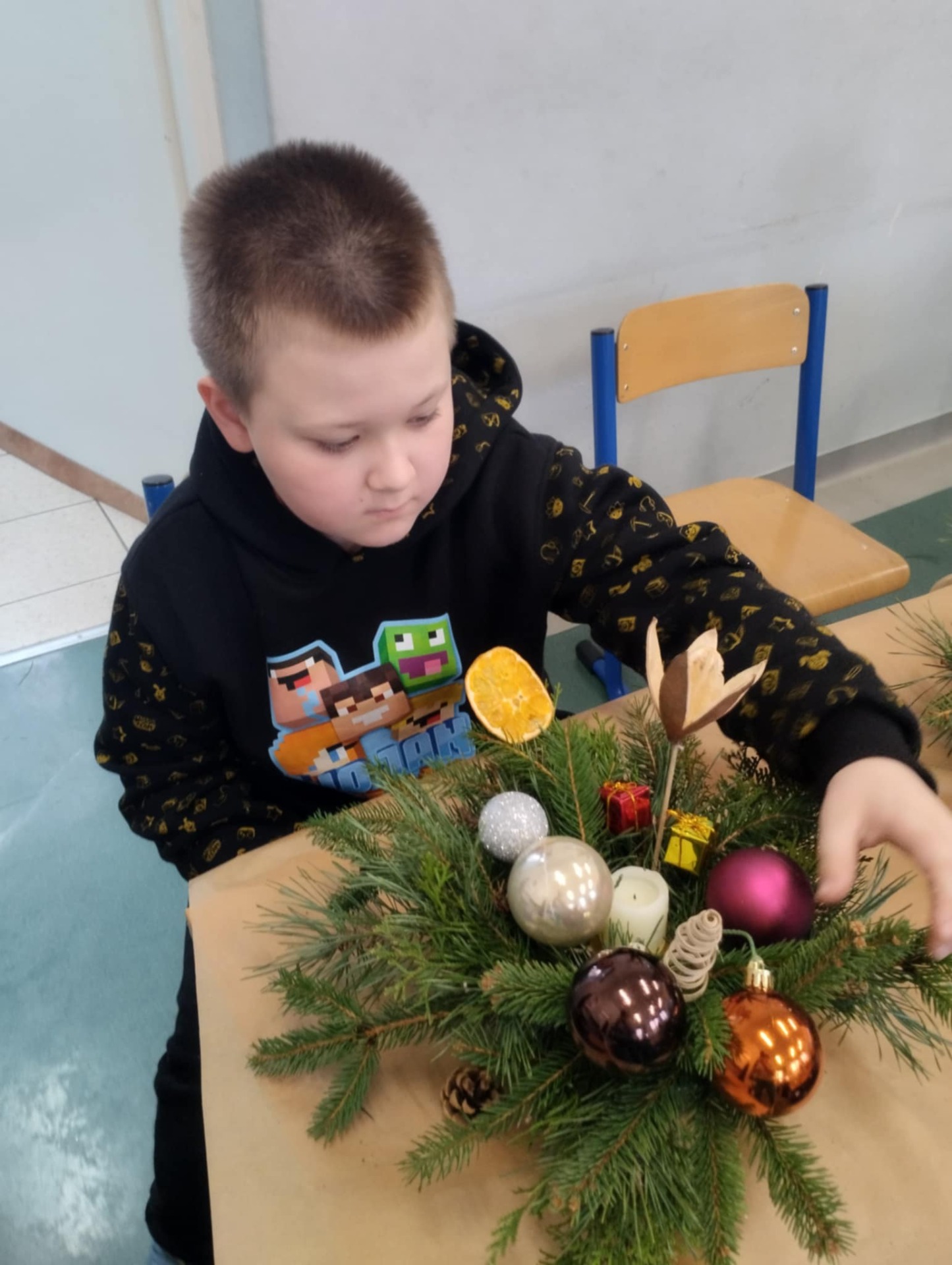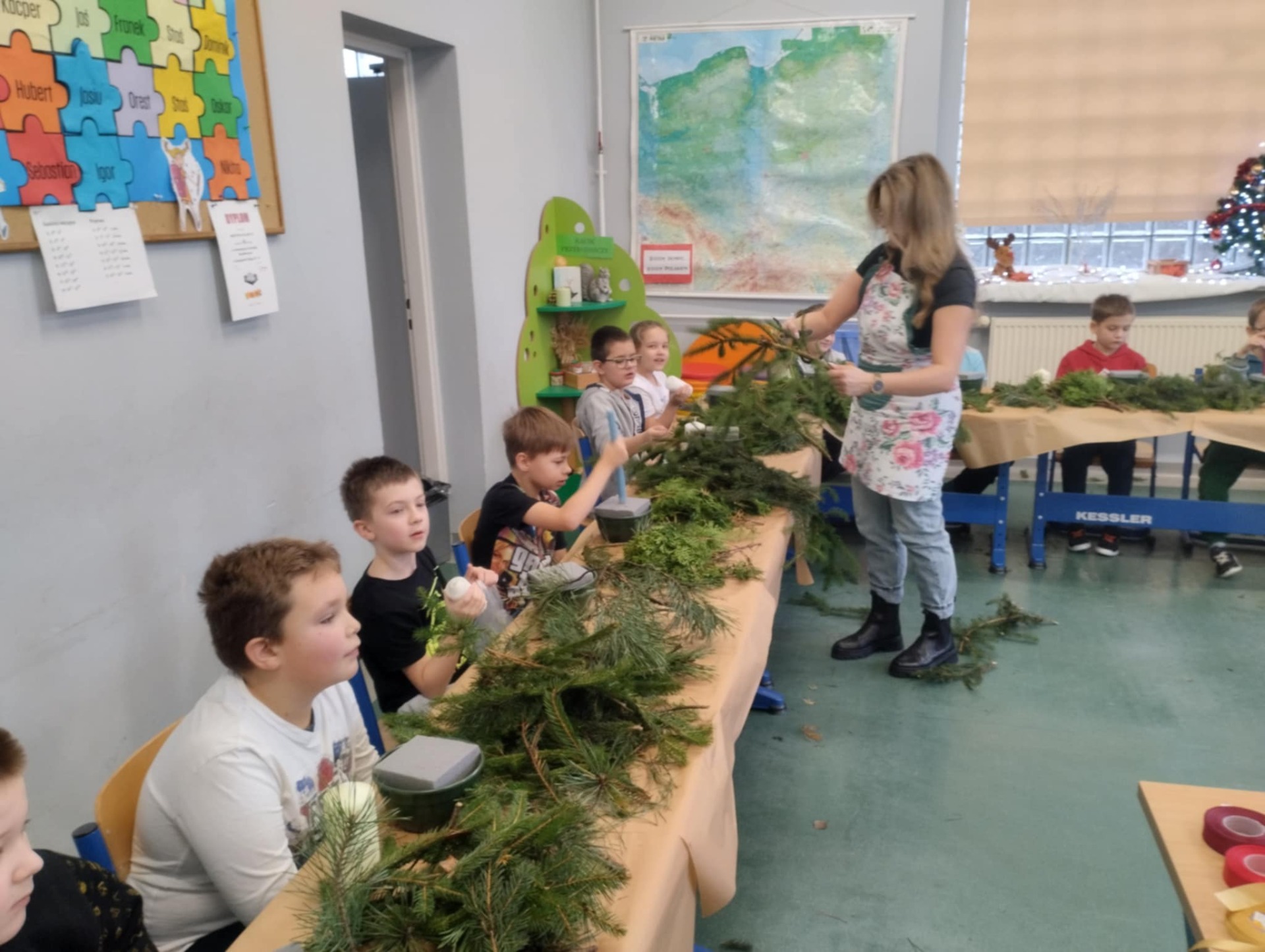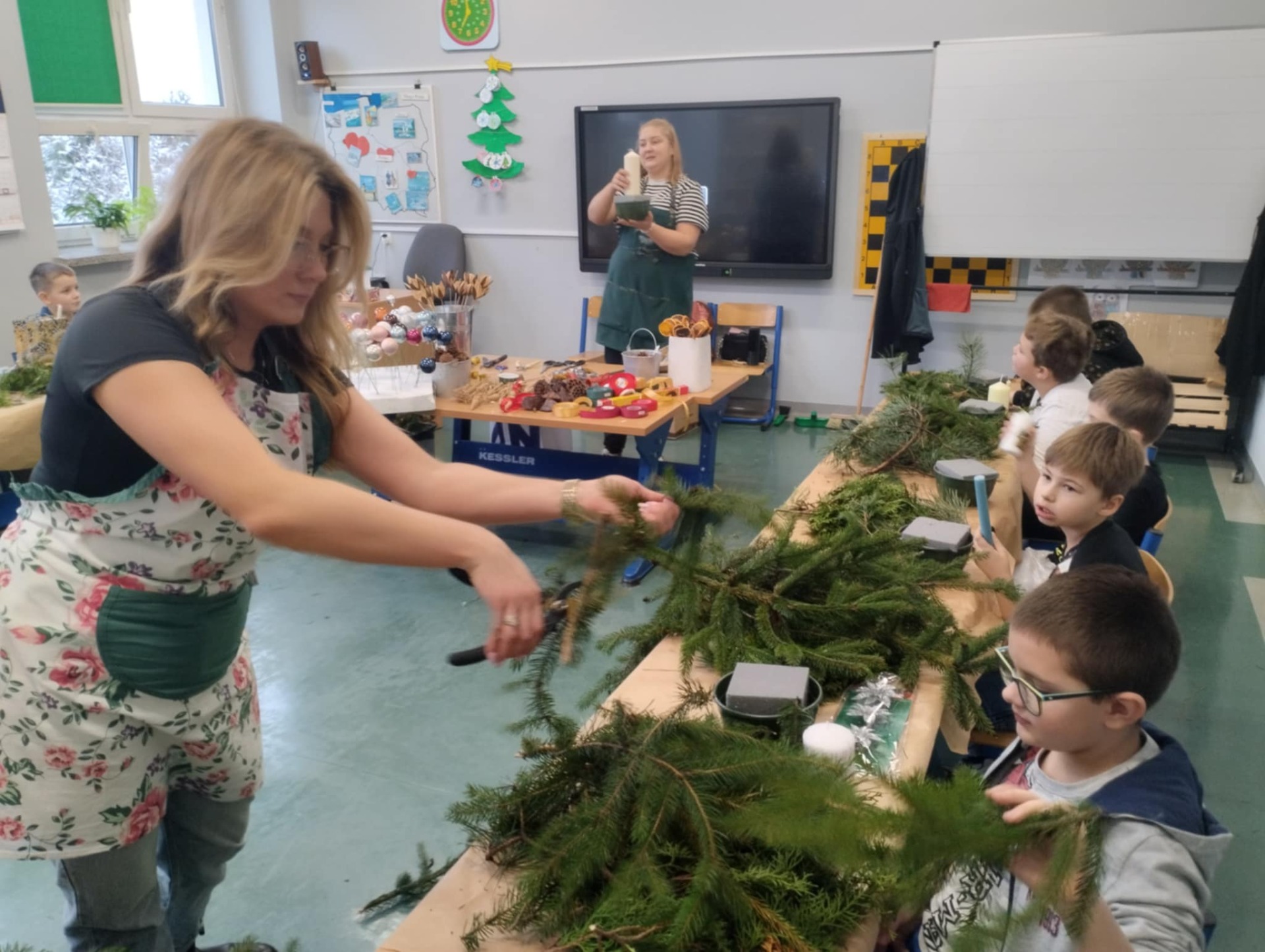 W trakcie zajęć uczniowie tworzyli świąteczne dekoracje z żywych gałązek jodły, świerku, sosny i tui. Całość kompozycji dopełniały świąteczne ozdoby: bombki, suszone cytrusy, naturalne okazy przyrodnicze, kokardki i świeczki.