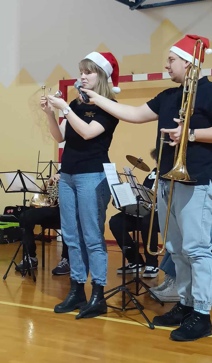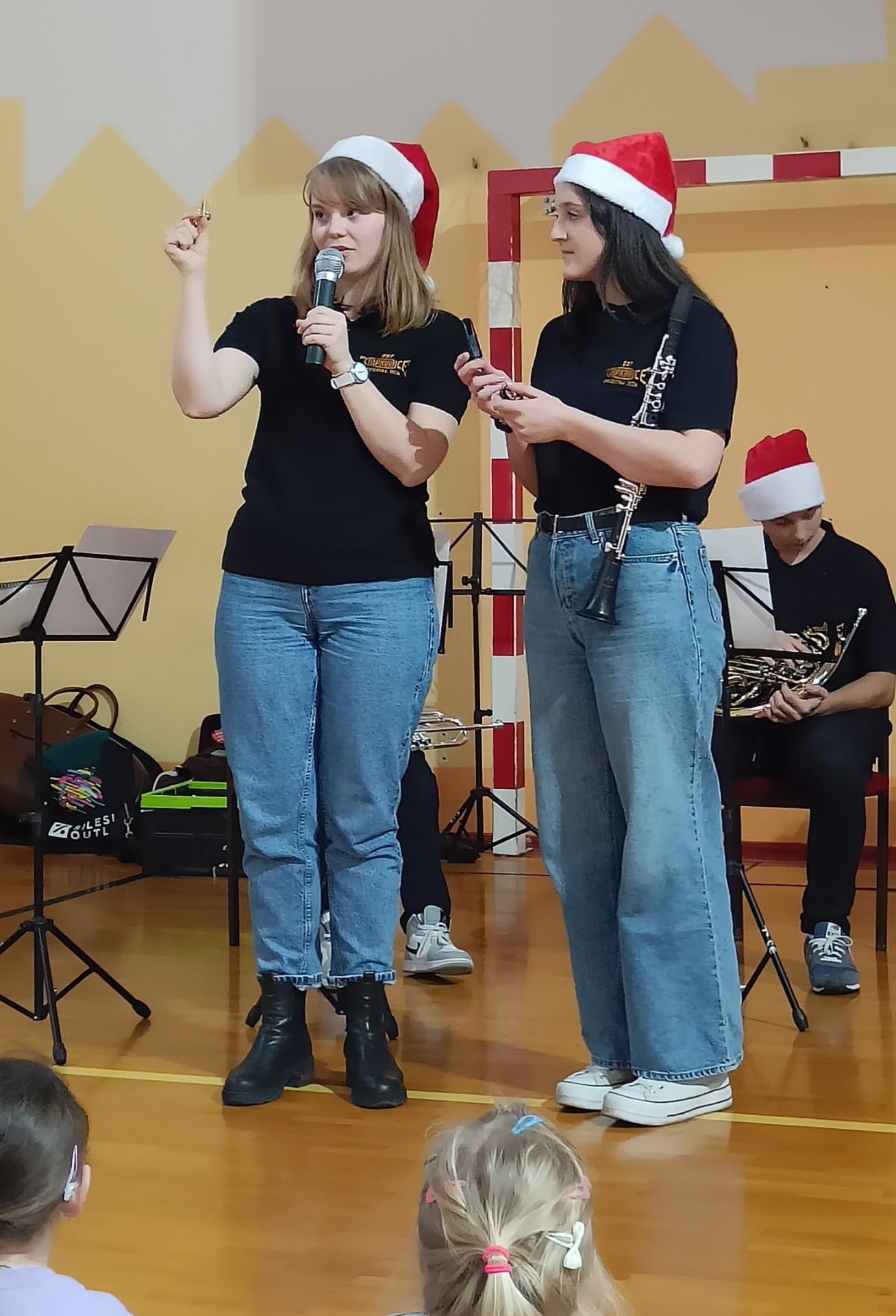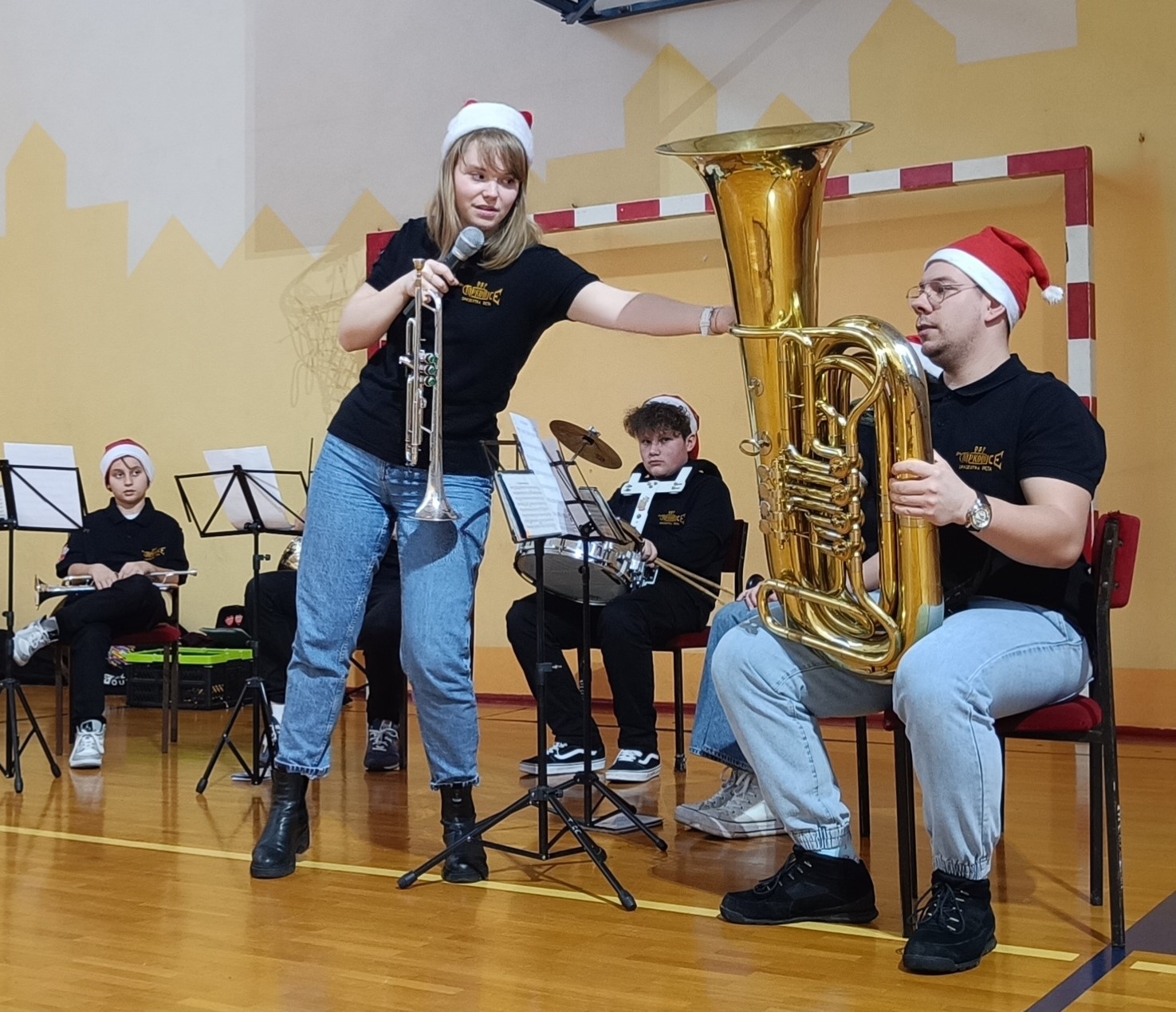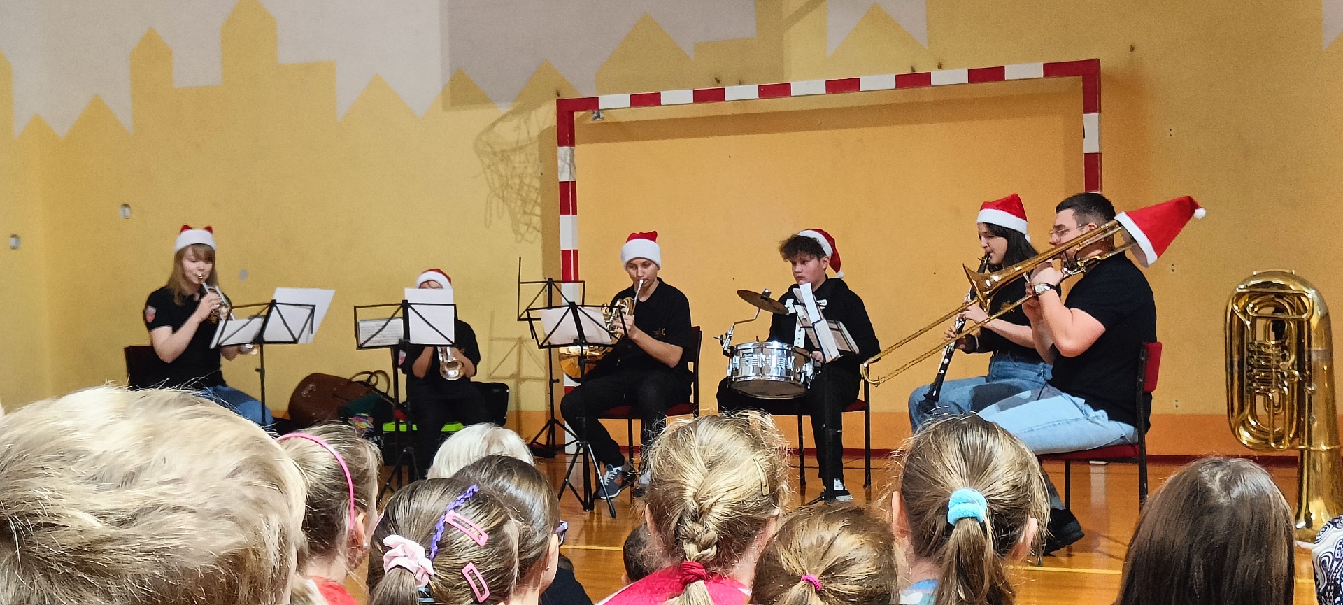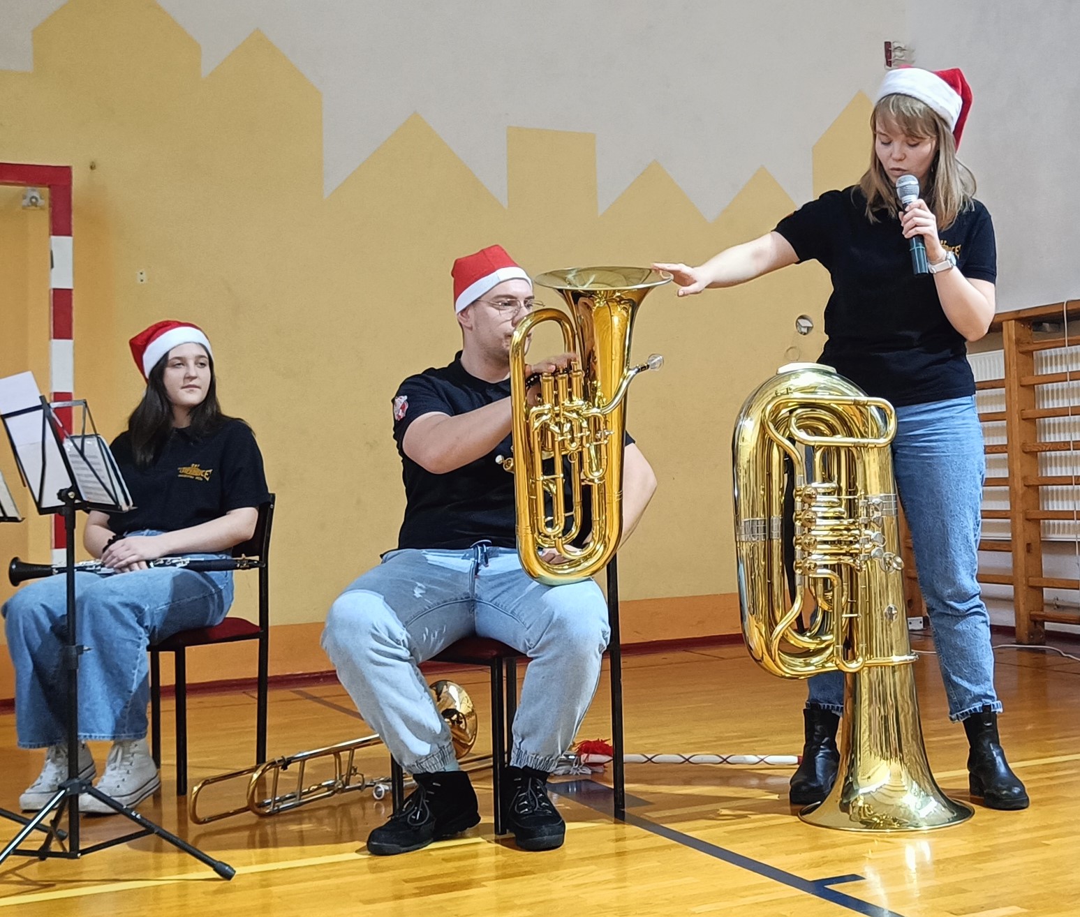 12 grudnia gościliśmy w naszej szkole muzyków z orkiestry dętej OSP w Tąpkowicach. Młodzi artyści wprowadzili nas w zaczarowany świat muzyki dźwiękami trąbki, waltorni, tuby, puzonu, klarnetu oraz instrumentów perkusyjnych. Publiczność miała okazję poznać instrumenty dęte poprzez bezpośredni kontakt z nimi, a muzyka grana na żywo pozwoliła zapoznać się z ich brzmieniem. Muzycy w prosty, przystępny i ciekawy sposób przybliżyli uczniom informacje związane z grupą instrumentów dętych i perkusyjnych, a przy okazji przypomnieli elementy muzyki i jej określenia. W trakcie świątecznej aydycji muzycznej mogliśmy usłyszeć popularne melodie świąteczne z całego świata, które rozgrzewały nasze serca przygotowując na nadejście magicznej atmosfery świąt.🎄