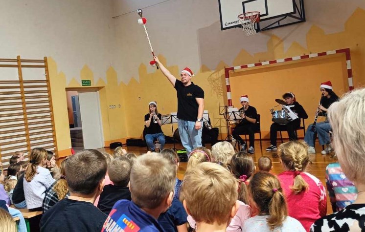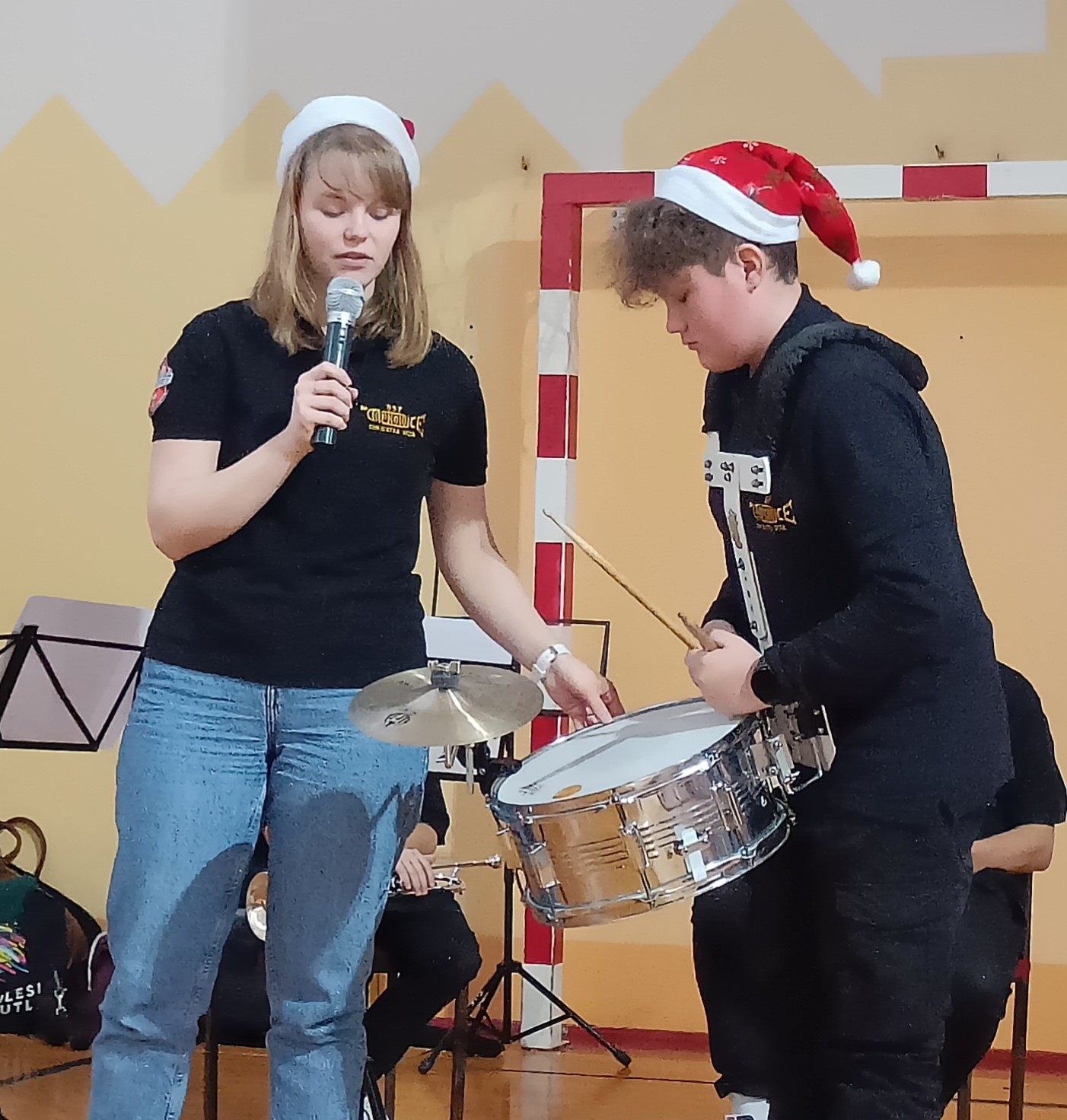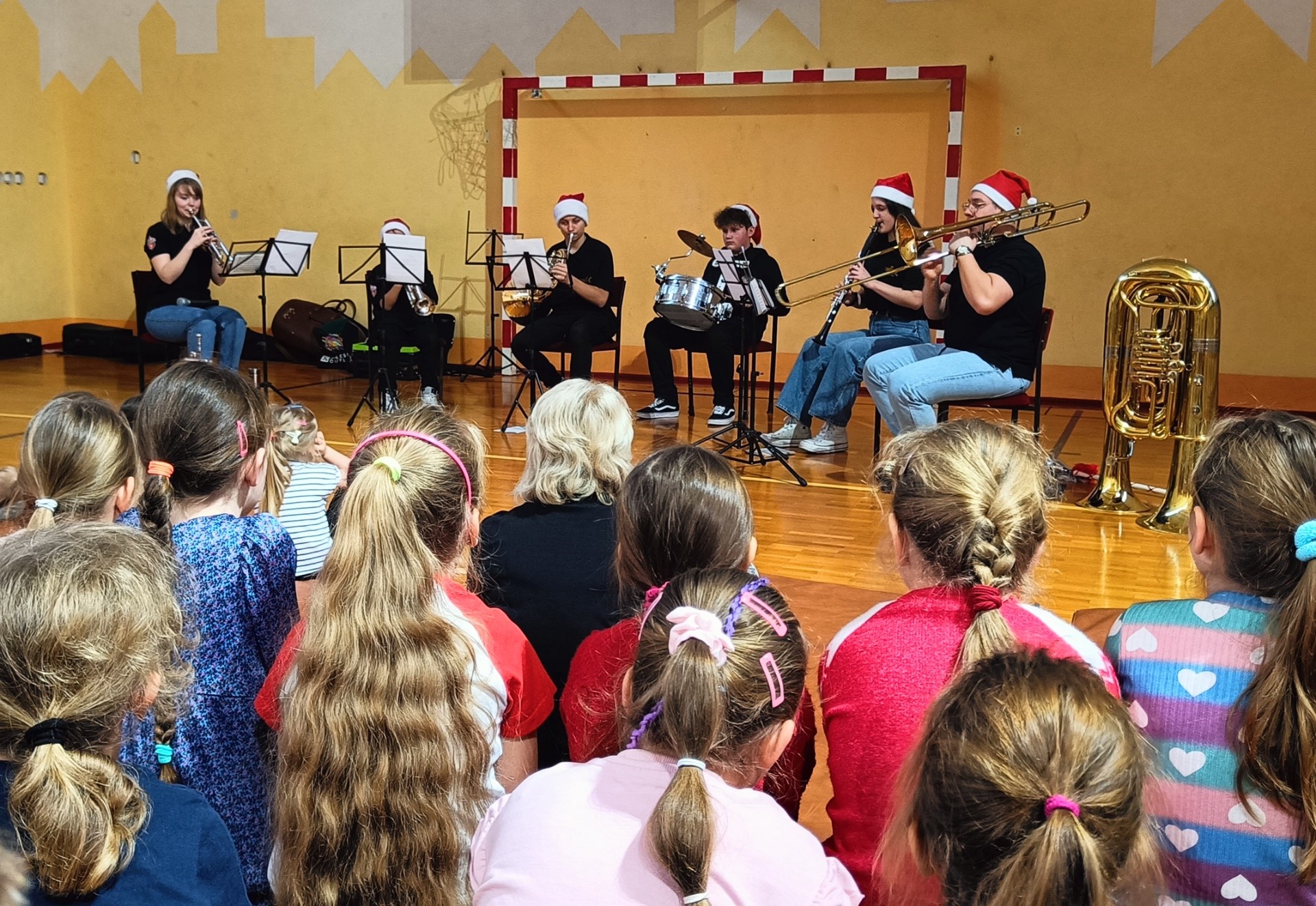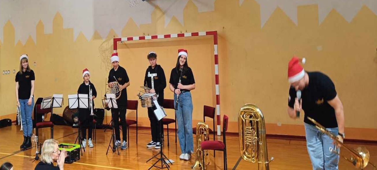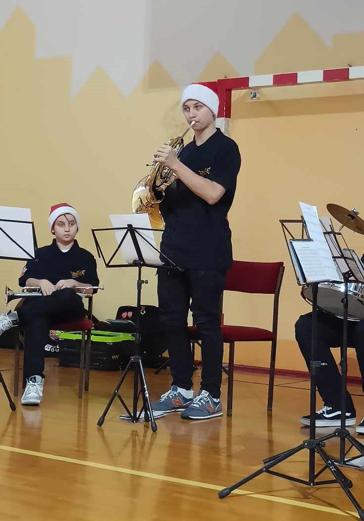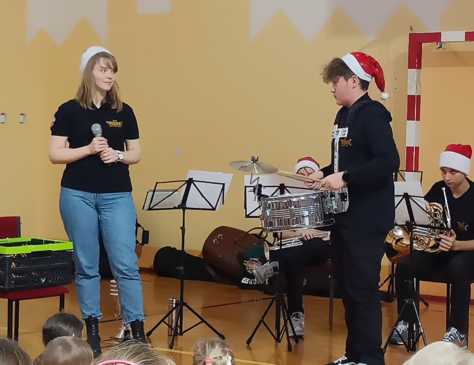 12 grudnia gościliśmy w naszej szkole muzyków z orkiestry dętej OSP w Tąpkowicach. Młodzi artyści wprowadzili nas w zaczarowany świat muzyki dźwiękami trąbki, waltorni, tuby, puzonu, klarnetu oraz instrumentów perkusyjnych. Publiczność miała okazję poznać instrumenty dęte poprzez bezpośredni kontakt z nimi, a muzyka grana na żywo pozwoliła zapoznać się z ich brzmieniem. Muzycy w prosty, przystępny i ciekawy sposób przybliżyli uczniom informacje związane z grupą instrumentów dętych i perkusyjnych, a przy okazji przypomnieli elementy muzyki i jej określenia. W trakcie świątecznej aydycji muzycznej mogliśmy usłyszeć popularne melodie świąteczne z całego świata, które rozgrzewały nasze serca przygotowując na nadejście magicznej atmosfery świąt.🎄