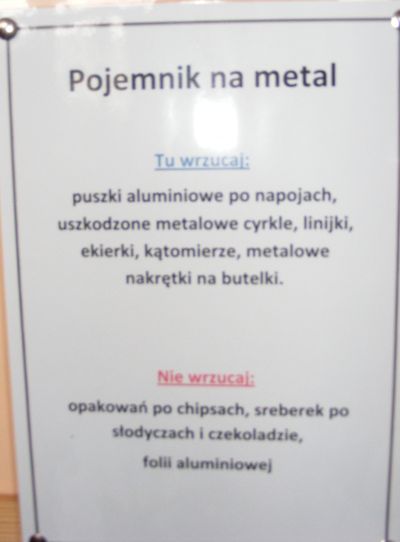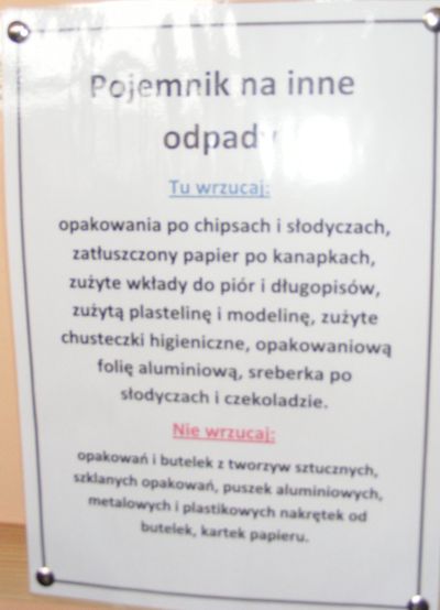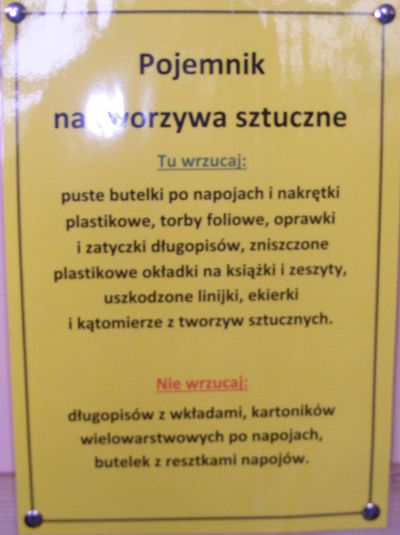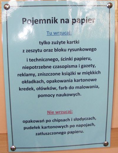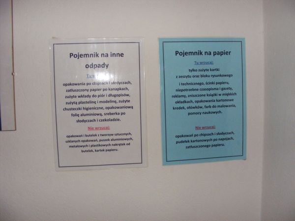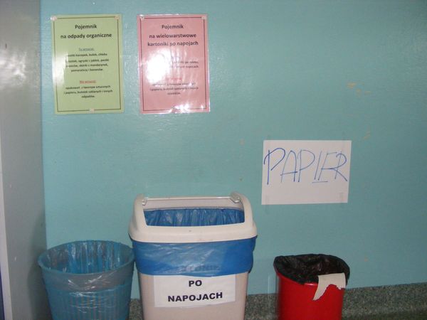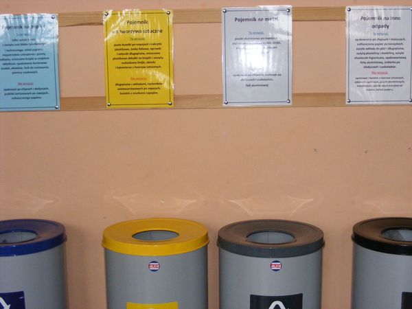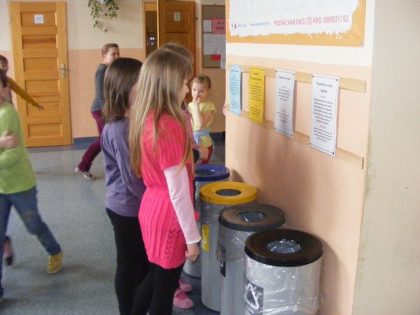 Jakiś czas temu w naszej szkole rozpoczęliśmy bardzo pożyteczną akcję, polegającą na segregacji śmieci. 1 marca na apelu pani Dorota Surma wytłumaczyła uczniom, do jakiego kosza należy wrzucać poszczególne odpady. Każdy kontener jest opisany, dzięki czemu nie ma mowy o pomyłce. Pani Surma i inne panie wytłumaczyły nam też, czego nie powinniśmy wrzucać na przykład do kosza z napisem „papier”. Pewnie trochę czasu minie zanim idealnie będziemy dzielić śmieci, jednak już teraz dzięki naszej akcji jesteśmy bardziej przyjaźni środowisku. Aby sprawdzić, czy wiemy co gdzie wyrzucamy, pani Surma ogłosiła konkurs na najlepszy plakat dotyczący segregacji śmieci. Ocenie będą podlegać nie tylko nasze zdolności artystyczne, ale i wiedza dotycząca segregacji. Jesteśmy przekonani, że nasze prace spodobają się zacnemu jury. Wyniki już wkrótce, a my jako uczniowie szkoły także apelujemy do naszych młodszych i starszych kolegów, by starali się wrzucać śmieci tam, gdzie należy. My obiecujemy robić to samo!