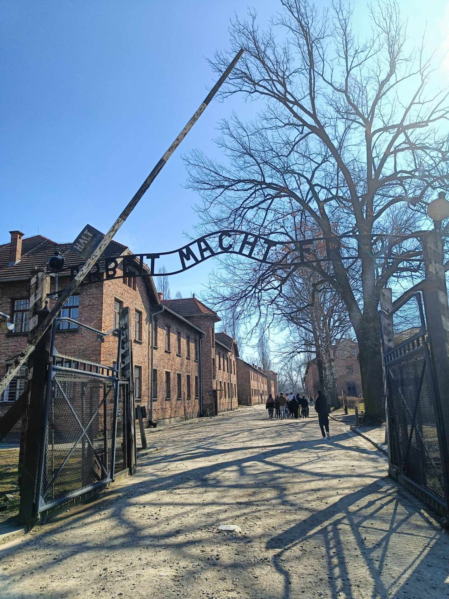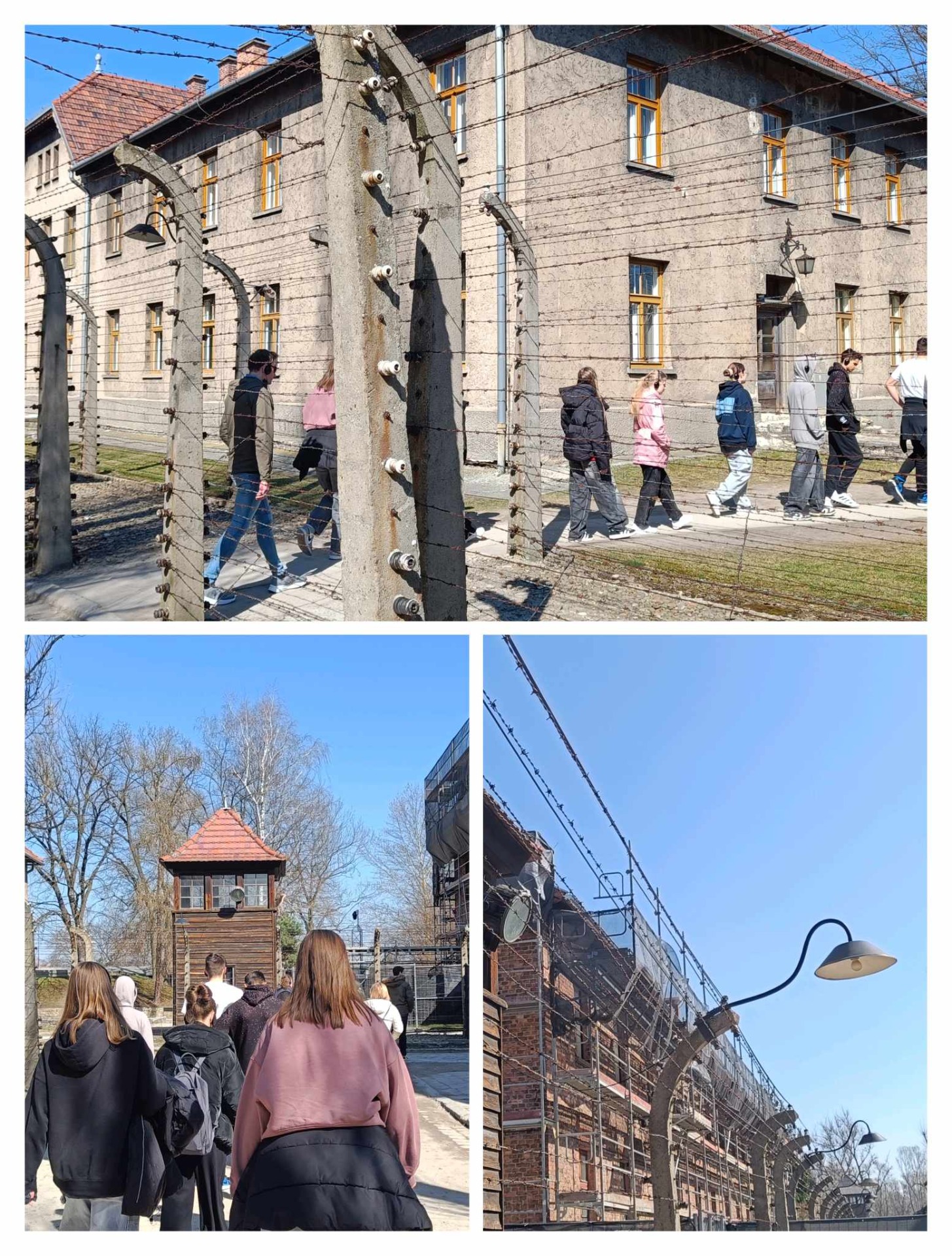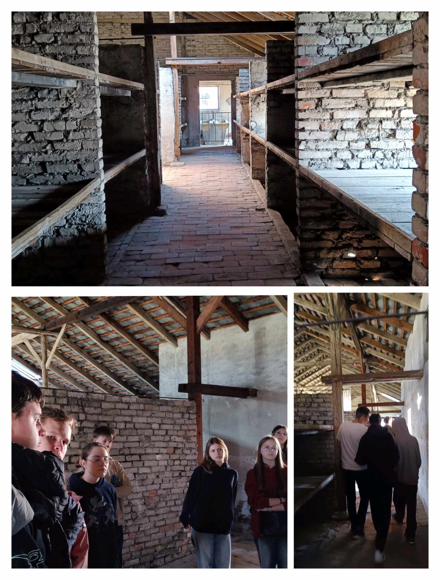 "Podobnie jak więźniowie przekroczyliśmy bramę z umiejscowionym nad nią napisem „ARBEIT MACHT FREI” (Praca czyni wolnym). Jest ona jednym z symboli obozu oraz cierpienia milionów istnień ludzkich. Przed nami ceglane baraki obozowe, w których obecnie znajdują się wystawy tematyczne. Dzięki pani edukator poznaliśmy w nich życie więźniów. Głód, eksperymenty medyczne, terror, nadludzka praca, choroby, egzekucje, komory gazowe, cyklon B – tego wszystkiego doświadczali przywożeni tutaj Polacy, Żydzi, Romowie oraz przedstawiciele innych nacji. Ze zdjęć zawieszonych na ścianach zerkały na nas osoby, które trafiły do tego „piekła”. Odebrano im wszystko, nawet imię i nazwisko zastępując obozowym numerem. Duże wrażenie zrobiły na nas sterty walizek, protez, misek, okularów oraz tysiące par butów.
