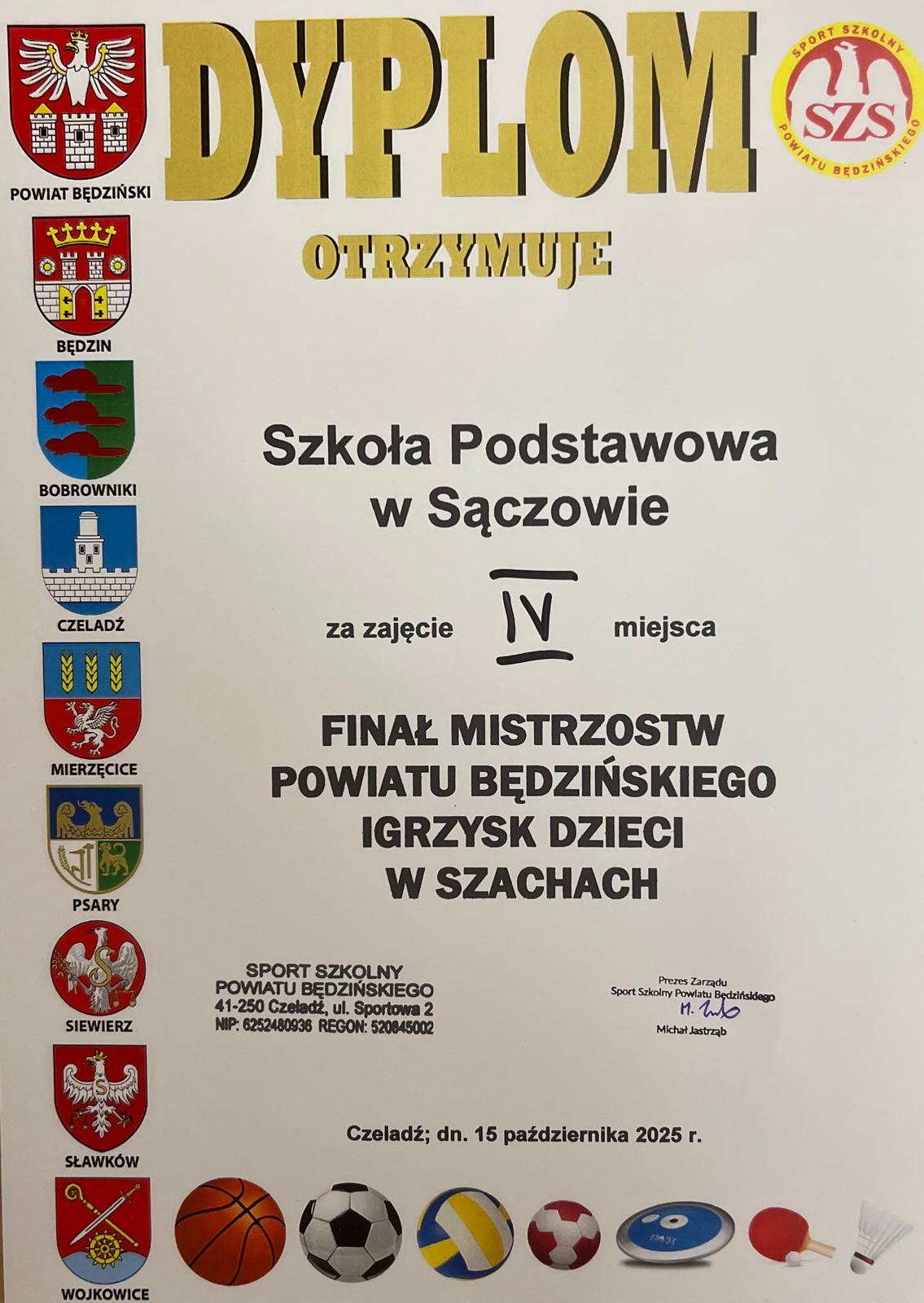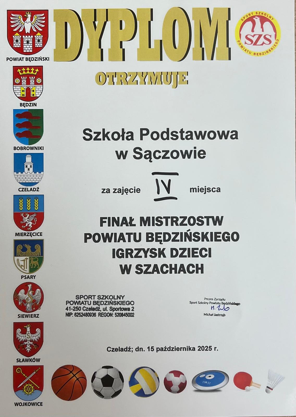 15 października 20125 r. szachiści z ZSP w Sączowie reprezentowali szkołę na Finale Mistrzostw Powiatu Będzińskiego Igrzysk Dzieci w Szachach w Czeladzi.