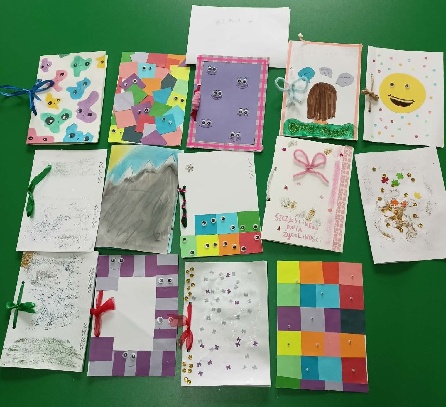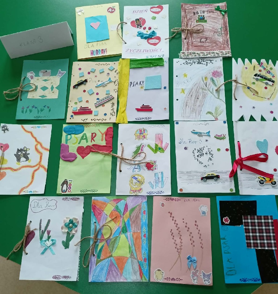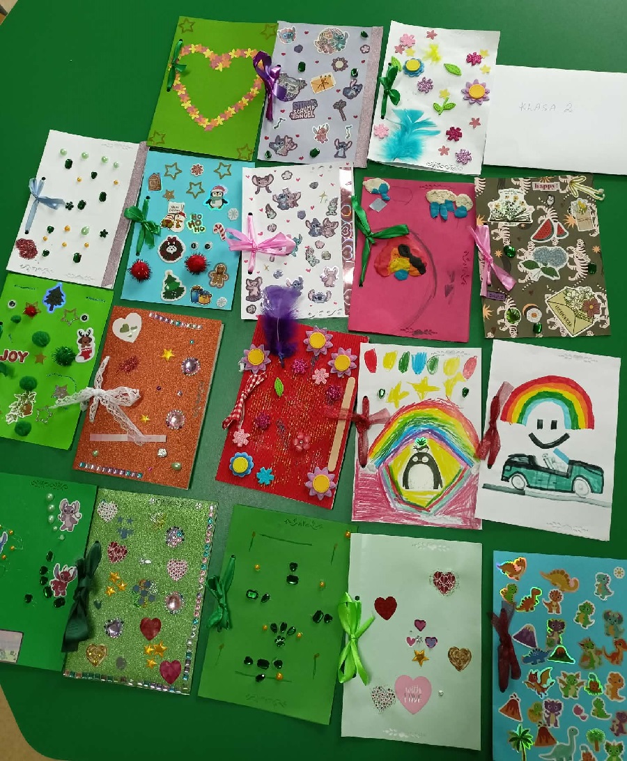 Uczniowie klas I–IV wykonali kartki okolicznościowe, które następnie zostały przekazane na zasadzie wymiany do Szkoły Podstawowej im. Jana Pawła II w Psarach. Była to piękna okazja do dzielenia się dobrym słowem i pozytywnymi emocjami z rówieśnikami z innej szkoły.