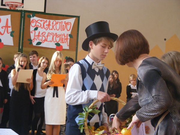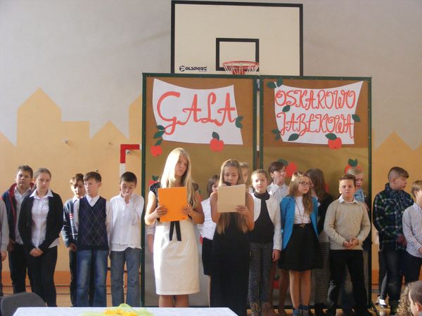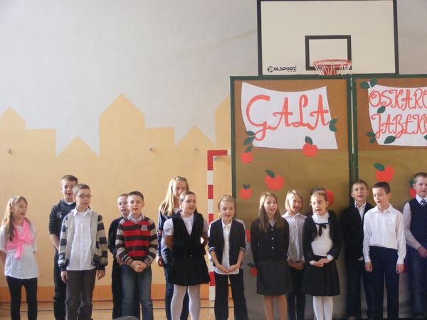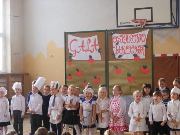 14 października, czyli dokładnie w Dniu Edukacji Narodowej, odbyła się w naszej szkole piękna akademia. W jej przygotowanie zaangażowali się wszyscy uczniowie pod czujnym okiem pań. Tradycyjnie już uroczystość rozpoczęła Pani Dyrektor, która przywitała wszystkich obecnych na sali, a następnie podziękowała nauczycielom i pracownikom obsługi i administracji za trud wkładany w wychowanie podopiecznych naszej placówki, za dbałość o sprawne funkcjonowanie szkoły oraz za sumienne wykonywanie powierzonych obowiązków. Po uroczystym wstępie rozpoczęła się gala oskarowo - jabłkowa, której laureatami zostali wszyscy pracownicy szkoły. Nie zapomniano o nikim! Poznaliśmy m.in. zwycięzców w kategorii plusik i minusik, muza młodych twórców, zaradna matka dyrektorka czy niebiańskie nutki. Nagrodami były dyplomy i pyszne jabłuszka, a całości dopełniły skoczne piosenki śpiewne przez nasze dzieciaki. Na koniec wystąpiła przewodnicząca Rady Rodziców, pani Izabela Stręk, która życzyła nauczycielom wszystkiego co najlepsze, spełnienia marzeń oraz satysfakcji z pracy. Jakby tego było mało, po akademii cała szkoła pojechała do kina. Klasy I-III na uroczą bajkę Kumba, a klasy IV-VI na film Percy Jackson – morze potworów. To był bardzo miły dzień, za co dziękujemy Pani Dyrektor, wszystkim nauczycielom, rodzicom i sobie samym, bo nieskromnie mówiąc byliśmy dziś bardzo grzeczni i ładnie wystąpiliśmy :)